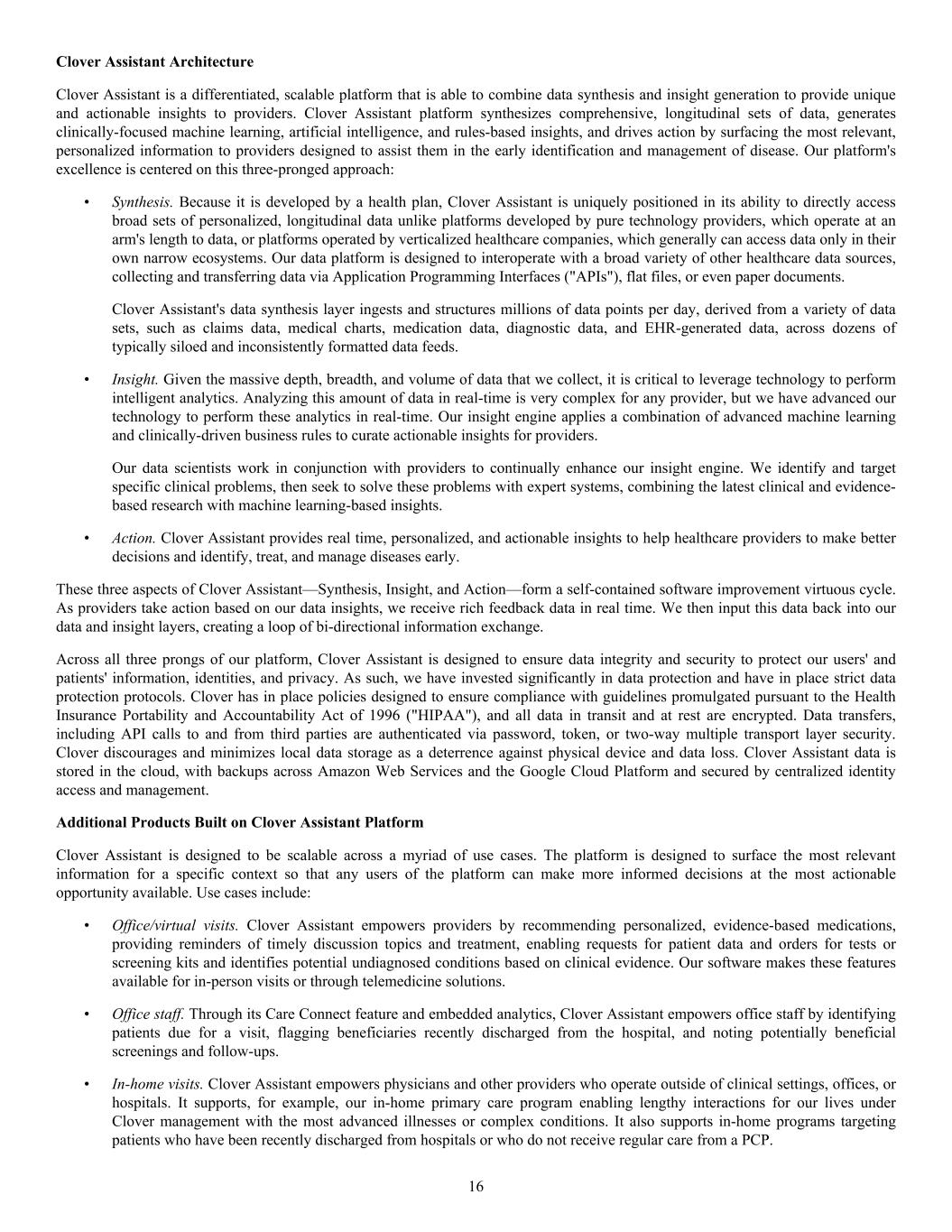 Clover Assistant架构Clover Assistant是一个差异化、可扩展的平台,能够结合数据合成和洞察力生成,为提供商提供独特且可操作的洞察力。Clover Assistant平台综合全面的纵向数据集,生成以临床为重点的机器学习、人工智能和基于规则的洞察力,并通过向旨在帮助他们早期识别和管理疾病的提供者提供最相关的个性化信息来推动行动。我们平台的卓越之处就集中在这三个方面:•综合。由于是由健康计划开发的,Clover Assistant具有独特的定位,它能够直接访问广泛的个性化纵向数据集,而不像纯粹的技术提供商开发的平台,后者与数据保持一定距离,或者由垂直医疗保健公司运营的平台,后者通常只能在自己狭窄的生态系统中访问数据。我们的数据平台旨在与各种各样的其他医疗保健数据源进行互操作,通过应用程序编程接口(“API”)、平面文件,甚至是纸质文档收集和传输数据。Clover Assistant的数据合成层每天摄取和构建数百万个数据点,这些数据点来自各种数据集,例如索赔数据、医疗图表、用药数据、诊断数据和EHR生成的数据,跨越数十个典型的孤立且格式不一致的数据馈送。•洞察力。鉴于我们收集的数据具有巨大的深度、广度和数量,利用技术进行智能分析至关重要。对任何提供商来说,实时分析这么多数据都非常复杂,但我们已经推进了实时执行这些分析的技术。我们的洞察力引擎将先进的机器学习和临床驱动的业务规则相结合,为提供商策划可操作的洞察力。我们的数据科学家与供应商合作,不断增强我们的洞察引擎。我们识别并瞄准特定的临床问题,然后寻求通过专家系统解决这些问题,将最新的临床和循证研究与基于机器学习的洞察力相结合。•行动。Clover Assistant提供实时、个性化和可操作的见解,帮助医疗保健提供者做出更好的决策,并及早识别、治疗和管理疾病。Clover Assistant的这三个方面—— Synthesis、Insight、Action ——形成了一个自成体系的软件改进良性循环。随着供应商根据我们的数据洞察力采取行动,我们会实时收到丰富的反馈数据。然后,我们将这些数据输入回我们的数据和洞察层,创建双向信息交换的循环。跨越我们平台的所有三个分支,三叶草助手旨在确保数据完整性和安全性,以保护我们用户和患者的信息、身份和隐私。因此,我们在数据保护方面进行了大量投资,并制定了严格的数据保护协议。Clover制定了旨在确保遵守根据1996年《健康保险携带和责任法案》(“HIPAA”)颁布的指导方针的政策,所有在途和静止数据都经过加密。数据传输,包括与第三方的API调用,通过密码、token或双向多传输层安全进行身份验证。Clover阻止并最大限度地减少本地数据存储,以此作为对物理设备和数据丢失的威慑。Clover Assistant数据存储在云端,可通过Amazon Web Services和Google Cloud Platform进行备份,并通过集中的身份访问和管理进行保护。基于Clover Assistant平台构建的其他产品Clover Assistant旨在跨无数用例进行可扩展。该平台旨在为特定上下文显示最相关的信息,以便该平台的任何用户都可以在最可行的机会做出更明智的决定。用例包括:•办公室/虚拟访问。Clover Assistant通过推荐个性化、循证用药、提供及时讨论主题和治疗的提醒、允许请求患者数据和测试或筛查试剂盒的订单以及根据临床证据识别潜在的未诊断疾病来增强提供者的能力。我们的软件使这些功能可用于亲自就诊或通过远程医疗解决方案。•办公室工作人员。通过其Care Connect功能和嵌入式分析,Clover Assistant通过识别到期就诊的患者、标记最近出院的受益人以及记录潜在有益的筛查和后续行动,为办公室工作人员提供支持。•入户探访。Clover Assistant为在临床环境、办公室或医院之外开展业务的医生和其他提供者提供支持。它支持, 例如,我们的居家初级保健计划使我们在三叶草管理下的生活能够与最严重的疾病或复杂情况进行长时间的互动。它还支持针对最近出院或没有接受五氯苯酚定期护理的患者的居家计划。16