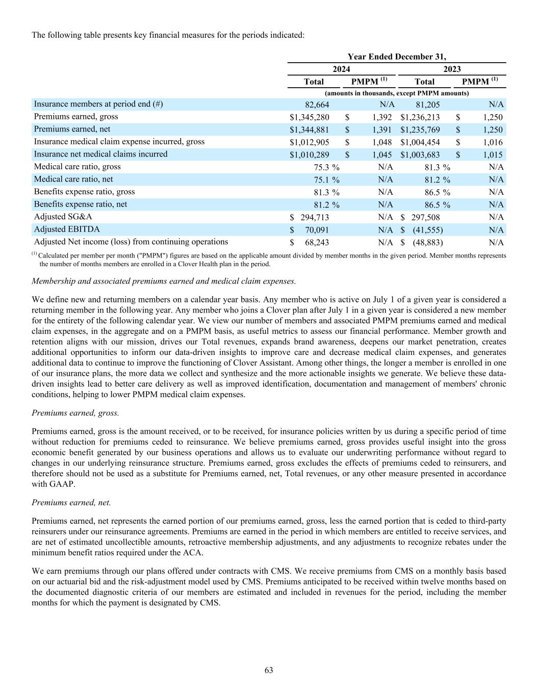 下表列出了所示期间的主要财务指标:截至2024年12月31日的年度2023 PMPM总额(1)PMPM总额(1)(以千为单位的金额,PMPM金额除外)期末保险会员(#)82,664不适用81,205不适用已赚保费,毛额1,345,280美元1,392美元1,236,213美元已赚保费1,250美元,净额1,344,881美元1,391美元1,235,769美元1,250美元保险医疗索赔费用,毛额1,012,905美元1,048美元1,004,454美元1,016保险净医疗索赔发生1,010,289美元1,045美元1,003,683美元1,015医疗保健比率,毛额75.3% N/A 81.3% N/A医疗保健比率,净额75.1% N/A 81.2% N/A福利费用率,毛额81.3% N/A 86.5% N/A福利费用率,净额81.2% N/A 86.5% N/A调整后SG & A $ 294,713 N/A $ 297,508 N/A调整后EBITDA $ 70,091 N/A $(41,555)N/A调整后持续经营净收入(亏损)$ 68,243 N/A $(48,883)N/A(1)按每个成员每月计算(“PMPM”)数字基于适用金额除以给定期间的成员月份。会员月份是指该期间会员参加Clover Health计划的月数。会员资格和相关保费收入以及医疗索赔费用。我们以日历年度为基础定义新成员和回归成员。任何在某一年的7月1日活跃的成员都被视为下一年的回归成员。在给定年份的7月1日之后加入Clover计划的任何成员,在下一个日历年的整个时间内都被视为新成员。我们将我们的会员数量以及相关的PMPM保费收入和医疗索赔费用(在汇总和PMPM基础上)视为评估我们财务业绩的有用指标。会员增长和保留符合我们的使命,推动我们的总收入,扩大品牌知名度,加深我们的市场渗透率,创造更多机会为我们的数据驱动洞察力提供信息,以改善护理和减少医疗索赔费用,并生成额外数据以继续改善Clover Assistant的功能。除其他事项外,会员加入我们的一项保险计划的时间越长,我们收集和综合的数据就越多,我们产生的可操作的见解就越多。我们相信,这些以数据为驱动的洞察力将带来更好的护理服务,并改善对成员慢性病的识别、记录和管理,有助于降低PMPM医疗索赔费用。已赚保费,毛额。已赚保费,毛额是我们在特定时期内为分给再保险的保费开具的保单收到或将收到的金额,不会减少。我们认为,已赚保费、毛额提供了对我们的业务运营所产生的总经济效益的有用洞察,并使我们能够评估我们的承保业绩,而不考虑我们基础再保险结构的变化。已赚保费、毛额不包括分给再保险公司的保费的影响,因此不应被用作已赚保费、净额、总收入或根据公认会计原则提出的任何其他衡量标准的替代品。已赚保费,净额。已赚保费净额代表我们已赚保费的已赚部分毛额减去根据我们的再保险协议分给第三方再保险公司的已赚部分。保费在会员有权获得服务的期间内赚取,并扣除估计无法收回的金额、追溯的会员调整以及根据ACA要求的最低福利比率确认回扣的任何调整。我们通过根据与CMS的合同提供的计划赚取保费。我们根据我们的精算投标和康哲药业使用的风险调整模型,每月从康哲药业收取保费。根据我们会员的书面诊断标准,预计在十二个月内收到的保费是估计的,并包含在该期间的收入中,包括CMS指定付款的会员月份。63