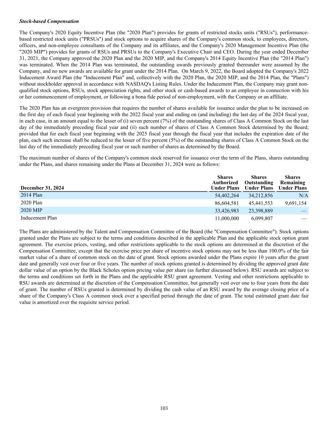 以股票为基础的薪酬公司2020年股权激励计划(“2020年计划”)规定向公司及其关联公司的员工、董事、高级职员和非雇员顾问授予限制性股票单位(“RSU”)、基于业绩的限制性股票单位(“PRSU”)和股票期权以收购公司普通股的股份,公司2020年管理层激励计划(“2020年MIP”)规定向公司执行主席和首席执行官授予RSU和PRSU。截至2021年12月31日止年度,公司批准了2020年计划和2020年MIP,公司2014年股权激励计划(“2014年计划”)终止。当2014年计划终止时,先前根据该计划授予的未偿奖励由公司承担,并且根据2014年计划没有新的奖励可供授予。2022年3月9日,董事会根据纳斯达克上市规则,未经股东批准,通过了公司的2022年诱导奖励计划(“诱导计划”,与2020年计划、2020年MIP和2014年计划合称“计划”)。根据诱导计划,公司可以向员工授予与其开始受雇相关的不合格股票期权、RSU、股票增值权以及其他基于股票或现金的奖励,或在与公司或关联公司的善意非受雇期间之后。2020年计划有一项常青条款,要求在自2022财政年度开始至2024财政年度最后一天(包括在内)结束的每个财政年度的第一天增加计划下可供发行的股份数量,在每种情况下,金额相当于(i)上一财政年度最后一天A类普通股已发行股份的百分之七(7%)和(ii)董事会确定的A类普通股股份数量中的较低者;条件是,对于从2025财政年度开始的每个财政年度,直至包括计划到期日的财政年度,每增加一股,须减至紧接上一财政年度最后一日A类普通股已发行股份的百分之五(5%)或董事会决定的股份数目中的较低者。截至2024年12月31日,在计划期限内预留发行的公司普通股股份、计划下已发行股份及计划下剩余股份的最高数量如下:2024年12月31日根据计划授权的股份计划下已发行股份计划下剩余股份计划2014年计划54,402,26434,212,856不适用2020年计划86,604,58145,441,5539,691,154 2020年计划33,426,98323,398,889 —诱导计划11,000,0006,099,807 —计划由董事会人才和薪酬委员会(“薪酬委员会”)管理。根据计划授予的股票期权受适用计划和适用的股票期权授予协议中所述条款和条件的约束。股票期权适用的行权价格、归属及其他限制由薪酬委员会酌情确定,但激励股票期权的每股行权价格不得低于授予日一股普通股公允市场价值的100.0%。根据这些计划授予的股票期权在授予日期后10年到期,通常在四年或五年内归属。授予的股票期权数量是通过将期权的批准授予日美元价值除以每股Black Scholes期权定价价值(如下文进一步讨论)确定的。受限制股份单位奖励受计划和适用的受限制股份单位授予协议中规定的条款和条件的约束。归属及适用于受限制股份单位奖励的其他限制由薪酬委员会酌情决定,但一般在授出日期起计一至四年内归属。授予的受限制股份单位数量是通过将受限制股份单位奖励的现金价值除以公司A类普通股在特定时期内直至授予日的平均收盘价确定的。预计授予日公允价值总额按规定服务期摊销。103