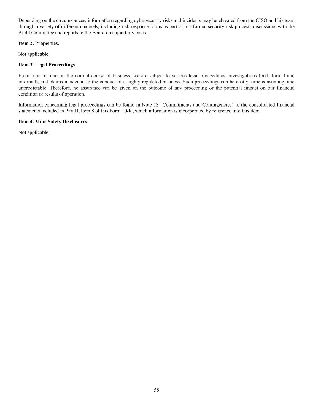 视情况而定,有关网络安全风险和事件的信息可能会通过各种不同渠道从CISO及其团队那里获得,包括作为我们正式安全风险流程一部分的风险应对表格、与审计委员会的讨论以及每季度向董事会提交报告。项目2。属性。不适用。项目3。法律程序。在正常业务过程中,我们不时受到各种法律诉讼、调查(正式和非正式),以及在进行高度监管的业务时附带的索赔。这类诉讼程序可能代价高昂、耗时且不可预测。因此,无法就任何程序的结果或对我们的财务状况或经营业绩的潜在影响作出保证。有关法律诉讼的信息可在本10-K表第二部分第8项所包含的合并财务报表附注13“承诺和或有事项”中找到,该信息通过引用并入本项目。项目4。矿山安全披露。不适用。58