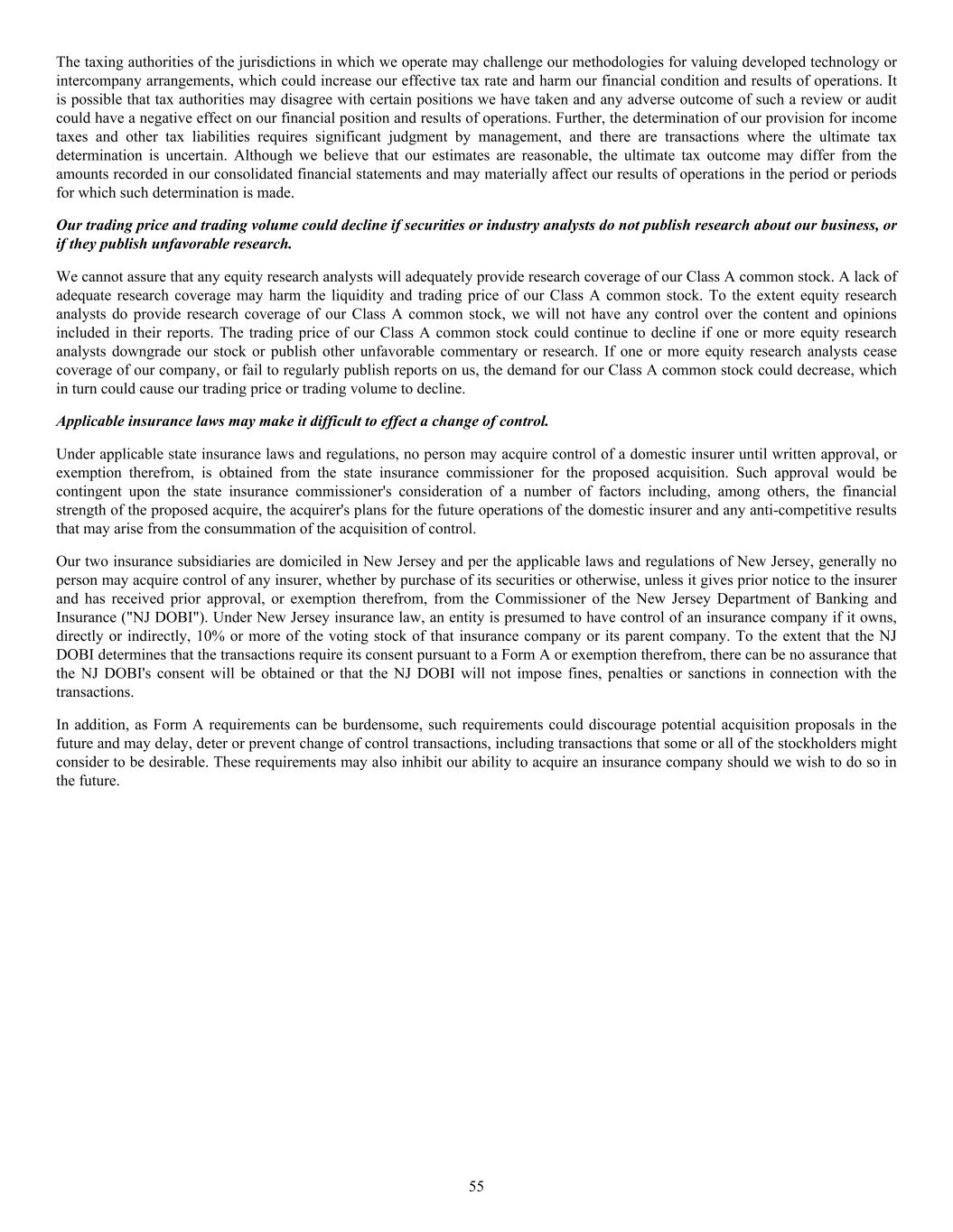 我们经营所在司法管辖区的税务当局可能会挑战我们评估已开发技术或公司间安排的方法,这可能会增加我们的有效税率并损害我们的财务状况和经营业绩。税务机关可能不同意我们采取的某些立场,这种审查或审计的任何不利结果都可能对我们的财务状况和经营业绩产生负面影响。此外,我们的所得税和其他税务负债拨备的确定需要管理层的重大判断,存在最终税务确定不确定的交易。尽管我们认为我们的估计是合理的,但最终的税务结果可能与我们合并财务报表中记录的金额不同,并可能对我们在作出此类确定的一个或多个期间的经营业绩产生重大影响。如果证券或行业分析师不发布关于我们业务的研究报告,或者他们发布不利的研究报告,我们的交易价格和交易量可能会下降。我们无法保证任何股票研究分析师将充分提供我们A类普通股的研究覆盖。缺乏足够的研究覆盖可能会损害我们A类普通股的流动性和交易价格。如果股票研究分析师确实提供了我们A类普通股的研究覆盖范围,我们将无法控制他们报告中包含的内容和观点。如果一名或多名股票研究分析师下调我们的股票评级或发表其他不利评论或研究,我们A类普通股的交易价格可能会继续下降。如果一名或多名股票研究分析师停止对我们公司的覆盖,或未能定期发布关于我们的报告,对我们的A类普通股的需求可能会减少,进而可能导致我们的交易价格或交易量下降。适用的保险法可能难以实现控制权变更。根据适用的州保险法律法规,在就拟议收购获得州保险专员的书面批准或豁免之前,任何人不得获得国内保险公司的控制权。此类批准将取决于州保险专员对多项因素的考虑,其中包括拟议收购的资金实力、收购方对国内保险公司未来运营的计划以及完成控制权收购可能产生的任何反竞争结果。我们的两家保险子公司的住所位于新泽西州,根据新泽西州的适用法律法规,一般任何人不得通过购买其证券或其他方式获得任何保险公司的控制权,除非该公司事先通知保险人并已获得新泽西州银行和保险部(“NJ DOBI”)专员的事先批准或豁免。根据新泽西州保险法,如果一个实体直接或间接拥有该保险公司或其母公司10%或更多的有表决权股票,则该实体被推定拥有该保险公司的控制权。如果NJ DOBI确定交易需要其根据表格A的同意或豁免,则无法保证将获得NJ DOBI的同意或NJ DOBI不会对交易施加罚款、处罚或制裁。此外,由于表格A的要求可能会带来负担,此类要求可能会阻止未来潜在的收购提议,并可能会延迟、阻止或阻止控制权交易的变更,包括部分或全部股东可能认为可取的交易。这些要求也可能会抑制我们收购保险公司的能力,如果我们希望在未来这样做的话。55