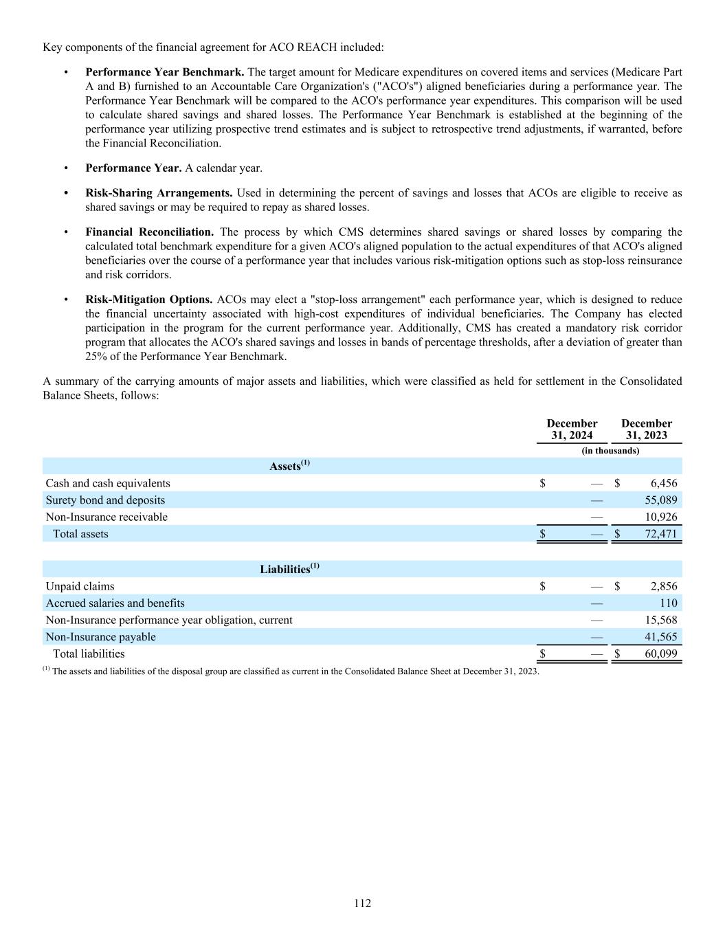ACO REACH财务协议的关键组成部分包括:•绩效年度基准。在绩效年度内向责任关怀组织(“ACO”)的一致受益人提供的涵盖项目和服务(Medicare A和B部分)的医疗保险支出的目标金额。绩效年度基准将与ACO的绩效年度支出进行比较。这种比较将用于计算共享储蓄和共享损失。业绩年度基准是在业绩年度开始时利用预期趋势估计建立的,如果有必要,可在财务和解之前进行追溯趋势调整。•业绩年度。一个日历年。•风险分担安排。用于确定ACO有资格作为共享储蓄获得或可能被要求作为共享损失偿还的储蓄和损失的百分比。•财务和解。CMS通过将给定ACO调整后人群的计算总基准支出与该ACO调整后受益人在包括止损再保险和风险走廊等各种风险缓解选项的绩效年度期间的实际支出进行比较,确定共享储蓄或共享损失的过程。•风险缓释选项。ACOs可能会在每个业绩年度选择“止损安排”,该安排旨在减少与个别受益人的高成本支出相关的财务不确定性。公司已选择参与本业绩年度的计划。此外,CMS还创建了一项强制性风险走廊计划,在偏离业绩年度基准的25%以上后,按百分比阈值区间分配ACO的共享储蓄和损失。合并资产负债表中分类为持有待结算的主要资产和负债的账面金额汇总如下:2024年12月31日2023年12月31日(单位:千)资产(1)现金和现金等价物$ — 6,456美元担保债券和存款— 55,089非保险应收款— 10,926总资产$ — 72,471美元负债(1)未付索赔$ — 2,856美元应计工资和福利— 110非保险履约年度债务,流动— 15,568非保险应付款— 41,565总负债$ — 60,099美元(1)处置集团的资产和负债在2023年12月31日的合并资产负债表中归类为流动。112