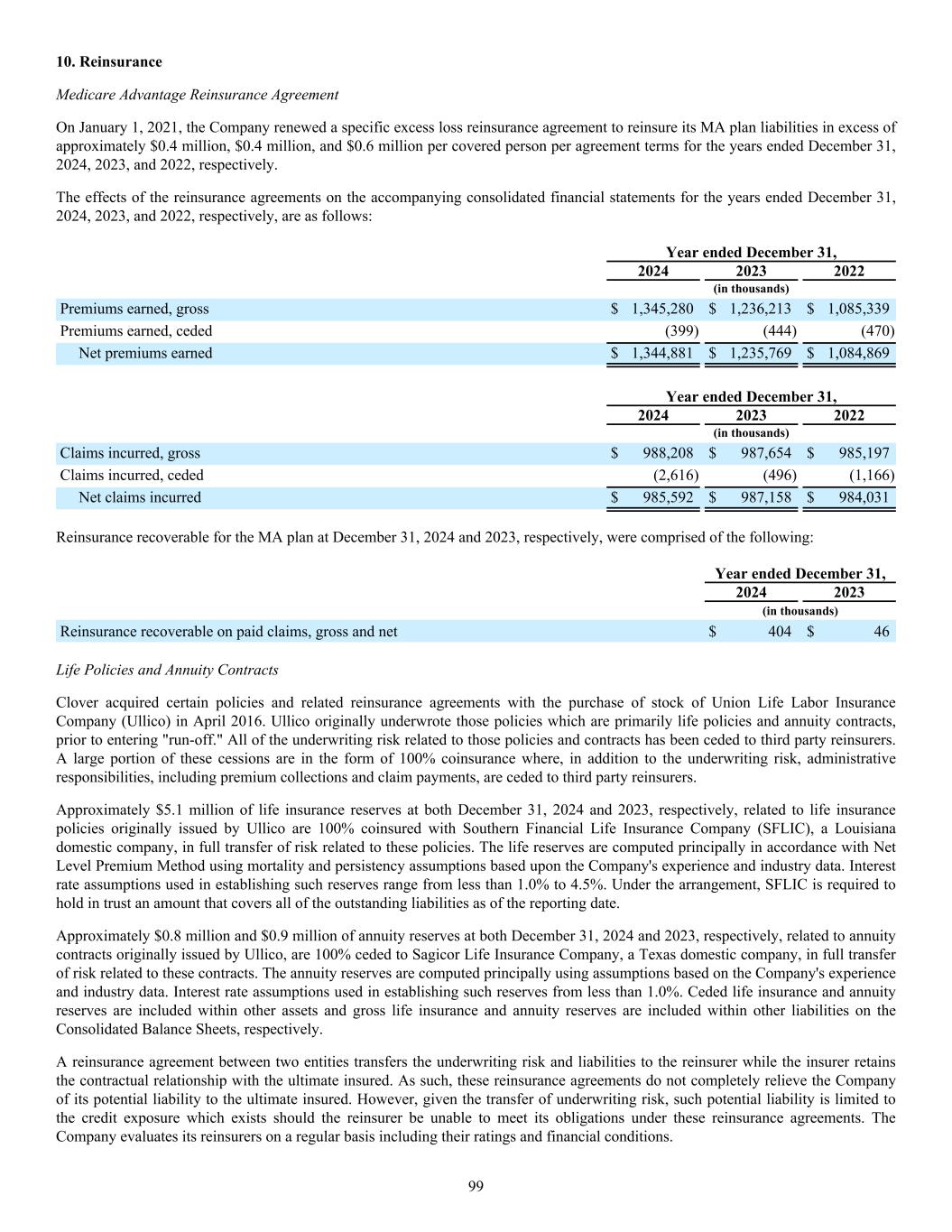 10.再保险Medicare Advantage再保险协议于2021年1月1日,公司续签了一份特定的超额损失再保险协议,为截至2024年12月31日、2024年、2023年和2022年12月31日止年度的MA计划负债再保险,每个协议条款每个受保人分别超过约0.4百万美元、0.4百万美元和0.6百万美元。再保险协议对所附截至2024年12月31日、2023年和2022年12月31日止年度合并财务报表的影响分别如下:截至2024年12月31日止年度20232022(单位:千)已赚保费,毛额1,345,280美元1,236,213美元已赚保费1,085,339美元,分出(399)(444)(470)已赚净保费1,344,881美元1,235,769美元1,084,869美元截至2024年12月31日止年度20232022(单位:千)已发生索赔,毛额988,208美元987,654美元985,197已发生索赔,分出(2,616)(496)(1,166)发生的净索赔985,592美元987,158美元分别于2024年12月31日和2023年12月31日为MA计划可收回的984,031美元再保险包括:截至2024年12月31日止年度2023年(以千为单位)已付索赔可收回的再保险,毛额和净额404美元46美元的人寿保单和年金合同Clover于2016年4月通过购买Union Life Labor Insurance Company(Ullico)的股票获得了某些保单和相关的再保险协议。Ullico最初承保的保单主要是人寿保单和年金合同,在进入“决选”之前。所有与这些保单和合同相关的承保风险都已让渡给第三方再保险公司。这些分保中有很大一部分是以100%共保的形式,除了承保风险外,还将包括保费收取和索赔支付在内的行政责任分给第三方再保险人。分别于2024年12月31日和2023年12月31日与Ullico最初签发的人寿保险保单相关的约510万美元人寿保险准备金与路易斯安那州国内公司Southern Financial Life Insurance Company(SFLIC)100%共同投保,以全额转移与这些保单相关的风险。生命储备主要按照净水平保费法计算,使用基于公司经验和行业数据的死亡率和持久性假设。建立这类准备金时使用的利率假设范围从低于1.0%到4.5%不等。根据该安排,SFLIC必须以信托方式持有的金额涵盖截至报告日的所有未偿负债。分别于2024年12月31日和2023年12月31日与Ullico最初发行的年金合同相关的约80万美元和90万美元的年金准备金,将100%分给德克萨斯州国内公司Sagicor Life Insurance Company,以完全转移与这些合同相关的风险。年金准备金的计算主要使用基于公司经验和行业数据的假设。从低于1.0%建立这类准备金时使用的利率假设。分出寿险和年金准备金分别计入其他资产,寿险和年金准备金总额分别计入合并资产负债表的其他负债。两个主体之间的再保险协议将承保风险和责任转移给再保险人,而保险人保留与最终被保险人的合同关系。因此,这些再保险协议并不能完全免除公司对最终被保险人的潜在责任。然而,鉴于承保风险的转移,此类潜在责任仅限于在再保险人无法履行其在这些再保险协议下的义务时存在的信用风险。该公司定期评估其再保险公司,包括其评级和财务状况。99