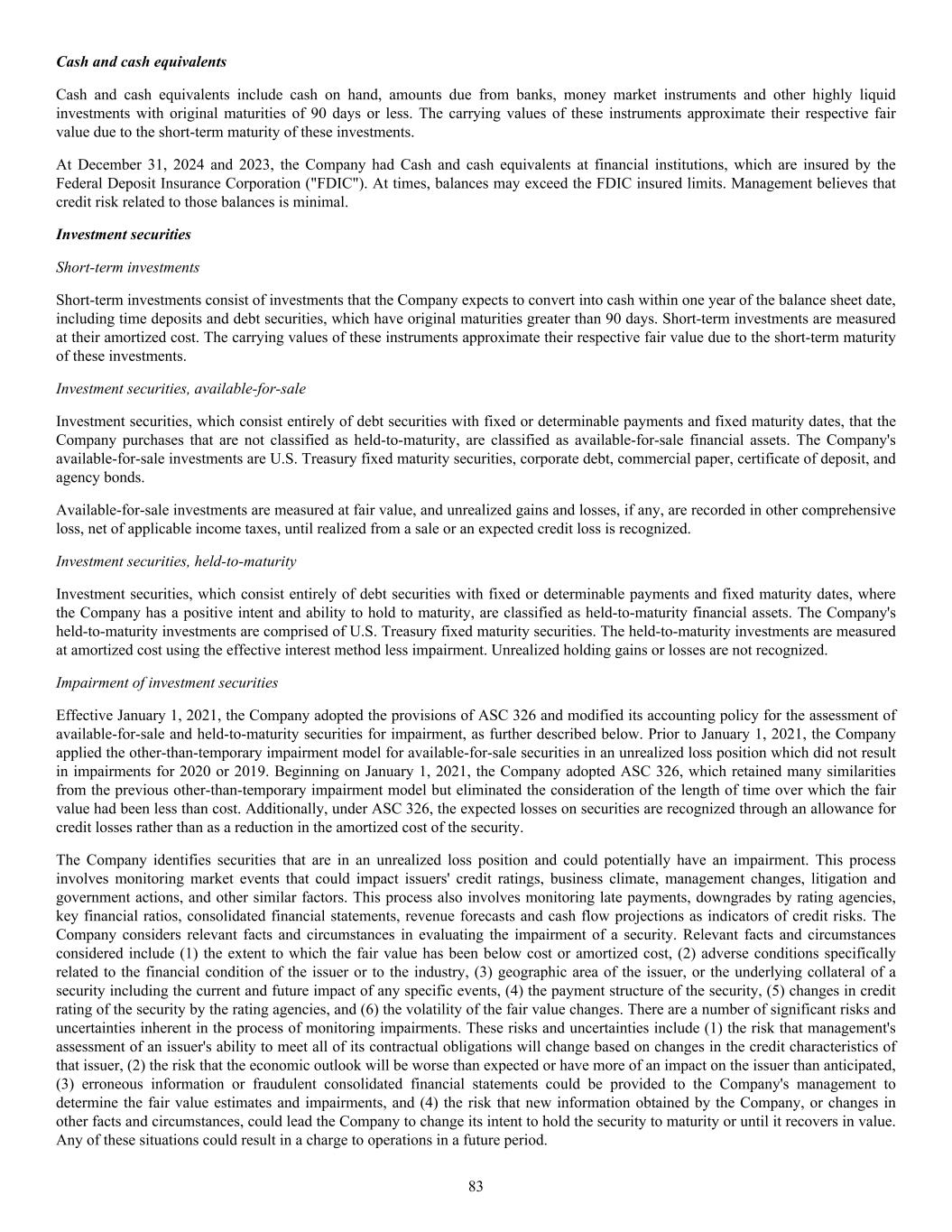 现金及现金等价物现金及现金等价物包括库存现金、应收银行款项、货币市场工具和其他原到期日为90天或更短的高流动性投资。由于这些投资的短期到期,这些工具的账面价值接近其各自的公允价值。在2024年12月31日和2023年12月31日,公司在金融机构拥有现金和现金等价物,这些现金和现金等价物由联邦存款保险公司(“FDIC”)投保。有时,余额可能会超过FDIC的受保限额。管理层认为,与这些余额相关的信用风险很小。投资证券短期投资短期投资是指公司预计在资产负债表日起一年内转换为现金的投资,包括原期限大于90天的定期存款和债务证券。短期投资按摊余成本计量。由于这些投资的短期到期,这些工具的账面价值接近其各自的公允价值。投资证券、可供出售投资证券,完全由公司购买的未分类为持有至到期的具有固定或可确定的付款和固定到期日的债务证券构成,分类为可供出售金融资产。公司可供出售的投资有美国国债固定期限证券、公司债、商业票据、存单、机构债等。可供出售投资按公允价值计量,未实现损益(如有)在扣除适用所得税后记入其他综合损失,直至确认从出售或预期信用损失中实现。投资证券、持有至到期投资证券,完全由公司具有积极持有到期意向和持有到期能力的有固定或可确定偿付、有固定到期日的债务证券构成,分类为持有至到期金融资产。该公司持有至到期投资由美国国债固定期限证券组成。持有至到期投资采用实际利率法摊余成本减减值计量。未实现的持有损益不予确认。投资证券减值自2021年1月1日起,公司采纳了ASC 326的规定,并修改了可供出售和持有至到期证券减值评估的会计政策,具体如下。在2021年1月1日之前,公司对处于未实现亏损状态且未导致2020或2019年减值的可供出售证券应用非临时减值模型。从2021年1月1日开始,公司采用了ASC 326,保留了与之前非暂时性减值模型的许多相似之处,但消除了公允价值低于成本的时间长度的考虑。此外,根据ASC 326,证券的预期损失通过信用损失准备金确认,而不是作为证券摊余成本的减少确认。该公司确定了处于未实现亏损状态并可能存在减值的证券。这一过程涉及监测可能影响发行人信用评级、商业环境、管理层变动、诉讼和政府行为以及其他类似因素的市场事件。这一过程还涉及监测逾期付款、评级机构下调评级、关键财务比率、合并财务报表、收入预测和现金流量预测,作为信用风险的指标。公司在评估证券减值时会考虑相关事实和情况。考虑的相关事实和情形包括(1)公允价值一直低于成本或摊余成本的程度,(2)与发行人的财务状况或与行业具体相关的不利条件,(3)发行人的地理区域,或证券的基础担保物,包括任何特定事件的当前和未来影响,(4)证券的支付结构,(5)评级机构对证券的信用评级变化,以及(6)公允价值的波动性变化。在监测减值过程中,存在若干内在的重大风险和不确定性。这些风险和不确定性包括(1)管理层对发行人履行其所有合同义务的能力的评估将基于该发行人信用特征的变化而发生变化的风险,(2)经济前景将比预期更差或对发行人的影响比预期更大的风险, (3)可能向公司管理层提供错误信息或欺诈性合并财务报表以确定公允价值估计和减值,以及(4)公司获得的新信息,或其他事实和情况的变化,可能导致公司改变其持有该证券到期或直至其价值恢复的意图的风险。这些情况中的任何一种都可能导致对未来一段时期的运营收费。83