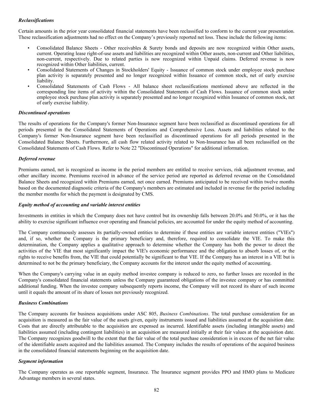 重新分类上一年度合并财务报表中的某些金额已重新分类,以符合本年度的列报方式。这些重新分类调整对公司先前报告的净亏损没有影响。其中包括以下项目:•合并资产负债表-其他应收款和担保债券和存款现在在其他资产中确认,流动。经营租赁使用权资产和负债分别在其他资产、非流动和其他负债、非流动项下确认。应付关联方款项现在未付债权内确认。递延收入现在其他负债、流动项下确认。•合并股东权益变动表-根据员工股票购买计划活动发行普通股单独列报,不再在发行普通股中确认,扣除提前行使负债。•合并现金流量表-上述所有资产负债表的重新分类均反映在合并现金流量表的相应活动细目中。根据员工股票购买计划活动发行普通股单独列报,不再在发行普通股中确认,扣除提前行权负债。终止经营公司前非保险分部的经营业绩已在综合经营和综合亏损报表中列报的所有期间重新分类为终止经营。与公司前非保险分部相关的资产和负债已在合并资产负债表中列报的所有期间重新分类为已终止经营业务。此外,所有与非保险相关的现金流相关活动均已在合并现金流量表中重新分类。有关更多信息,请参阅附注22“已终止运营”。递延收入赚取的保费,净额在会员有权获得服务、风险调整收入、其他辅助收入期间确认为收入。在服务期之前收到的保费在合并资产负债表上报告为递延收入,并在已赚保费中确认,一旦赚到净额。根据公司会员的书面诊断标准,预计在十二个月内收到的保费是估计的,并计入该期间的收入,包括CMS指定付款的会员月份。权益法会计法和可变利益实体对公司不具有控制权但其所有权落在20.0%至50.0%之间的实体的投资,或其有能力对经营和财务政策施加重大影响的投资,按权益会计法进行会计处理。公司不断评估其部分拥有的实体,以确定这些实体是否是可变利益实体(“VIE”),如果是,公司是否是主要受益人,因此需要合并VIE。为做出这一决定,公司采用定性方法来确定公司是否既有权力指导对VIE经济绩效产生最重大影响的VIE活动,也有义务吸收可能对该VIE具有重大意义的VIE的损失或从中获得利益的权利。如果公司在VIE中拥有权益,但被确定为不是主要受益人,公司将根据权益会计法对该权益进行会计处理。当公司在权益法被投资公司的账面价值减至零时,除非公司为被投资公司的债务提供担保或已承诺追加资金,否则不再在公司合并财务报表中记录亏损。当被投资公司随后报告收入时,公司将不会记录其在该收入中的份额,直到其等于其先前未确认的损失份额的金额。业务合并该公司在ASC 805下对业务收购进行会计处理,业务合并。一项收购的总收购对价以所给予资产的公允价值计量, 收购日发行的权益工具和承担的负债。直接归属于收购的成本在发生时计入费用。收购中可辨认资产(包括无形资产)和承担的负债(包括或有负债)按收购日的公允价值进行初始计量。公司确认商誉的范围是购买总对价的公允价值超过所取得的可辨认资产和承担的负债的公允价值净值。公司将收购业务的经营成果计入自收购日开始的合并财务报表。分部信息本公司作为一个可报告分部经营,保险。保险部门向多个州的Medicare Advantage成员提供OPPO和HMO计划。82