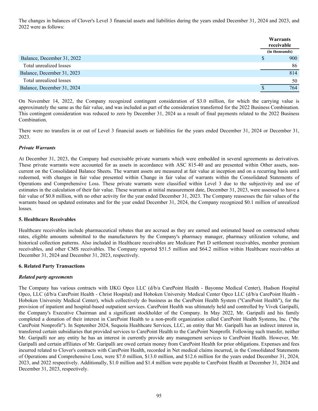 Clover的Level3金融资产和负债在截至2024年12月31日和2023年以及2022年12月31日止年度的余额变动情况如下:应收认股权证(千)余额,2022年12月31日900美元未实现亏损总额86余额,2023年12月31日814未实现亏损总额50余额,2024年12月31日764美元2022年11月14日,公司确认或有对价300万美元,账面价值与公允价值大致相同,并作为2022年业务合并转让对价的一部分计入。由于与2022年业务合并相关的最终付款,这一或有对价在2024年12月31日前降为零。截至2024年12月31日或2023年12月31日止年度,并无转入或转出第3级金融资产或负债。私募认股权证于2023年12月31日,公司有可行使的私募认股权证作为衍生工具嵌入若干协议中。这些私募认股权证是根据ASC 815-40作为资产入账的,并在其他资产中列报,在合并资产负债表上是非流动的。认股权证资产在开始时按公允价值计量,并在赎回前按经常性基准计量,公允价值变动在综合经营和综合损失报表的认股权证公允价值变动中列报。这些私人认股权证因其公允价值计算的主观性和使用估计而被划入第3级。这些认股权证在初步计量日期2023年12月31日经评估公允价值为0.8百万美元,截至2023年12月31日止年度没有其他活动。公司根据更新后的估计重新评估认股权证的公允价值,截至2024年12月31日止年度,公司确认了10万美元的未实现亏损。5.医疗保健应收款医疗保健应收款包括在赚取时计提的药品回扣,并根据合同规定的返点率、公司药房经理提交给制造商的合格金额、药房使用率和历史收款模式进行估计。医疗保健应收款中还包括医疗保险D部分结算应收款、会员保费应收款以及其他CMS应收款。该公司在2024年12月31日和2023年12月31日分别报告了5150万美元和6420万美元的医疗保健应收账款。6.关联交易关联方协议公司与IJKG Opco LLC(d/b/a CarePoint Health-Bayonne Medical Center)、Hudson Hospital Opco,LLC(d/b/a CarePoint Health-Christ Hospital)和Hoboken University Medical Center Opco LLC(d/b/a CarePoint Health-Hoboken University Medical Center)共同作为CarePoint Health System(“CarePoint Health”)开展业务,提供住院和以医院为基础的门诊服务。CarePoint Health最终由公司执行主席、公司重要股东Vivek Garipalli持有和控制。2022年5月,Garipalli先生和他的家人完成了将他们在CarePoint Health的权益捐赠给一家名为CarePoint Health Systems,Inc.(“CarePoint Nonprofit”)的非营利组织。2024年9月,Garipalli先生间接拥有权益的实体Sequoia Healthcare Services,LLC将为CarePoint Health提供服务的某些子公司转让给CarePoint NonProfit。在这种转移之后,Garipalli先生和他目前感兴趣的任何实体都没有向CarePoint Health提供任何管理服务。然而,Garipalli先生和Garipalli先生的某些关联公司被CarePoint Health拖欠一定的款项,用于先前的义务。截至2024年、2023年和2022年12月31日止年度,与Clover与CarePoint Health的合同相关的费用和费用分别为700万美元、1300万美元和1260万美元,这些费用和费用记录在合并运营和综合损失报表的净医疗索赔中。此外,分别于2024年12月31日和2023年12月31日向CarePoint Health支付了100万美元和140万美元。95
