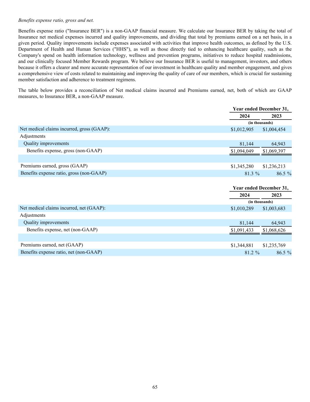 福利费用率,毛额和净额。福利费用率(benefits expense ratio,简称“保险BER”)是一种非GAAP财务指标。我们计算我们的保险BER的方法是,在给定的时期内,将发生的保险净医疗费用和质量改进的总和,并将该总和除以按净额赚取的保费。质量改进包括与美国卫生与公众服务部(“HHS”)定义的改善健康结果的活动相关的费用,以及与提高医疗质量直接相关的费用,例如公司在健康信息技术、健康和预防计划方面的支出,减少再入院的举措,以及我们以临床为重点的会员奖励计划。我们相信我们的保险BER对管理层、投资者和其他人有用,因为它更清晰、更准确地反映了我们在医疗质量和会员参与方面的投资,并提供了与维持和提高会员护理质量相关的成本的全面看法,这对于维持会员满意度和遵守治疗方案至关重要。下表提供了发生的医疗索赔净额和已赚取的保费净额的对账,两者都是GAAP衡量标准,与非GAAP衡量标准保险BER的对账。截至2024年12月31日止年度2023年(单位:千)发生的医疗索赔净额,毛额(GAAP):1,012,905美元1,004,454美元调整质量改进81,14464,943福利费用毛额(Non-GAAP)1,094,049美元1,069,397美元已赚保费毛额(GAAP)1,345,280美元1,236,213美元福利费用率毛额(Non-GAAP)81.3% 86.5%截至2024年12月31日止年度2023年(单位:千美元)发生的医疗索赔净额(GAAP):1,010,289美元1,003,683美元调整质量改进81,14464,943福利费用净额(Non-GAAP)1,091,433美元1,068,626美元已赚保费净额(GAAP)1,344,881