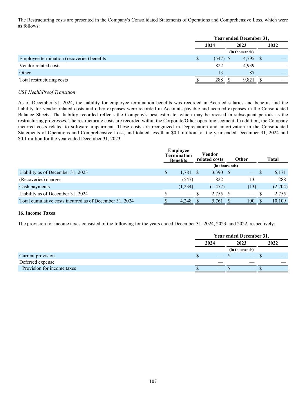 重组成本在公司的合并经营和综合亏损报表中列报,如下:截至2024年12月31日止年度202320232022(单位:千)员工解雇(追偿)福利$(547)$ 4,795 $ —供应商相关成本8224,939 —其他1387 —重组总成本$ 288 $ 9,821 $ —截至2024年12月31日,UST HealthProof Transition,雇员解雇福利负债记入应计工资和福利,供应商相关成本和其他费用负债记入综合资产负债表的应付账款和应计费用。记录的负债反映了公司的最佳估计,可能会随着重组的进展在后续期间进行修正。重组成本记入企业/其他经营分部。此外,公司产生了与软件减值相关的成本。这些成本在综合经营和综合亏损报表的折旧和摊销中确认,截至2024年12月31日止年度总计不到10万美元,截至2023年12月31日止年度总计不到10万美元。雇员解雇福利供应商相关成本截至2023年12月31日的其他总负债(以千为单位)1781美元3390美元— 5171美元(追回)费用(547)82213288现金支付(1234)(1457)(13)(2704)截至2024年12月31日的负债$ — 2755美元— 2755美元截至2024年12月31日发生的累计总成本4248美元5761美元100美元10,10916。所得税所得税拨备分别包括截至2024年12月31日、2023年和2022年12月31日止年度的以下各项:截至2024年12月31日止年度20232022(单位:千)当期拨备$ — $ — $ —递延费用————所得税拨备$ — $ — $ — 107