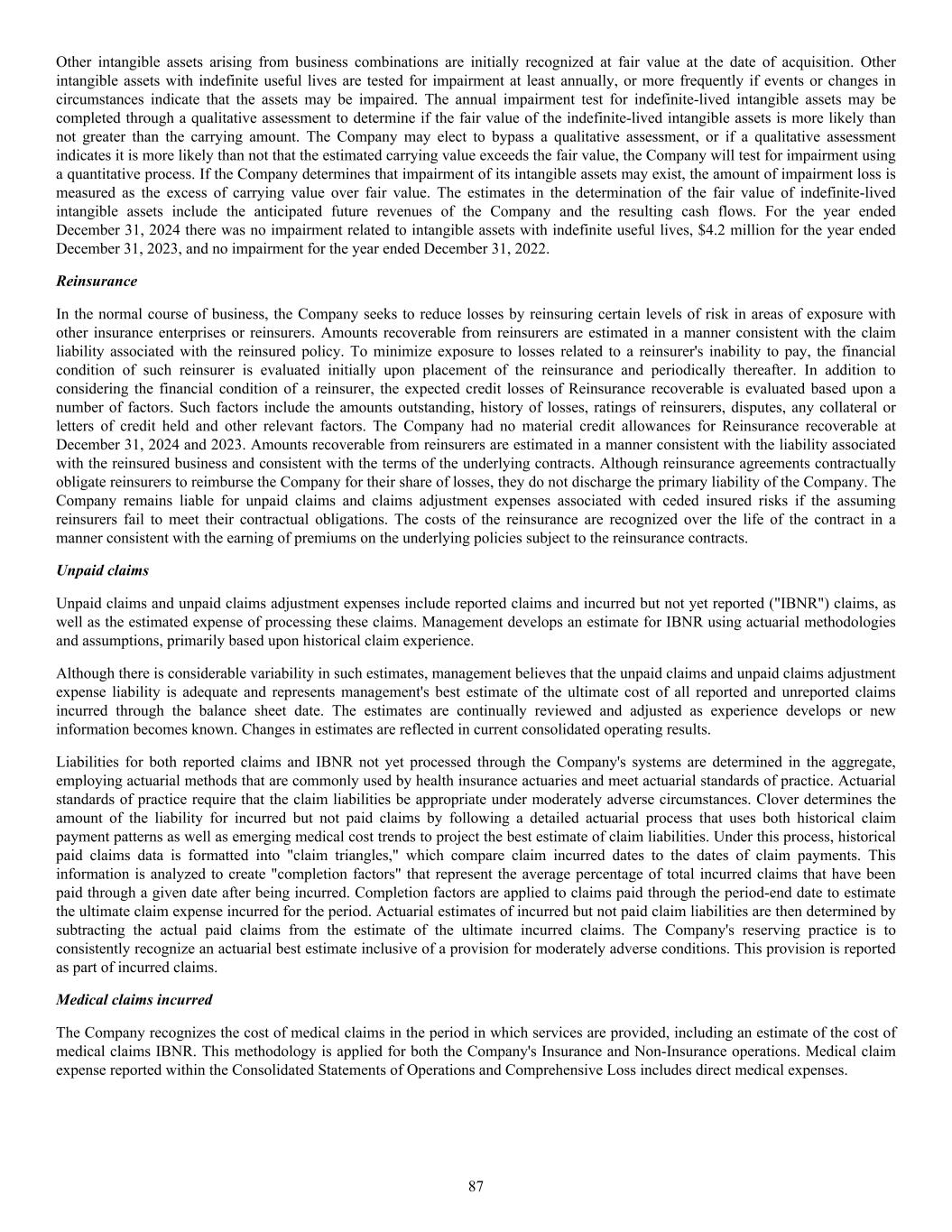 企业合并产生的其他无形资产在取得日按公允价值进行初始确认。其他使用寿命不确定的无形资产至少每年进行一次减值测试,如果事件或情况变化表明该资产可能发生减值,则更频繁地进行减值测试。对无限期无形资产的年度减值测试可通过定性评估完成,以确定无限期无形资产的公允价值是否很可能大于账面值。公司可能会选择绕过定性评估,或者如果定性评估表明估计账面价值超过公允价值的可能性很大,公司将使用定量过程进行减值测试。如果公司确定其无形资产可能存在减值,则减值损失金额按账面价值超过公允价值的部分计量。确定无限期无形资产公允价值时的估计数包括公司未来的预期收入和由此产生的现金流量。截至2024年12月31日止年度,没有与使用寿命不确定的无形资产相关的减值,截至2023年12月31日止年度为420万美元,截至2022年12月31日止年度没有减值。再保险在正常经营过程中,本公司通过与其他保险企业或再保险公司在风险敞口领域对一定程度的风险进行再保险,以求减少损失。可从再保险公司收回的金额按照与再保险保单相关的索赔责任相一致的方式进行估计。为尽量减少与再保险公司无力支付相关的损失风险,该再保险公司的财务状况在安置再保险时进行初始评估,此后定期进行评估。除了考虑再保险人的财务状况外,再保险可追回的预期信用损失是根据多个因素进行评估的。这些因素包括未偿金额、损失历史、再保险公司的评级、纠纷、持有的任何抵押品或信用证以及其他相关因素。公司在2024年12月31日和2023年12月31日没有可收回的再保险重大信用备抵。可从再保险公司收回的金额的估计方式与与再保险业务相关的负债一致,并与基础合同的条款一致。尽管再保险协议在合同上规定再保险公司有义务向公司赔偿其分担的损失,但它们并不解除公司的主要责任。如果承担的再保险人未能履行其合同义务,公司仍对与分出的保险风险相关的未支付的索赔和索赔调整费用承担责任。再保险的费用在合同存续期内按照与再保险合同标的基础保单的保费收入相一致的方式确认。未付索赔未付索赔和未付索赔调整费用包括已报告的索赔和已发生但尚未报告的(“IBNR”)索赔,以及处理这些索赔的估计费用。管理层主要根据历史索赔经验,使用精算方法和假设对IBNR进行估算。尽管此类估计存在相当大的可变性,但管理层认为,未支付的索赔和未支付的索赔调整费用负债是足够的,并且代表了管理层对截至资产负债表日发生的所有已报告和未报告索赔的最终成本的最佳估计。随着经验的发展或新信息的了解,这些估计会不断审查和调整。估计数的变动反映在当期综合经营业绩中。报告的索赔和尚未通过公司系统处理的IBNR的负债均采用健康保险精算师常用且符合精算实践标准的精算方法进行汇总确定。实践精算标准要求,在适度不利的情况下,索赔责任是适当的。Clover通过使用历史索赔支付模式以及新出现的医疗成本趋势来预测索赔负债的最佳估计的详细精算流程来确定已发生但未支付的索赔的负债金额。在这个过程下, 历史已付索赔数据被格式化为“索赔三角形”,将索赔发生日期与索赔付款日期进行比较。对这些信息进行分析,以创建“完成因素”,这些因素表示在发生后通过特定日期已支付的已发生索赔总额的平均百分比。完成系数适用于截至期末日期已支付的索赔,以估计该期间发生的最终索赔费用。对已发生但未支付的索赔负债进行精算估计,然后通过从最终发生的索赔的估计数中减去实际已支付的索赔来确定。公司的准备金做法是始终如一地确认精算最佳估计,包括适度不利条件的准备金。这一准备金作为已发生索赔的一部分报告。发生的医疗索赔本公司确认提供服务期间的医疗索赔成本,包括医疗索赔IBNR成本的估计。这种方法适用于公司的保险和非保险业务。在综合运营报表和综合损失中报告的医疗索赔费用包括直接医疗费用。87