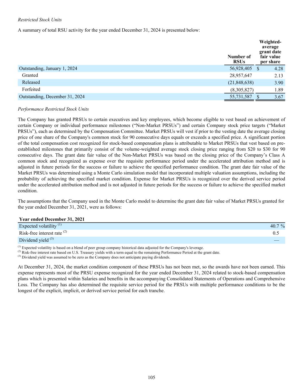限制性股票单位截至2024年12月31日止年度的总RSU活动摘要如下:RSU加权数量-平均授予日每股公允价值已发行,2024年1月1日56,928,405美元4.28已授予28,957,6472.13已发布(21,848,638)3.90没收(8,305,827)1.89未偿还,2024年12月31日55,731,587美元3.67业绩限制性股票单位公司已向某些高管和关键员工授予PRSU,这些员工将根据实现某些公司或个人业绩里程碑(“非市场PRSU”)和某些公司股价目标(“市场PRSU”)而有资格归属,每一个都由薪酬委员会确定。如果在归属日之前,一股公司普通股连续90天的平均收盘价等于或超过指定价格,则市场PRSU将归属。基于股票的薪酬计划确认的总薪酬成本的很大一部分归因于市场PRSU,它们根据预先设定的里程碑归属,这些里程碑主要包括连续90天的成交量加权平均股票收盘价在20美元至30美元之间。非市场PRSU的授予日公允价值基于公司A类普通股的收盘价,并在加速归属法下的必要业绩期间内确认为费用,并在未来期间根据成功或未能达到规定的业绩条件进行调整。Market PRSUs的授予日公允价值是使用包含多种估值假设的蒙特卡洛模拟模型确定的,其中包括实现特定市场条件的概率。市场PRSU的费用根据加速归属法在派生服务期内确认,不会在未来期间因成功或未能达到规定的市场条件而调整。公司在蒙特卡洛模型中用于确定截至2021年12月31日止年度授予的市场PRSU的授予日公允价值的假设如下:截至2021年12月31日止年度预期波动率(1)40.7%无风险利率(2)0.5股息收益率(3)—(1)预期波动率基于根据公司杠杆调整的同行集团公司历史数据的混合。(2)基于美国国债收益率的无风险利率,期限等于授予日的剩余履行期限。(3)假设股息收益率为零,因为公司预计不会支付股息。截至2024年12月31日,这些PRSU的市场条件部分尚未满足,因此尚未获得奖励。该费用是截至2024年12月31日止年度确认的与股票薪酬计划相关的大部分PRSU费用,该费用在随附的综合运营和综合亏损报表的工资和福利中列报。公司还确定了具有多种履约条件的PRSU的必要服务期为每一档的显性、隐性或派生服务期中最长的一档。105