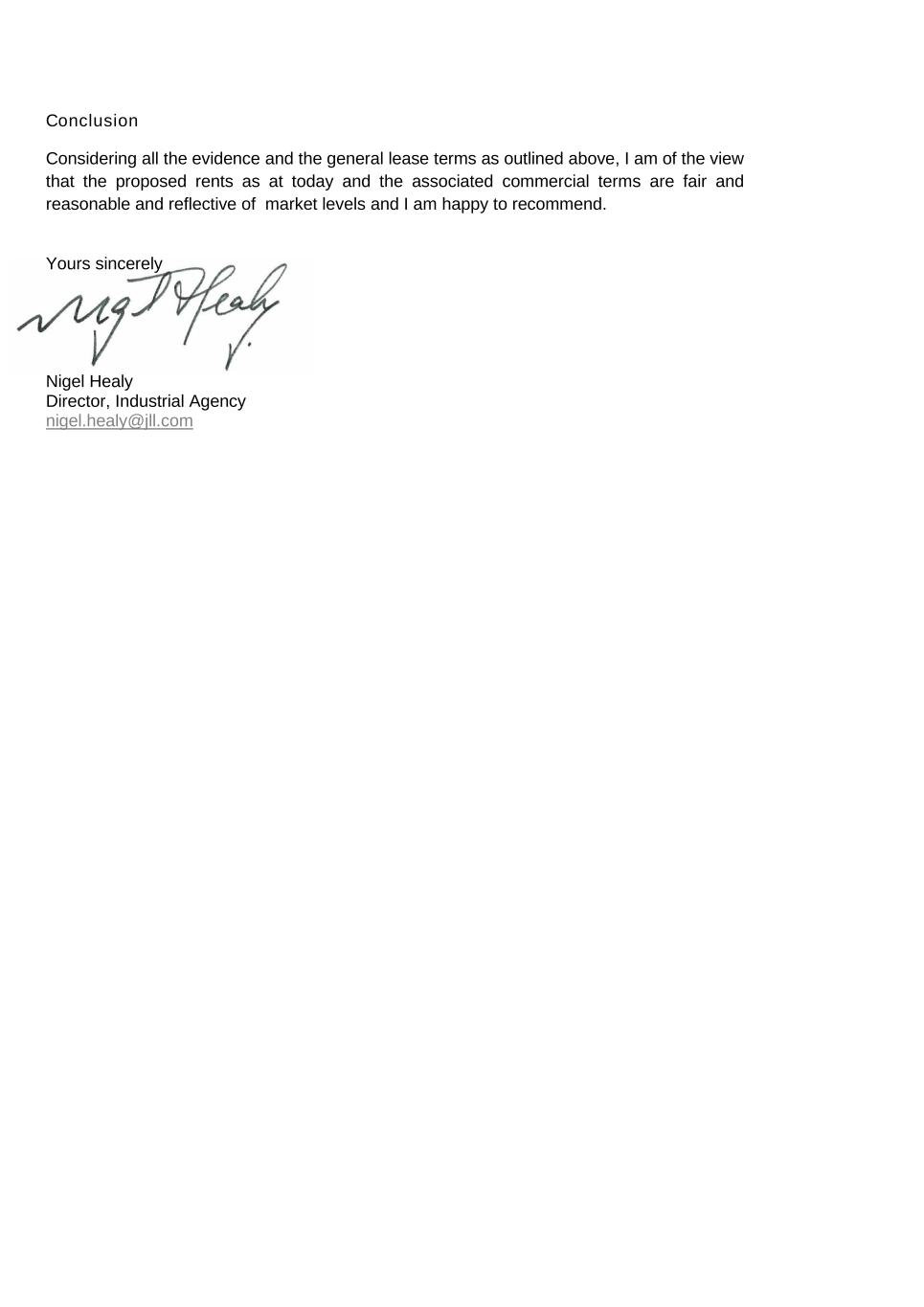 结论考虑到上述所有证据和一般租赁条款,我认为截至今天的拟议租金和相关商业条款是公平合理的,并反映了市场水平,我很乐意推荐。此致真诚Nigel Healy工业机构总监nigel.healy@jll.com