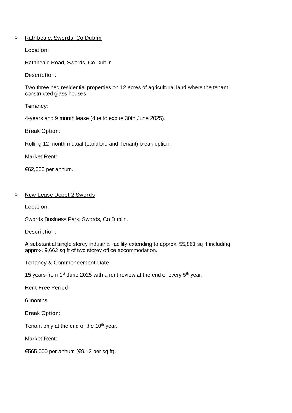 ↓ Rathbeale,Swords,Co Dublin地点:Rathbeale Road,Swords,Co Dublin。描述:租客建造玻璃房的12亩农用地上的两处三床住宅物业。租约:4年9个月租约(将于2025年6月30日到期)。中断期权:滚动12个月相互(房东和租户)中断期权。市场租金:每年62,000欧元。↓ New Lease Depot 2 Swords地点:Swords Business Park,Swords,Co Dublin。描述:一个大型单层工业设施,延伸至约55,861平方英尺,包括约9,662平方英尺的两层办公用房。租赁及开工日期:自2025年6月1日起计15年,每5年年底进行租金审核。免租期:6个月。中断选项:仅在第10年结束时承租人。市场租金:每年565,000欧元(每平方英尺9.12欧元)。