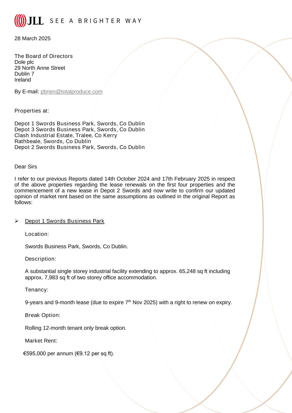 2025年3月28日董事会Dole plc 29 North Anne Street Dublin 7 Ireland通过电子邮件:pbrien@totalproduce.com Properties at:Depot 1 Swords Business Park,Swords,Co Dublin Depot 3 Swords Business Park,Swords,Co Dublin Clash Industrial Estate,Tralee,Co Kerry Rathbeale,Swords,Co Dublin Depot 2 Swords Business Park,Swords,Co Dublin尊敬的先生们,请参阅我们之前于2024年10月14日和2025年2月17日就上述物业发布的关于前四个物业的续租和Depot 2 Swords新租约开始的报告,现致函确认我们基于与原报告中概述的相同假设对市场租金的更新意见如下:↓ Depot 1 Swords Business Park位置:Swords Business Park,Swords,Co Dublin。描述:一个大型单层工业设施延伸至约65,248平方英尺,其中包括约7,983平方英尺的两层办公用房。租约:9年9个月租约(将于2025年11月7日到期),到期有权续期。Break Option:Rolling 12 months tenant only break option。市场租金:每年59.5万欧元(每平方英尺9.12欧元)。