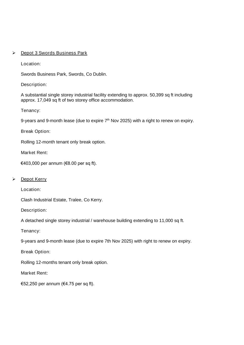 ↓ Depot 3 Swords商业园地点:Swords商业园,Swords,Co Dublin。描述:一个大型单层工业设施延伸至约50,399平方英尺,包括约17,049平方英尺的两层办公用房。租约:9年9个月租约(将于2025年11月7日到期),到期有权续期。中断选项:滚动12个月租户唯一中断选项。市场租金:每年403,000欧元(每平方英尺8.00欧元)。↓ Depot Kerry地点:Clash Industrial Estate,Tralee,Co Kerry。描述:延伸至11,000平方英尺的独立单层工业/仓库建筑。租赁:9年9个月租约(将于2025年11月7日到期),到期有权续租。Break Option:Rolling 12 months tenant only break option。市场租金:每年52,250欧元(每平方英尺4.75欧元)。