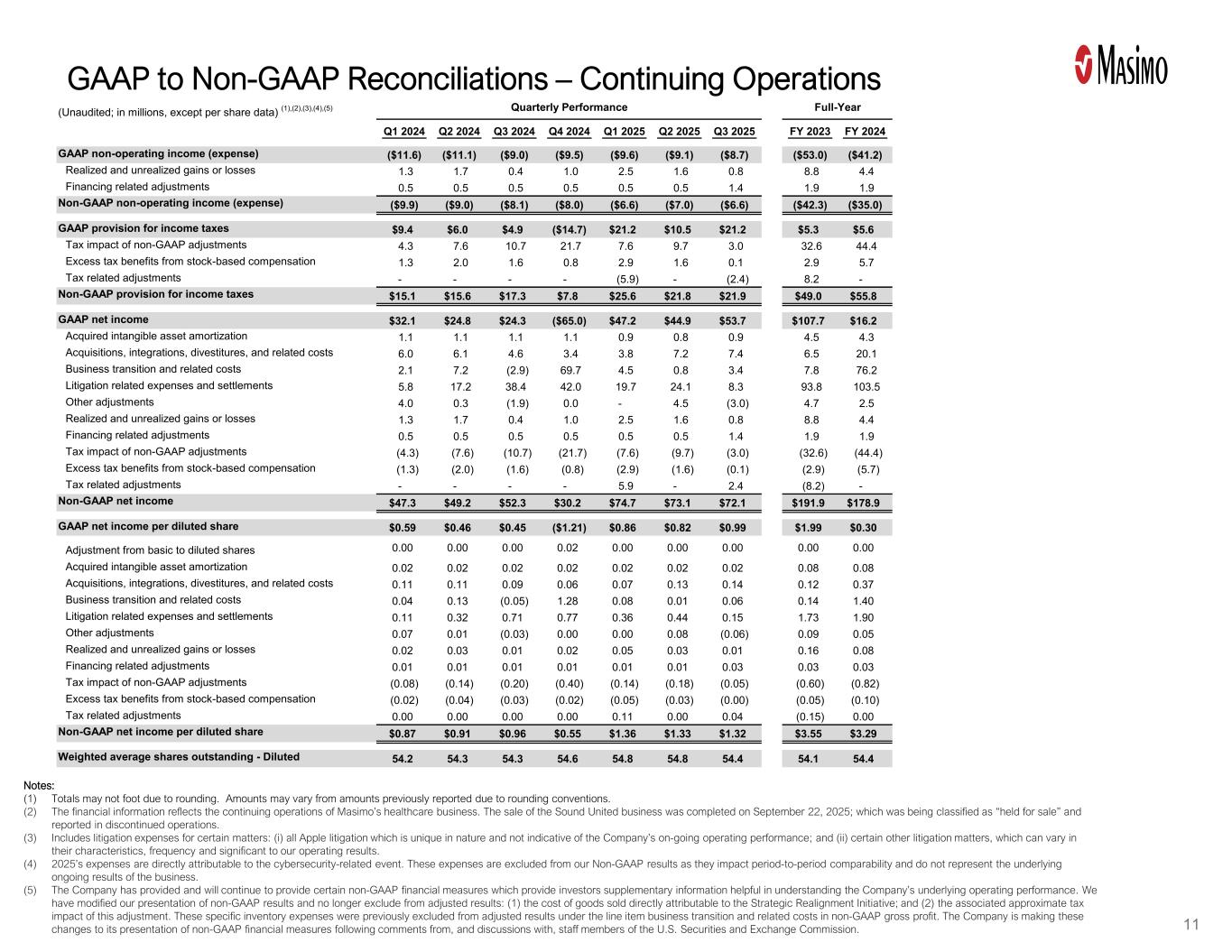 (未经审计;以百万计,每股数据除外)(1)、(2)、(3)、(4)、(5)季度业绩全年Q1 2024 Q2 2024 Q3 2024 Q4 2024 Q1 2025 Q2 2025 Q3 2025 FY 2023FY 2024 GAAP收入$ 339.6 $ 343.9 $ 343.3 $ 368.4 $ 372.0 $ 370.9 $ 371.5 $ 1,275.5 $ 1,395.2业务过渡和相关成本----(0.9)(0.6)(0.3)--非GAAP收入$ 339.6 $ 343.9 $ 343.3 $ 368.4 $ 371.0 $ 370.3 $ 371.2 $ 1,275.5 $ 1,395.2 GAAP毛利润$ 206.6 $ 207.3 $ 212.1 $ 168.3 $ 234.0 $ 233.3 $ 230.6 $ 765.6 $ 794.3获得的无形资产摊销0.5 0.5 0.5及相关成本0.0 0.1------0.1业务转型及相关成本0.36.85.2 2.5(0.3)(0.8)(0.2)4.9 14.8其他调整4.0 0.3(1.9)0.0---4.7 2.5非GAAP毛利润$ 211.4 $ 214.9 $ 215.9 $ 171.4 $ 234.1 $ 232.8 $ 230.8 $ 777.1 $ 813.6 GAAP销售、一般和管理费用$ 115.7 $ 126.3 $ 136.6 $ 170.0 $ 119.4 $ 138.9 $ 116.4 $ 451.3 $ 548.6收购的无形资产摊销(0.6)(0.6)(0.6)(0.6)(0.6)(0.5)(2.5)(2.5)收购、整合、剥离,及相关成本(6.0)(6.0)(4.6)(3.4)(3.8)(7.2)(7.4)(6.2)(20.0)业务过渡及相关成本(0.5)0.68.5(30.8)(2.1)(3.0)(1.6)(1.5)(22.2)诉讼相关费用和和解(5.8)(17.2)(38.4)(41.5)(17.1)(24.1)(8.2)(76.1)(102.9)其他调整---(4.5)3.0--非GAAP销售、一般和管理费用$ 102.7 $ 103.0 $ 101.4 $ 93.7 $ 95.9 $ 99.6 $ 101.7 $ 365.1 $ 400.9 GAAP研发费用$ 37.8 $ 39.1 $ 37.3 $ 68.0 $ 33.9 $ 29.9 $ 30.5 $ 130.5 $ 182.2收购、整合、资产剥离,和相关成本------(0.3)-业务过渡和相关成本(1.3)(1.0)(0.4)(36.3)(2.6)1.4(2.0)(1.4)(39.1)非GAAP研发费用$ 36.5 $ 38.1 $ 36.9 $ 31.7 $ 31.3 $ 31.3 $ 28.5 $ 128.8 $ 143.1 GAAP诉讼和解和裁决$ 0.0 $ 0.0 $ 0.0 $ 0.5 $ 2.7 $ 0.0 $ 0.1 $ 17.8 $ 0.5诉讼相关费用和和解---(0.5)(2.7)-(0.1)(17.8)(0.5)非GAAP诉讼和解和奖励0.0美元0.0美元0.0美元0.0美元0.0美元0.0美元0.0美元0.0美元0.0美元0.0美元0.0美元0.0美元0.0美元0.0美元0.0美元0.0美元0.0美元0.0美元0.0美元0.0美元0.0美元0.0美元0.0美元0.0美元0.0美元0.0美元0.0美元0.0美元0.0美元0.0美元0.0美元0.0美元0.0美元0.0美元0.0美元0.0美元0.0美元0.0美元0.0美元0.0美元0.0美元0.0美元0.0美元0.0美元0.0美元0.0美元0.0美元0.0美元0.0美元0.0美元0.0美元0.0美元0.0美元0.0美元0.0美元0.0美元0.0美元0.0美元0.0美元0.0美元0.0美元0.0美元0.0美元0.0美元0.0及相关成本(6.0)(6.0)(4.6)(3.4)(3.8)(7.2)(7.4)(6.5)(20.0)业务过渡及相关成本(1.8)(0.4)8.1(67.2)(4.7)(1.6)(3.6)(2.9)(61.3)诉讼相关费用和和解(5.8)(17.2)(38.4)(42.0)(19.7)(24.1)(8.3)(93.8)(103.5)其他调整----(4.5)3.0--Non-GAAP Operating Expenses $ 139.2 $ 141.1 $ 138.3 $ 125.4 $ 127.1 $ 130.9 $ 130.2 $ 493.9 $ 544.0 GAAP Operating Profit $ 53.1 $ 41.9 $ 38.2($ 70.2)$ 78.0 $ 64.5 $ 83.6和相关成本6.06.14.6 3.4 3.87.27.46.5 20.1业务过渡和相关成本2.17.2(2.9)69.7 4.5 0.8 3.47.8 76.2诉讼相关费用和和解5.8 17.238.44 2.0 19.72 4.18.39 3.8 103.5其他调整4.0 0.3(1.9)0.0-4.5(3.0)4.7 2.5 Non-GAAP营业利润$ 72.2 $ 73.8 $ 77.7 $ 46.0 $ 106.9 $ 101.9 $ 100.6 $ 283.3 $ 269.7 GAAP与Non-GAAP调节–持续经营注:(1)由于四舍五入,总数可能不够。由于四舍五入的惯例,金额可能与先前报告的金额有所不同。(二)财务信息反映麦斯莫医疗健康业务的持续经营情况。出售Sound United业务已于2025年9月22日完成;该业务被归类为“持有待售”并在已终止经营业务中报告。(3)包括某些事项的诉讼费用:(i)所有性质独特且不代表公司持续经营业绩的Apple诉讼;(ii)某些其他诉讼事项,其特点可能各不相同, 频率,对我们的经营业绩具有重要意义。(4)2025年费用直接归属于网络安全相关事件。这些费用不包括在我们的非公认会计原则结果中,因为它们影响期间之间的可比性,并不代表业务的基本持续结果。(5)公司已提供并将继续提供某些非公认会计准则财务指标,这些指标为投资者提供了有助于了解公司基本经营业绩的补充信息。我们修改了我们对非公认会计原则结果的表述,不再从调整后的结果中排除:(1)直接归属于战略调整倡议的销售商品成本;(2)这一调整的相关近似税收影响。这些特定的库存费用此前被排除在非美国通用会计准则毛利润的细目业务过渡和相关成本下的调整后结果之外。根据美国证券交易委员会工作人员的评论和讨论,该公司正在对其非GAAP财务指标的表述方式进行这些更改。10 (3) (4) (5)