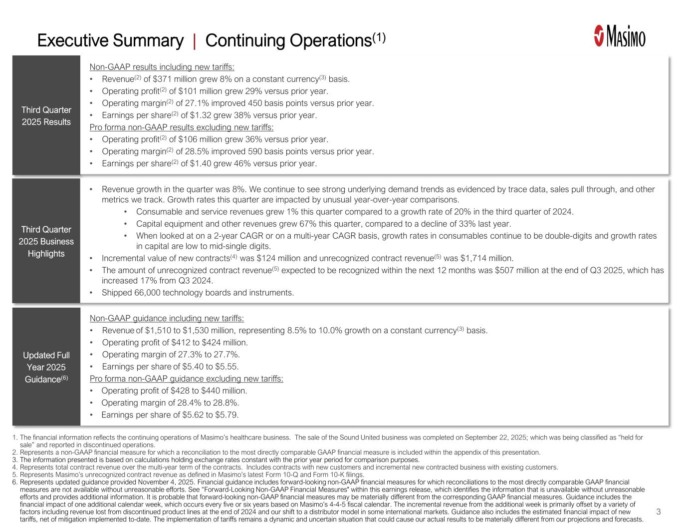 执行摘要|持续经营(1)2025年第三季度业绩包括新关税在内的非公认会计准则业绩:•收入(2)为3.71亿美元,按固定汇率(3)计算增长8%。•营业利润(2)为1.01亿美元,较上年增长29%。•营业利润率(2)为27.1%,较上年提高450个基点。•每股收益(2)为1.32美元,较上年增长38%。不计新关税的备考非GAAP业绩:•营业利润(2)为1.06亿美元,较上年增长36%。•营业利润率(2)为28.5%,较上年提高590个基点。•每股收益(2)为1.40美元,较上年增长46%。3 1.该财务信息反映了麦斯莫医疗保健业务的持续经营情况。出售Sound United业务已于2025年9月22日完成;该业务被归类为“持有待售”并在已终止经营业务中报告。2.表示与最直接可比的GAAP财务指标的对账包含在本演示文稿附录中的非GAAP财务指标。3.所提供的信息是根据保持汇率与上年同期不变的计算得出的,以便进行比较。4.系指合同多年期内的合同总收入。包括与新客户的合同和与现有客户的增量新合同业务。5.代表麦斯莫最新的10-Q表格和10-K表格备案中定义的未确认合同收入。6.系2025年11月4日提供的更新指南。财务指导包括前瞻性的非GAAP财务指标,如果不做出不合理的努力,就无法获得与最直接可比的GAAP财务指标的对账。请参阅本财报中的“前瞻性非GAAP财务指标”,该指标确定了未经不合理努力无法获得的信息,并提供了额外信息。前瞻性的非GAAP财务指标很可能与相应的GAAP财务指标存在重大差异。该指南包括额外一个日历周的财务影响,该影响根据麦斯莫的4-4-5财政日历每五年或六年发生一次。额外一周带来的增量收入主要被多种因素所抵消,包括2024年底停产产品线带来的收入损失,以及我们在一些国际市场转向分销商模式。指导意见还包括新关税的估计财务影响,扣除迄今为止实施的缓解措施。关税的实施仍然是一个动态和不确定的情况,这可能导致我们的实际结果与我们的预测和预测存在重大差异。更新的2025年全年指引(6)包括新关税的非GAAP指引:•收入为1,510至1,530百万美元,按固定汇率(3)计算,增长8.5%至10.0%。•营业利润4.12-4.24亿美元。•营业利润率为27.3%至27.7%。•每股收益5.40美元至5.55美元。不包括新关税的备考非GAAP指引:•营业利润4.28至4.4亿美元。•营业利润率为28.4%至28.8%。•每股收益为5.62美元至5.79美元。2025年第三季度业务亮点•本季度收入增长8%。我们继续看到强劲的潜在需求趋势,跟踪数据、销售拉动和我们跟踪的其他指标证明了这一点。本季度的增长率受到不寻常的同比比较的影响。•本季度消耗品和服务收入增长1%,而2024年第三季度的增长率为20%。•本季度资本设备和其他收入增长了67%,而去年则下降了33%。•以2年复合年增长率或多年复合年增长率来看,消耗品增长率继续保持两位数,资本增长率为低至中个位数。•新合同(4)的增量价值为1.24亿美元,未确认合同收入(5)为17.14亿美元。• 2025年Q3末预计在未来12个月内确认的未确认合同收入(5)金额为5.07亿美元,较2024年Q3增长17%。•出货6.6万块科技板和仪器。