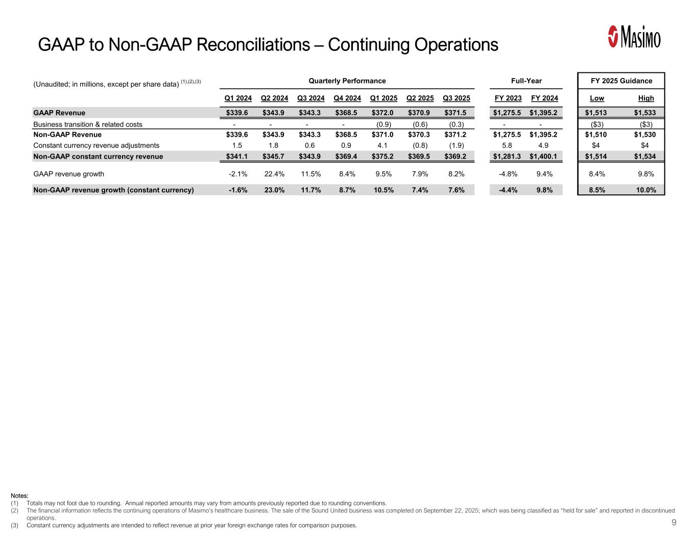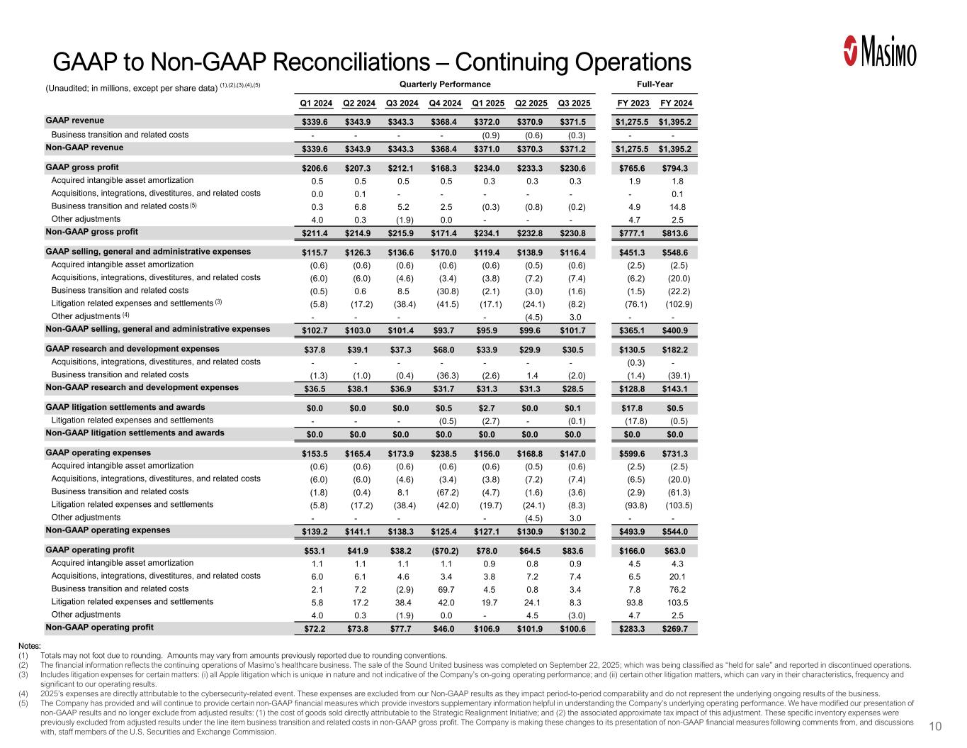 GAAP与Non-GAAP对账–持续经营注意事项:(1)由于四舍五入,总数可能不存在。由于四舍五入的惯例,年度报告的金额可能与先前报告的金额有所不同。(二)财务信息反映麦斯莫医疗健康业务的持续经营情况。出售Sound United业务已于2025年9月22日完成;该业务被归类为“持有待售”并在已终止经营业务中报告。(3)不变的货币调整旨在反映按上一年外汇汇率计算的收入,以便进行比较。9(未经审计;以百万计,每股数据除外)(1)、(2)、(3)季度业绩2025财年全年指引Q1 2024 Q2 2024 Q3 2024 Q4 2024 Q1 2025 Q2 2025 Q3 2025 FY 2023 FY 2024 Low High GAAP revenue $ 339.6 $ 343.9 $ 343.3 $ 368.5 $ 372.0 $ 370.9 $ 371.5 $ 1,275.5 $ 1,395.2 $ 1,513 $ 1,533 Business transition & related costs---(0.9)(0.6)(0.3)--($ 3)($ 3)non-GAAP revenue $ 339.6 $ 343.9 $ 343.3 $ 368.5 $ 371.0 $ 370.3 $ 371.2 $ 1,275.5 $ 1,395.2 $ 1,510 $ 1,530 constant currency revenue adj1,400.1美元1,514美元1,534美元GAAP收入增长-2.1 % 22.4% 11.5% 8.4% 9.5% 7.9% 8.2%-4.8 % 9.4% 8.4% 9.8%非GAAP收入增长(固定货币)-1.6 % 23.0% 11.7% 8.7% 10.5% 7.4% 7.6%-4.4 % 9.8% 8.5% 10.0%