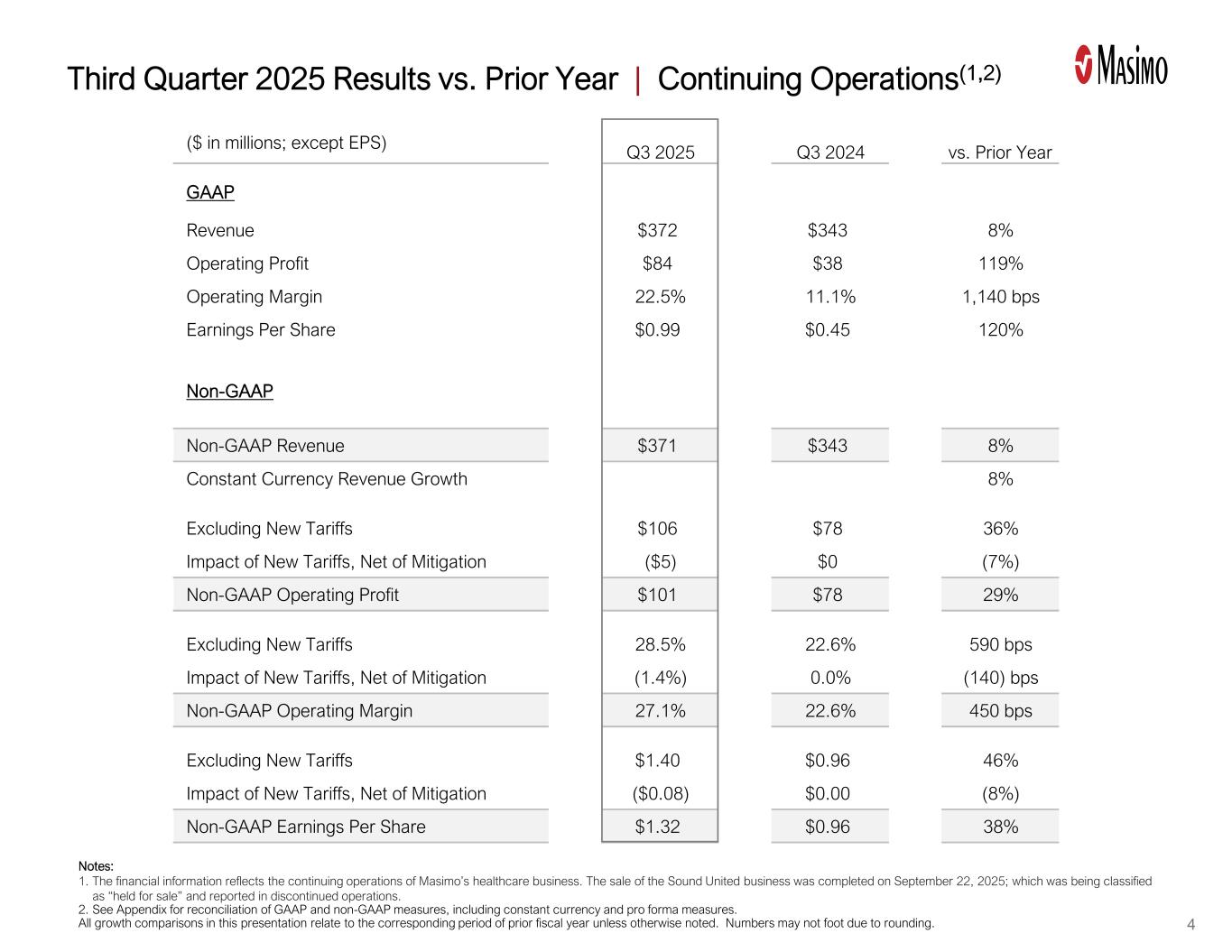 (百万美元;EPS除外)GAAP收入372美元3438%营业利润84美元38119%营业利润率22.5% 11.1% 1,140个基点每股收益0.99美元0.45120%非GAAP非GAAP收入371美元3438%固定货币收入增长8%不包括新关税106美元7836%新关税影响,扣除缓解(5美元)0美元(7%)非GAAP营业利润101美元7829%不包括新关税28.5% 22.6% 590个基点新关税影响,扣除缓解(1.4%)0.0%(140)个基点Non-GAAP营业利润率27.1% 22.6% 450个基点不包括新关税1.40美元0.96 46%新关税影响,扣除缓解费用(0.08美元)0.00美元(8%)非美国通用会计准则每股收益1.32美元0.96美元与上一年相比上一年2025年第三季度2024年第三季度业绩与上一年相比增长38% |持续经营(1,2)注:1。该财务信息反映了麦斯莫医疗保健业务的持续经营情况。出售Sound United业务已于2025年9月22日完成;该业务被归类为“持有待售”并在已终止经营业务中报告。2.有关GAAP和非GAAP措施的调节,包括固定货币和备考措施,请参见附录。除非另有说明,本演示文稿中的所有增长比较都与上一财政年度的相应期间有关。由于四舍五入,数字可能无法实现。4