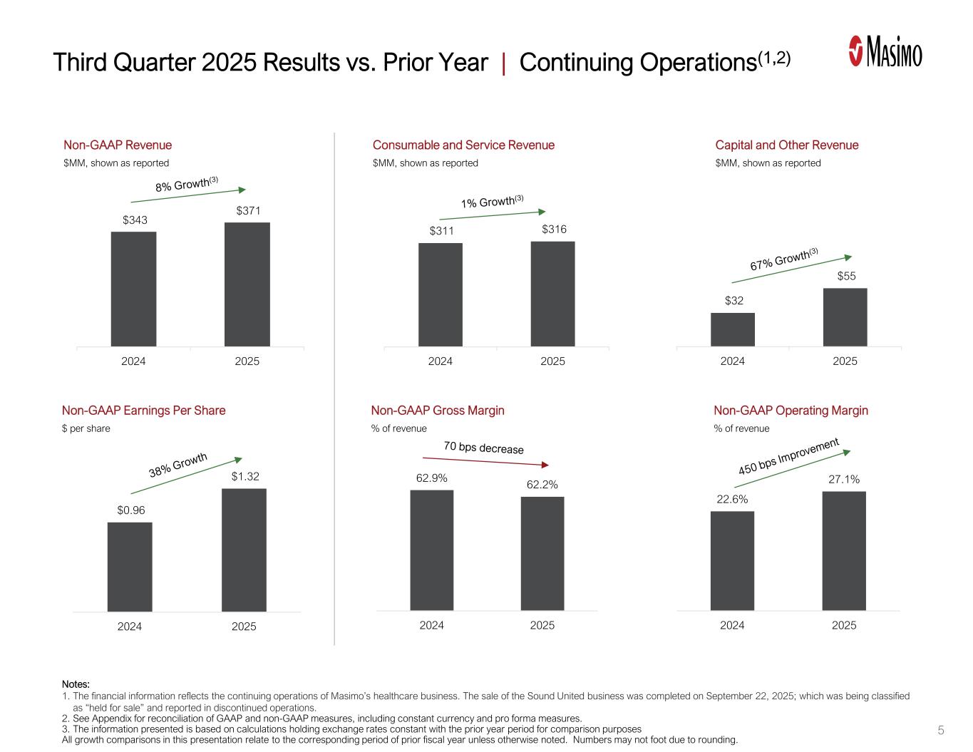 22.6% 27.1% 2024202562.9% 62.2% 20242025 $ 0.96 $ 1.32 202420255 Non-GAAP Revenue $ MM,shown as reported $ 343 $ 37120242025 $ 311 $ 31620242025 $ 32 $ 5520242025 Consumable and Service Revenue $ MM,shown as reported Capital and Other Revenue $ MM,shown as reported Note:1。该财务信息反映了麦斯莫医疗保健业务的持续经营情况。出售Sound United业务已于2025年9月22日完成;该业务被归类为“持作出售”并在已终止经营业务中报告。2.有关GAAP和非GAAP措施的对账,包括固定货币和备考措施,请参见附录。3.所提供的信息是基于保持汇率与上一年期间不变的计算,以便进行比较,除非另有说明,否则本演示文稿中的所有增长比较都与上一财政年度的相应期间有关。由于四舍五入,数字可能无法实现。2025年第三季度业绩对比上年|持续经营业务(1,2)Non-GAAP每股收益$每股Non-GAAP毛利率占收入比% Non-GAAP营业利润率占收入比%