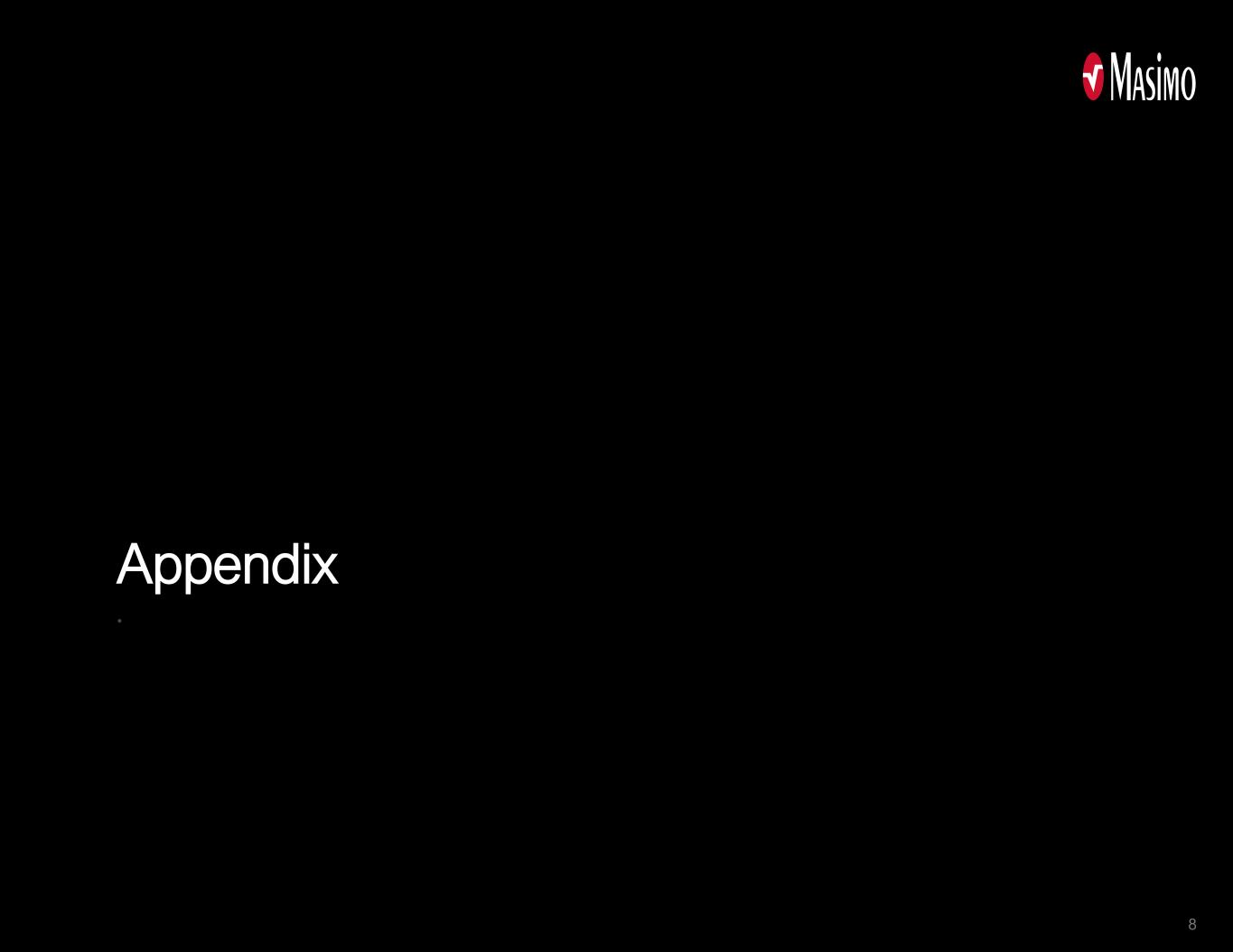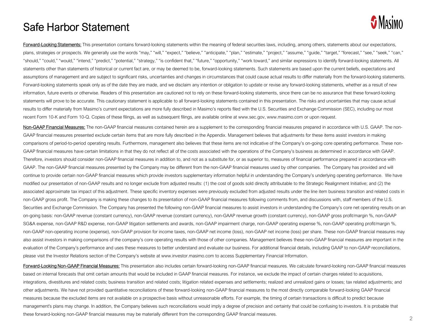 安全港声明前瞻性声明:本演示文稿包含联邦证券法含义内的前瞻性声明,其中包括关于我们的期望、计划、战略或前景的声明。我们通常使用“可能”、“将”、“预期”、“相信”、“预期”、“计划”、“估计”、“项目”、“假设”、“指导”、“目标”、“预测”、“看到”、“寻求”、“可以”、“应该”、“可以”、“将”、“打算”、“预测”、“潜力”、“战略”、“有信心”、“未来”、“机会”、“努力”等词语来识别前瞻性陈述。除历史或当前事实陈述之外的所有陈述都是或可能被视为前瞻性陈述。此类陈述基于管理层当前的信念、预期和假设,并受到可能导致实际结果与前瞻性陈述产生重大差异的重大风险、不确定性和环境变化的影响。前瞻性陈述仅在作出之日起生效,我们不承担任何更新或修改任何前瞻性陈述的意图或义务,无论是由于新信息、未来事件或其他原因。本演示文稿的读者被告诫不要依赖这些前瞻性陈述,因为无法保证这些前瞻性陈述将被证明是准确的。本警示性声明适用于本演示文稿中包含的所有前瞻性声明。可能导致实际结果与麦斯莫当前预期存在重大差异的风险和不确定性在麦斯莫向美国证券交易委员会(SEC)提交的报告中有更全面的描述,包括我们最近的10-K表格和10-Q表格。这些文件的副本以及随后提交的文件,可在www.sec.gov、www.masimo.com在线查阅或根据要求查阅。非美国通用会计准则财务指标:此处包含的非美国通用会计准则财务指标是对根据美国通用会计准则编制的相应财务指标的补充。所提供的非GAAP财务指标不包括附录中更全面描述的某些项目。管理层认为,对这些项目的调整有助于投资者对不同时期的经营业绩进行比较。此外,管理层还认为,这些项目并不代表公司持续的核心经营业绩。这些非GAAP财务指标有一定的局限性,因为它们没有反映根据GAAP确定的与公司业务运营相关的所有成本。因此,投资者应考虑将非GAAP财务指标作为根据GAAP编制的财务业绩指标的补充,而不是替代或优于这些指标。公司提出的非美国通用会计准则财务指标可能与其他公司采用的非美国通用会计准则财务指标不同。公司已提供并将继续提供某些非公认会计准则财务指标,为投资者提供有助于了解公司基本经营业绩的补充信息。我们修改了我们对非公认会计原则结果的表述,不再从调整后的结果中排除:(1)直接归属于战略调整倡议的销售商品成本;(2)这一调整的相关近似税收影响。这些特定的库存费用此前被排除在非美国通用会计准则毛利润的细目业务过渡和相关成本下的调整结果之外。根据美国证券交易委员会工作人员的评论和讨论,该公司正在对其非GAAP财务指标的表述方式进行这些更改。公司提出以下非美国通用会计准则财务指标,以帮助投资者持续了解公司的核心净经营业绩:非美国通用会计准则收入(固定货币),非美国通用会计准则收入(固定货币),非美国通用会计准则收入增长(固定货币),非美国通用会计准则毛利率/利润率%,非美国通用会计准则SG & A费用,非美国通用会计准则研发费用,非美国通用会计准则诉讼和解和裁决,非美国通用会计准则减值费用,非美国通用会计准则营业费用%,非美国通用会计准则营业利润/利润率%,非美国通用会计准则营业外收入(费用),非美国通用会计准则所得税拨备,非美国通用会计准则净收益(亏损),非美国通用会计准则每股净收益(亏损)。这些非公认会计准则财务指标也可能有助于投资者将公司的核心经营业绩与其他公司的业绩进行比较。管理层认为,这些非公认会计准则财务指标在评估公司业绩方面很重要,并使用这些指标来更好地理解和评估我们的业务。有关更多财务细节,包括GAAP与非GAAP对账, 请访问公司网站www.investor.masimo.com的投资者关系部分,以获取补充财务信息。前瞻性非GAAP财务指标:本演示文稿还包括某些前瞻性非GAAP财务指标。我们根据内部预测计算前瞻性非GAAP财务指标,其中省略了将包含在GAAP财务指标中的某些金额。例如,我们排除了与收购、整合、剥离和相关成本相关的某些费用的影响;业务过渡和相关成本;与诉讼相关的费用和和解;已实现和未实现的收益或损失;与税收相关的调整;以及其他调整。我们没有提供这些前瞻性非GAAP财务指标与最直接可比的前瞻性GAAP财务指标的量化对账,因为如果没有不合理的努力,排除的项目就无法在预期的基础上获得。例如,某些交易的时间很难预测,因为管理层的计划可能会发生变化。此外,该公司认为,这种对账将意味着一定程度的精确度和确定性,这可能会让投资者感到困惑。这些前瞻性的非GAAP财务指标很可能与相应的GAAP财务指标存在重大差异。2