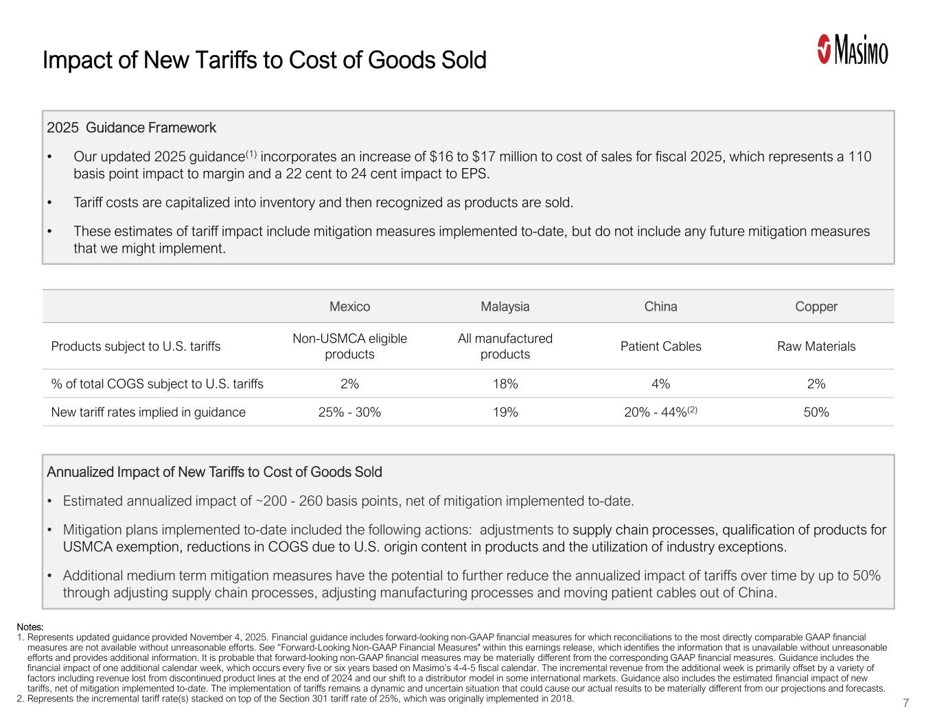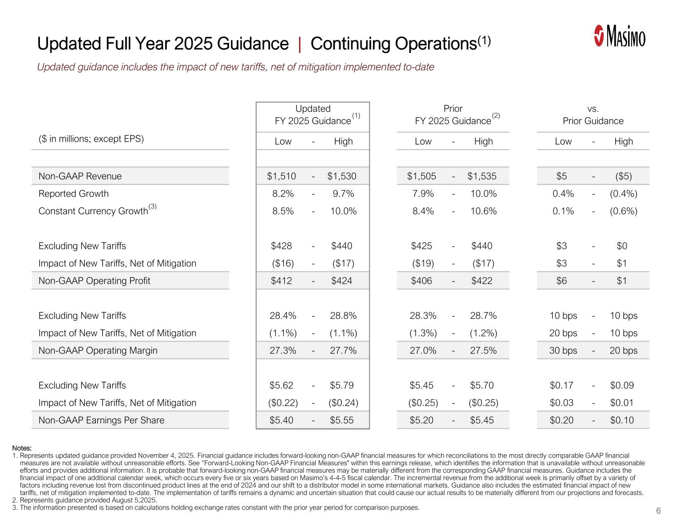 (百万美元;EPS除外)低-高-低-高-高Non-GAAP收入$ 1,510-$ 1,530 $ 1,505-$ 1,535 $ 5-($ 5)报告增长8.2%-9.7% 7.9%-10.0% 0.4%-(0.4%)不变货币增长8.5%-10.0% 8.4%-10.6% 0.1%-(0.6%)不包括新关税$ 428-$ 440 $ 425-$ 440 $ 3-$ 0新关税的影响,扣除缓解($ 16)-($ 17)($ 19)-($ 17)$ 3-$ 1非美国通用会计准则营业利润$ 412-$ 424 $ 406-$ 422 $ 6-$ 1不包括新关税28.4%-28.8% 28.3%-28.7% 10个基点-10个基点新关税影响,扣除缓解(1.1%)-(1.1%)(1.3%)-(1.2%)20个基点-10个基点非美国通用会计准则营业利润率27.3%-27.7% 27.0%-27.5% 30个基点-20个基点不包括新关税$ 5.62-$ 5.79 $ 5.45-$ 5.70 $ 0.17-$ 0.09新关税影响,扣除缓解措施(0.22美元)-(0.24美元)(0.25美元)-(0.25美元)0.03美元-0.01美元非公认会计准则每股收益5.40美元-5.55美元5.20美元-5.45美元0.20美元-0.10美元更新的2025财年指引之前的2025财年指引与之前的指引6更新的指引包括新关税的影响,扣除迄今为止实施的缓解措施注:1。系2025年11月4日提供的更新指南。财务指导包括前瞻性的非GAAP财务指标,如果不做出不合理的努力,就无法获得与最直接可比的GAAP财务指标的对账。请参阅本财报中的“前瞻性非GAAP财务指标”,该指标确定了未经不合理努力无法获得的信息,并提供了额外信息。前瞻性的非GAAP财务指标很可能与相应的GAAP财务指标存在重大差异。该指南包括额外一个日历周的财务影响,该影响根据麦斯莫的4-4-5财政日历每五年或六年发生一次。额外一周带来的增量收入主要被多种因素所抵消,包括2024年底停产产品线带来的收入损失,以及我们在一些国际市场转向分销商模式。指导意见还包括新关税的估计财务影响,扣除迄今为止实施的缓解措施。关税的实施仍然是一个动态和不确定的情况,可能导致我们的实际结果与我们的预测和预测存在重大差异。2.表示2025年8月5日提供的指导。3.所提供的信息是根据保持汇率与上一年期间不变的计算得出的,以便进行比较。(1)(2)更新2025年全年指引|持续经营(1)(3)