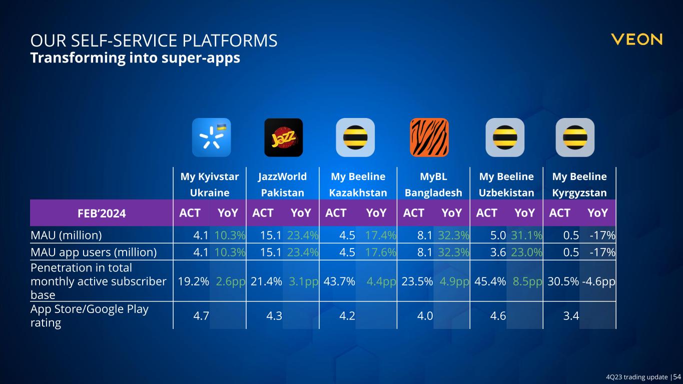 54 4Q23交易更新|我们的54个自助服务平台转型为超级应用程序我的Kyivstar JazzWorld我的Beeline MyBL我的Beeline我的Beeline乌克兰巴基斯坦哈萨克斯坦孟加拉国乌兹别克斯坦吉尔吉斯斯坦FEB'2024法案同比法案同比法案同比法案同比MAU(百万)4.1 10.3% 15.12 3.4% 4.5 17.4% 8.13 2.3% 5.03 1.1% 0.5-17 % MAU应用用户(百万)4.1 10.3% 15.12 3.4% 4.5 17.6% 8.13 2.3% 3.62 3.0% 0.5-17 %月活跃用户总数渗透率19.2% 2.6pp 21.4% 3.1pp 43.7% 4.4pp 23.5% 4.9pp 45.4% 8.5pp 30.5%-4.6pp应用商店/Google Play评分4.7 4.34.24.04.6 3.4
