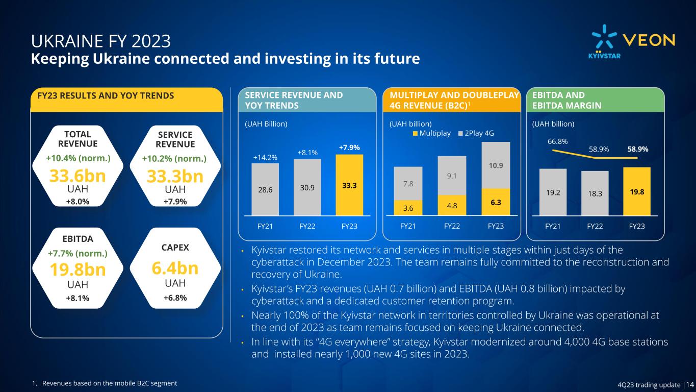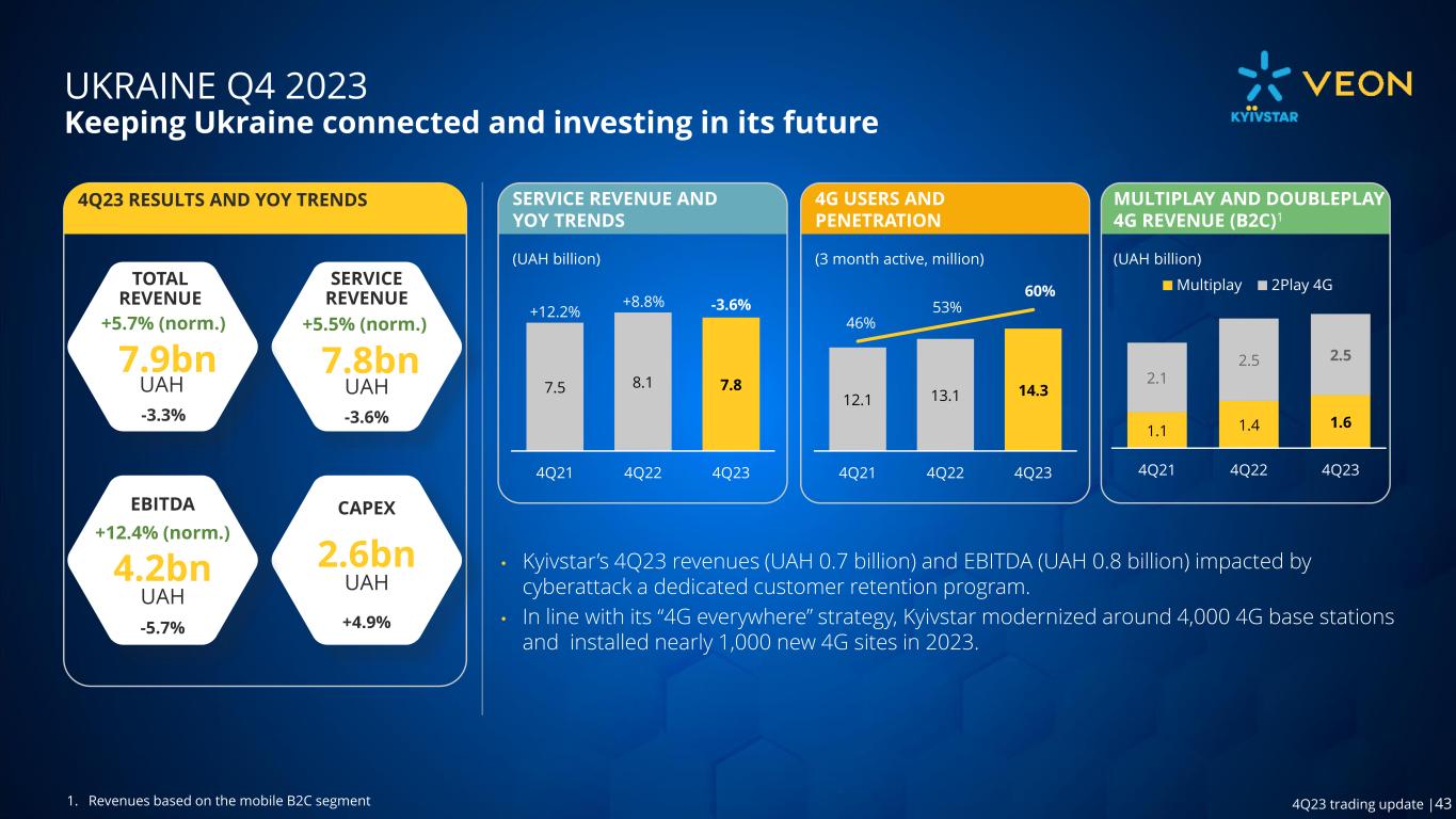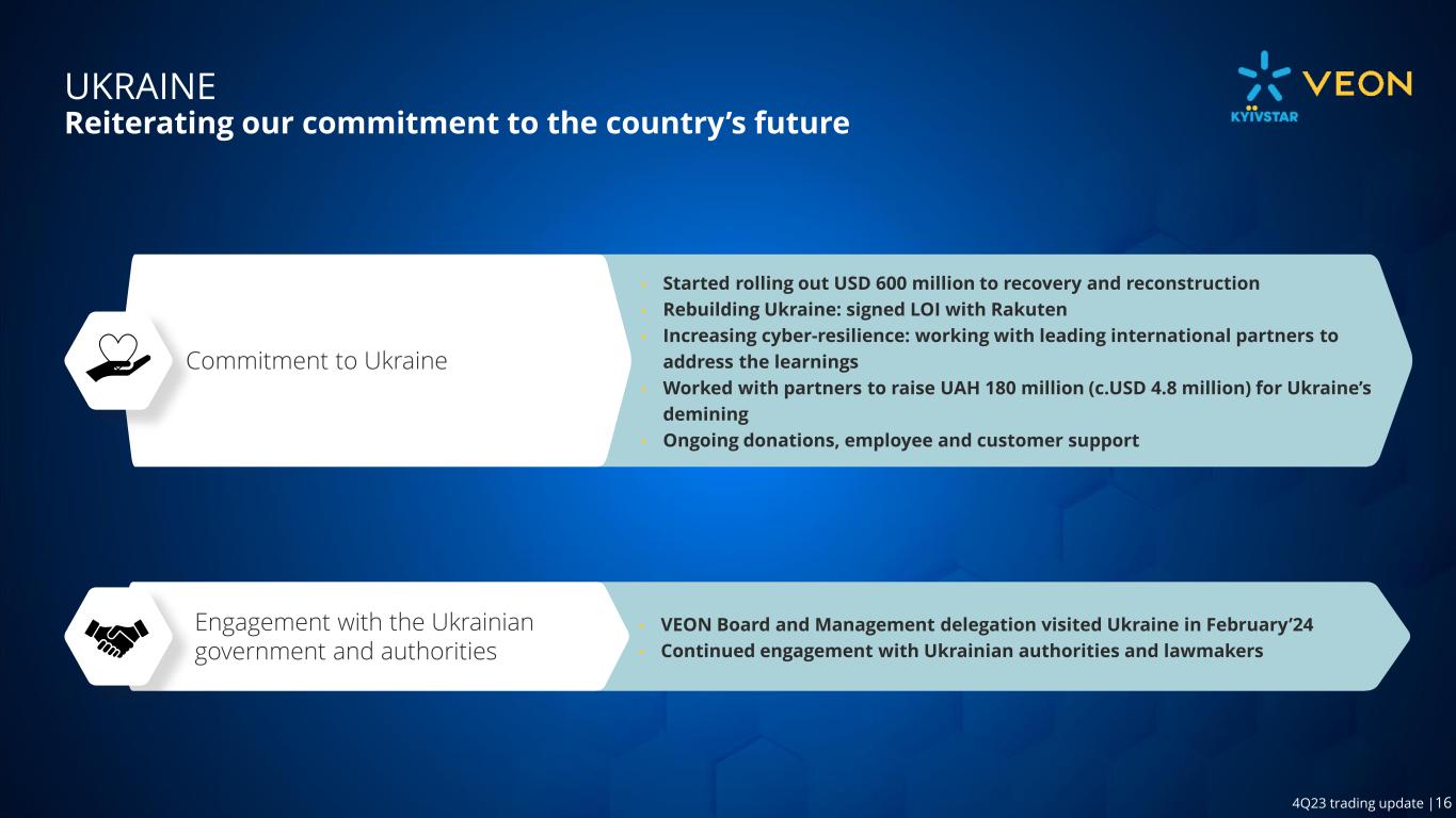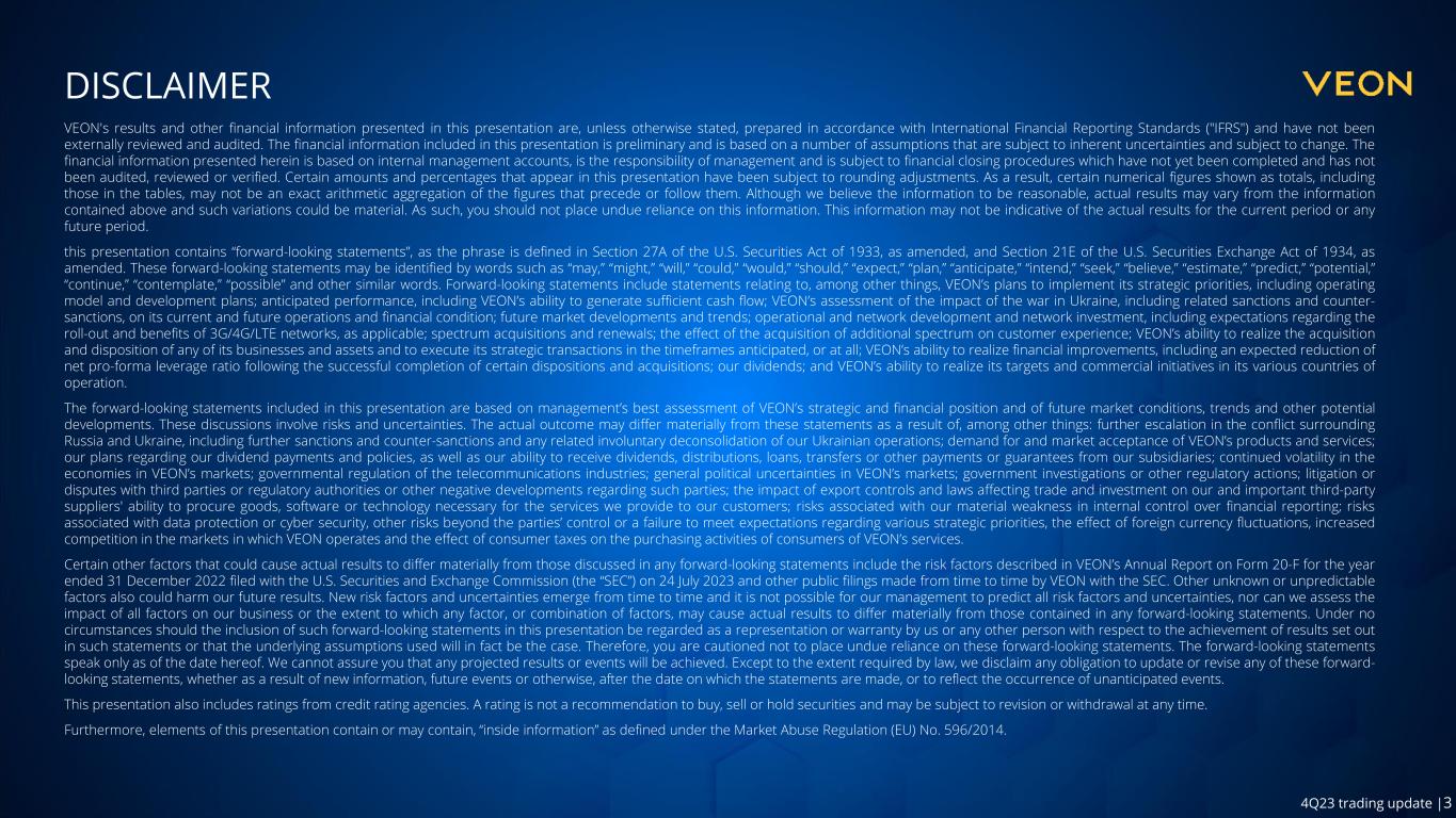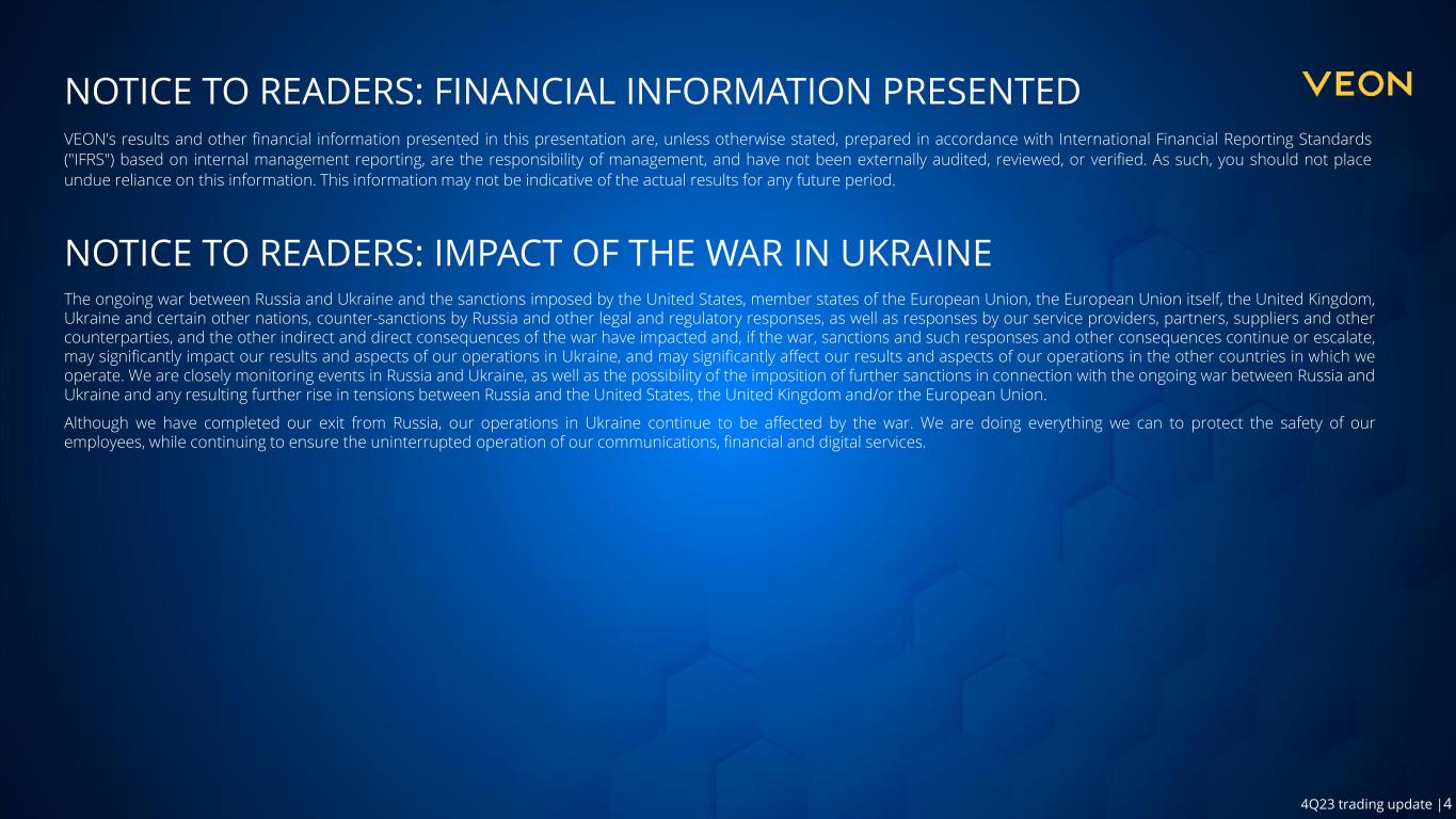 4 4Q23交易更新| 4读者须知:除非另有说明,否则列报的财务信息中的VEON业绩和本列报中列报的其他财务信息均根据国际财务报告准则(“IFRS”)基于内部管理报告编制,由管理层负责,未经外部审计、审查或核实。因此,您不应过分依赖这些信息。这些信息可能并不代表未来任何时期的实际结果。读者须知:战争对乌克兰的影响俄罗斯和乌克兰之间正在进行的战争和美国、欧盟成员国、欧盟本身、英国、乌克兰和某些其他国家实施的制裁,俄罗斯的反制裁和其他法律和监管回应,以及我们的服务提供商、合作伙伴、供应商和其他对手的回应,以及战争的其他间接和直接后果已经产生影响,如果战争、制裁和此类回应和其他后果继续或升级,可能会严重影响我们在乌克兰业务的业绩和方面,并可能严重影响我们在我们业务所在的其他国家的业绩和业务方面。我们正在密切关注俄罗斯和乌克兰发生的事件,以及与俄罗斯和乌克兰之间正在进行的战争以及由此导致的俄罗斯与美国、英国和/或欧盟之间紧张局势进一步上升有关的进一步制裁的可能性。虽然我们已经完成了从俄罗斯的撤离,但我们在乌克兰的行动继续受到战争的影响。我们正在尽我们所能保护员工的安全,同时继续确保我们的通信、金融和数字服务的不间断运行。