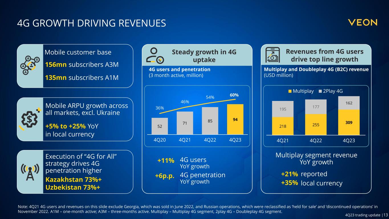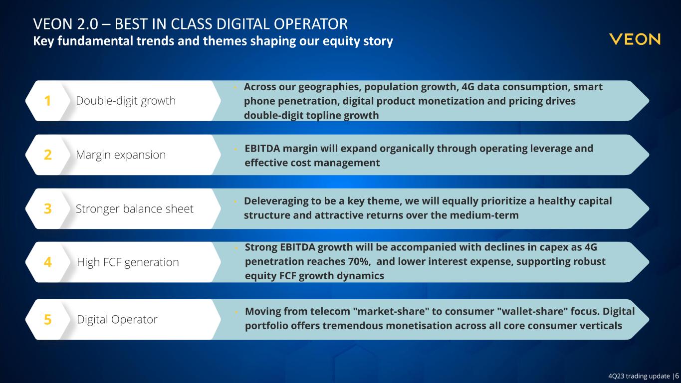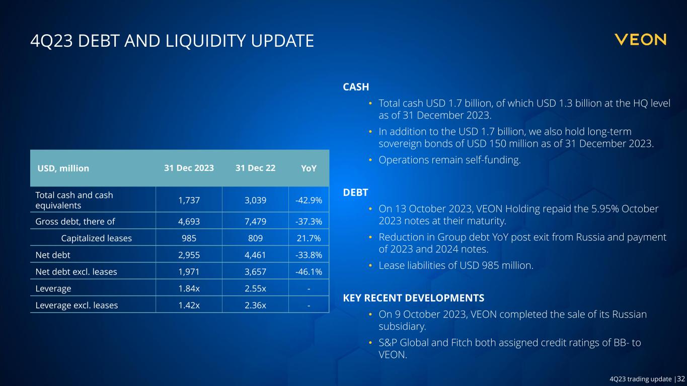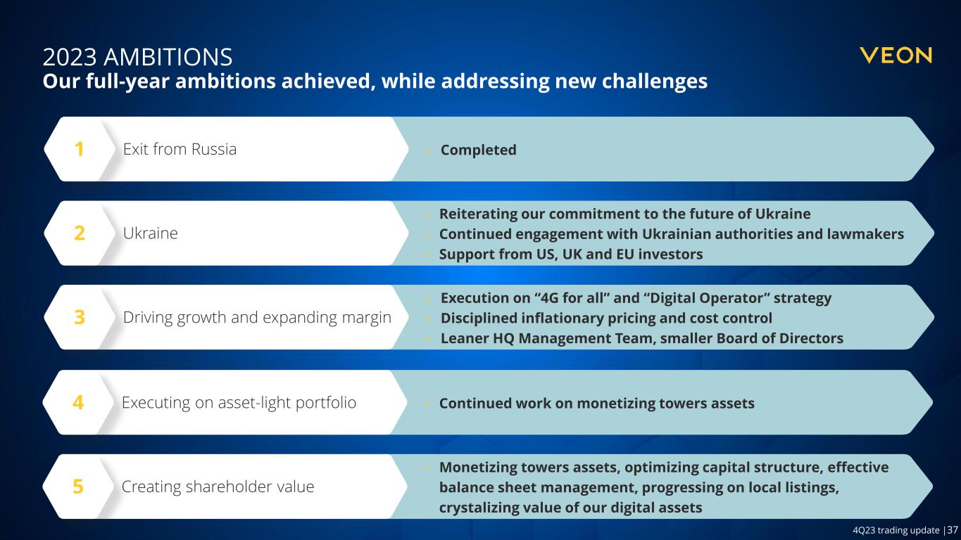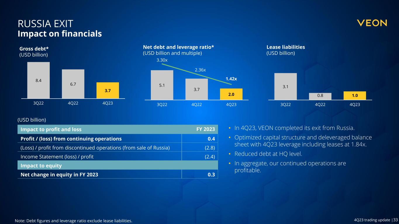 3 4Q23交易更新| 3除非另有说明,否则免责声明人VEON的业绩和本列报中列报的其他财务信息是根据国际财务报告准则(“IFRS”)编制的,未经外部审查和审计。本演示文稿中包含的财务信息是初步的,基于一些受到固有不确定性影响并可能发生变化的假设。此处提供的财务信息基于内部管理账户,由管理层负责,并受制于尚未完成且未经审计、审查或核实的财务结算程序。本列报中出现的某些数额和百分比已作四舍五入调整。因此,显示为总数的某些数字数字,包括表格中的数字,可能不是它们前面或后面的数字的精确算术汇总。尽管我们认为这些信息是合理的,但实际结果可能与上述信息有所不同,这种变化可能是重大的。因此,您不应过分依赖这些信息。这些信息可能并不代表当前期间或任何未来期间的实际结果。本演示文稿包含“前瞻性陈述”,这一短语在经修订的1933年美国证券法第27A条和经修订的1934年美国证券交易法第21E条中定义。这些前瞻性陈述可以用“可能”、“可能”、“将”、“可能”、“将”、“应该”、“预期”、“计划”、“预期”、“打算”、“寻求”、“相信”、“估计”、“预测”、“潜在”、“继续”、“考虑”、“可能”等类似词语来识别。前瞻性陈述包括与(其中包括)VEON实施其战略优先事项的计划有关的陈述,包括运营模式和发展计划;预期业绩,包括VEON产生充足现金流的能力;VEON对乌克兰战争影响的评估,包括相关的制裁和反制裁,对其当前和未来的运营和财务状况产生的影响;未来的市场发展和趋势;运营和网络发展以及网络投资,包括对5G/4G/LTE网络的推出和收益的预期,如适用;频谱收购和更新;额外频谱的收购对客户体验的影响;VEON在预期的时间范围内实现对其任何业务和资产的收购和处置以及执行其战略交易的能力,或根本没有;VEON实现财务改善的能力,包括在成功完成某些处置和收购后预期净备考杠杆率会降低;我们的股息;以及TERM0在其不同运营国家实现其目标和商业举措的能力。本演示文稿中包含的前瞻性陈述是基于管理层对VEON的战略和财务状况以及未来市场状况、趋势和其他潜在发展的最佳评估。这些讨论涉及风险和不确定性。由于以下原因,实际结果可能与这些声明存在重大差异:除其他外,围绕俄罗斯和乌克兰的冲突进一步升级,包括进一步的制裁和反制裁以及我们乌克兰业务的任何相关非自愿取消合并;对VEON产品和服务的需求和市场接受度;我们关于股息支付和政策的计划,以及我们获得股息、分配、贷款的能力,我们子公司的转账或其他付款或担保;VEON市场的经济持续波动;电信行业的政府监管;VEON市场的一般政治不确定性;政府调查或其他监管行动;与第三方或监管机构的诉讼或纠纷或有关这些方的其他负面发展;影响贸易和投资的出口管制和法律对我们和重要的第三方供应商采购货物能力的影响,我们向客户提供的服务所需的软件或技术;与我们在财务报告内部控制方面的重大弱点相关的风险;与数据保护或网络安全相关的风险、各方无法控制的其他风险或未能达到有关各种战略优先事项的预期、外汇波动的影响, VEON经营所在市场的竞争加剧以及消费税对VEON服务消费者购买活动的影响。可能导致实际结果与任何前瞻性陈述中讨论的结果存在重大差异的某些其他因素包括VEON于2023年7月24日向美国证券交易委员会(“SEC”)提交的截至2022年12月31日止年度的20-F表格年度报告中描述的风险因素以及VEON不时向SEC提交的其他公开文件中描述的风险因素。其他未知或不可预测的因素也可能损害我们未来的业绩。新的风险因素和不确定性不时出现,我们的管理层无法预测所有风险因素和不确定性,我们也无法评估所有因素对我们业务的影响或任何因素或因素组合可能导致实际结果与任何前瞻性陈述中包含的结果存在重大差异的程度。在任何情况下,本演示文稿中包含此类前瞻性陈述都不应被视为我们或任何其他人对实现此类陈述中所列结果的陈述或保证,或所使用的基本假设实际上将是这种情况。因此,请注意不要过分依赖这些前瞻性陈述。这些前瞻性陈述仅在本文发布之日发表。我们无法向你保证,任何预计的结果或事件都会实现。除法律要求的范围外,我们不承担任何义务更新或修改任何这些前瞻性陈述,无论是由于新信息、未来事件或其他原因,在做出陈述之日之后,或反映意外事件的发生。该演示文稿还包括信用评级机构的评级。评级不是买入、卖出或持有证券的建议,随时可能被修正或撤回。此外,本演示文稿的要素包含或可能包含《市场滥用监管(EU)第596/2014号》定义的“内幕信息”。