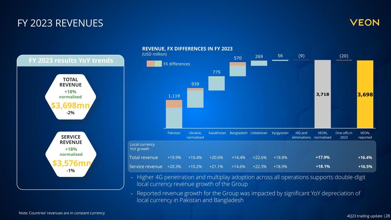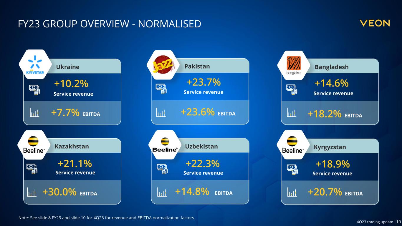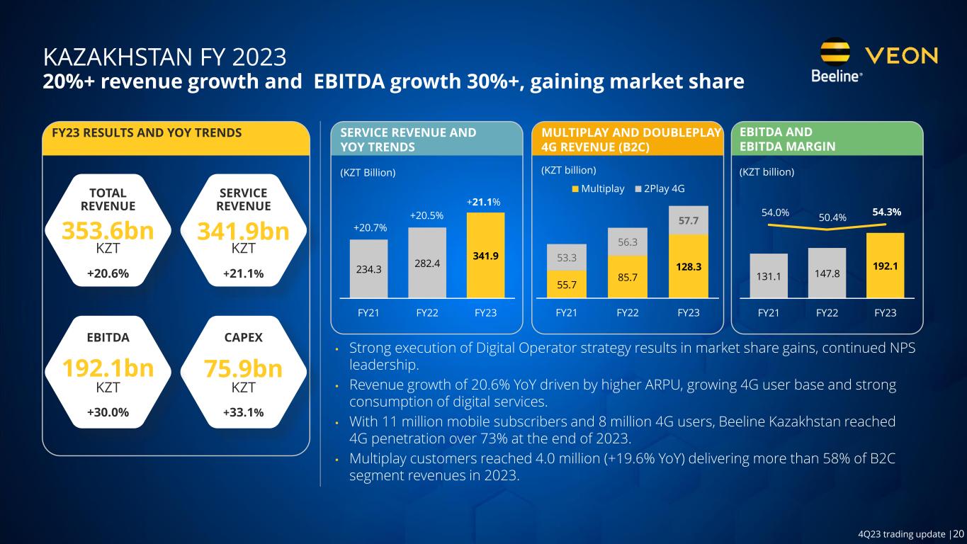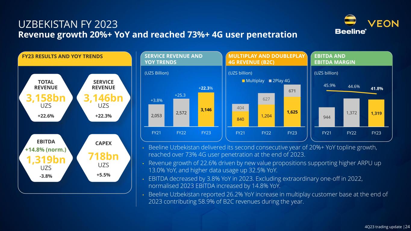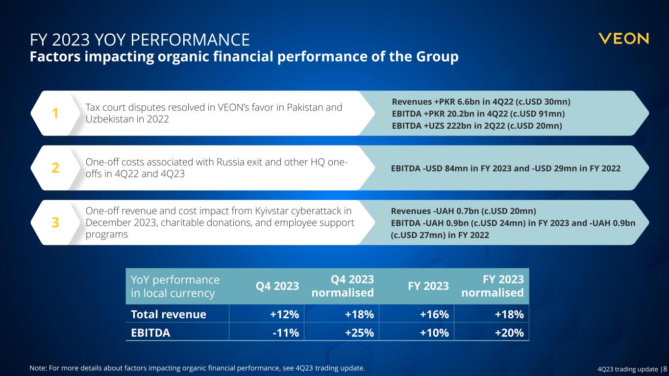 3 4Q23交易更新| 3除非另有说明,否则免责声明人VEON的业绩和本列报中列报的其他财务信息是根据国际财务报告准则(“IFRS”)编制的,未经外部审查和审计。本演示文稿中包含的财务信息是初步的,基于一些受到固有不确定性影响并可能发生变化的假设。此处提供的财务信息基于内部管理账户,由管理层负责,并受制于尚未完成且未经审计、审查或核实的财务结算程序。本列报中出现的某些数额和百分比已作四舍五入调整。因此,显示为总数的某些数字数字,包括表格中的数字,可能不是它们前面或后面的数字的精确算术汇总。尽管我们认为这些信息是合理的,但实际结果可能与上述信息有所不同,这种变化可能是重大的。因此,您不应过分依赖这些信息。这些信息可能并不代表当前期间或任何未来期间的实际结果。本演示文稿包含“前瞻性陈述”,这一短语在经修订的1933年美国证券法第27A条和经修订的1934年美国证券交易法第21E条中定义。这些前瞻性陈述可以用“可能”、“可能”、“将”、“可能”、“将”、“应该”、“预期”、“计划”、“预期”、“打算”、“寻求”、“相信”、“估计”、“预测”、“潜在”、“继续”、“考虑”、“可能”等类似词语来识别。前瞻性陈述包括与(其中包括)VEON实施其战略优先事项的计划有关的陈述,包括运营模式和发展计划;预期业绩,包括VEON产生充足现金流的能力;VEON对乌克兰战争影响的评估,包括相关的制裁和反制裁,对其当前和未来的运营和财务状况产生的影响;未来的市场发展和趋势;运营和网络发展以及网络投资,包括对5G/4G/LTE网络的推出和收益的预期,如适用;频谱收购和更新;额外频谱的收购对客户体验的影响;VEON在预期的时间范围内实现对其任何业务和资产的收购和处置以及执行其战略交易的能力,或根本没有;VEON实现财务改善的能力,包括在成功完成某些处置和收购后预期净备考杠杆率会降低;我们的股息;以及TERM0在其不同运营国家实现其目标和商业举措的能力。本演示文稿中包含的前瞻性陈述是基于管理层对VEON的战略和财务状况以及未来市场状况、趋势和其他潜在发展的最佳评估。这些讨论涉及风险和不确定性。由于以下原因,实际结果可能与这些声明存在重大差异:除其他外,围绕俄罗斯和乌克兰的冲突进一步升级,包括进一步的制裁和反制裁以及我们乌克兰业务的任何相关非自愿取消合并;对VEON产品和服务的需求和市场接受度;我们关于股息支付和政策的计划,以及我们获得股息、分配、贷款的能力,我们子公司的转账或其他付款或担保;VEON市场的经济持续波动;电信行业的政府监管;VEON市场的一般政治不确定性;政府调查或其他监管行动;与第三方或监管机构的诉讼或纠纷或有关这些方的其他负面发展;影响贸易和投资的出口管制和法律对我们和重要的第三方供应商采购货物能力的影响,我们向客户提供的服务所需的软件或技术;与我们在财务报告内部控制方面的重大弱点相关的风险;与数据保护或网络安全相关的风险、各方无法控制的其他风险或未能达到有关各种战略优先事项的预期、外汇波动的影响, VEON经营所在市场的竞争加剧以及消费税对VEON服务消费者购买活动的影响。可能导致实际结果与任何前瞻性陈述中讨论的结果存在重大差异的某些其他因素包括VEON于2023年7月24日向美国证券交易委员会(“SEC”)提交的截至2022年12月31日止年度的20-F表格年度报告中描述的风险因素以及VEON不时向SEC提交的其他公开文件中描述的风险因素。其他未知或不可预测的因素也可能损害我们未来的业绩。新的风险因素和不确定性不时出现,我们的管理层无法预测所有风险因素和不确定性,我们也无法评估所有因素对我们业务的影响或任何因素或因素组合可能导致实际结果与任何前瞻性陈述中包含的结果存在重大差异的程度。在任何情况下,本演示文稿中包含此类前瞻性陈述都不应被视为我们或任何其他人对实现此类陈述中所列结果的陈述或保证,或所使用的基本假设实际上将是这种情况。因此,请注意不要过分依赖这些前瞻性陈述。这些前瞻性陈述仅在本文发布之日发表。我们无法向你保证,任何预计的结果或事件都会实现。除法律要求的范围外,我们不承担任何义务更新或修改任何这些前瞻性陈述,无论是由于新信息、未来事件或其他原因,在做出陈述之日之后,或反映意外事件的发生。该演示文稿还包括信用评级机构的评级。评级不是买入、卖出或持有证券的建议,随时可能被修正或撤回。此外,本演示文稿的要素包含或可能包含《市场滥用监管(EU)第596/2014号》定义的“内幕信息”。
