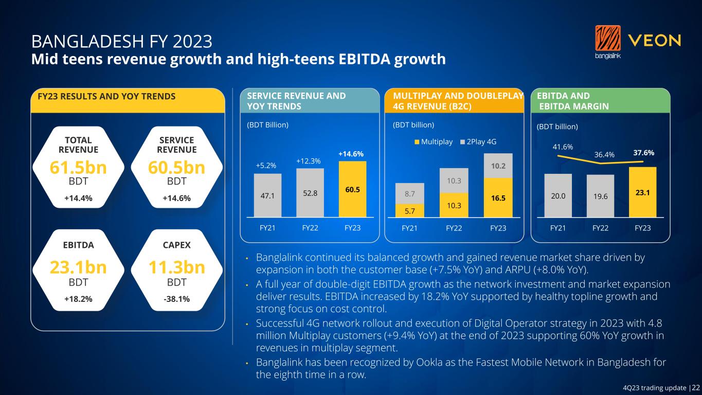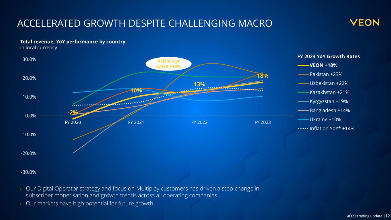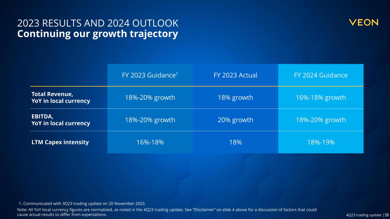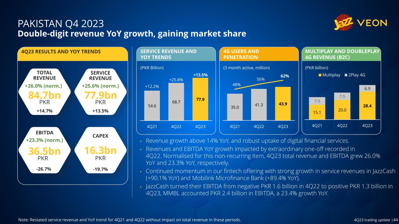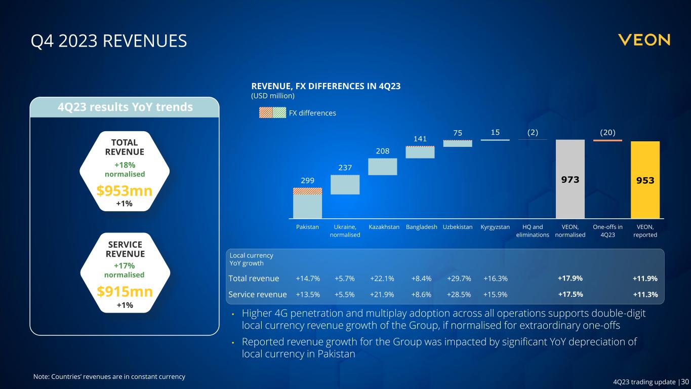 3 4Q23交易更新| 3除非另有说明,否则免责声明人VEON的业绩和本列报中列报的其他财务信息是根据国际财务报告准则(“IFRS”)编制的,未经外部审查和审计。本演示文稿中包含的财务信息是初步的,基于一些受到固有不确定性影响并可能发生变化的假设。此处提供的财务信息基于内部管理账户,由管理层负责,并受制于尚未完成且未经审计、审查或核实的财务结算程序。本列报中出现的某些数额和百分比已作四舍五入调整。因此,显示为总数的某些数字数字,包括表格中的数字,可能不是它们前面或后面的数字的精确算术汇总。尽管我们认为这些信息是合理的,但实际结果可能与上述信息有所不同,这种变化可能是重大的。因此,您不应过分依赖这些信息。这些信息可能并不代表当前期间或任何未来期间的实际结果。本演示文稿包含“前瞻性陈述”,这一短语在经修订的1933年美国证券法第27A条和经修订的1934年美国证券交易法第21E条中定义。这些前瞻性陈述可以用“可能”、“可能”、“将”、“可能”、“将”、“应该”、“预期”、“计划”、“预期”、“打算”、“寻求”、“相信”、“估计”、“预测”、“潜在”、“继续”、“考虑”、“可能”等类似词语来识别。前瞻性陈述包括与(其中包括)VEON实施其战略优先事项的计划有关的陈述,包括运营模式和发展计划;预期业绩,包括VEON产生充足现金流的能力;VEON对乌克兰战争影响的评估,包括相关的制裁和反制裁,对其当前和未来的运营和财务状况产生的影响;未来的市场发展和趋势;运营和网络发展以及网络投资,包括对5G/4G/LTE网络的推出和收益的预期,如适用;频谱收购和更新;额外频谱的收购对客户体验的影响;VEON在预期的时间范围内实现对其任何业务和资产的收购和处置以及执行其战略交易的能力,或根本没有;VEON实现财务改善的能力,包括在成功完成某些处置和收购后预期净备考杠杆率会降低;我们的股息;以及TERM0在其不同运营国家实现其目标和商业举措的能力。本演示文稿中包含的前瞻性陈述是基于管理层对VEON的战略和财务状况以及未来市场状况、趋势和其他潜在发展的最佳评估。这些讨论涉及风险和不确定性。由于以下原因,实际结果可能与这些声明存在重大差异:除其他外,围绕俄罗斯和乌克兰的冲突进一步升级,包括进一步的制裁和反制裁以及我们乌克兰业务的任何相关非自愿取消合并;对VEON产品和服务的需求和市场接受度;我们关于股息支付和政策的计划,以及我们获得股息、分配、贷款的能力,我们子公司的转账或其他付款或担保;VEON市场的经济持续波动;电信行业的政府监管;VEON市场的一般政治不确定性;政府调查或其他监管行动;与第三方或监管机构的诉讼或纠纷或有关这些方的其他负面发展;影响贸易和投资的出口管制和法律对我们和重要的第三方供应商采购货物能力的影响,我们向客户提供的服务所需的软件或技术;与我们在财务报告内部控制方面的重大弱点相关的风险;与数据保护或网络安全相关的风险、各方无法控制的其他风险或未能达到有关各种战略优先事项的预期、外汇波动的影响, VEON经营所在市场的竞争加剧以及消费税对VEON服务消费者购买活动的影响。可能导致实际结果与任何前瞻性陈述中讨论的结果存在重大差异的某些其他因素包括VEON于2023年7月24日向美国证券交易委员会(“SEC”)提交的截至2022年12月31日止年度的20-F表格年度报告中描述的风险因素以及VEON不时向SEC提交的其他公开文件中描述的风险因素。其他未知或不可预测的因素也可能损害我们未来的业绩。新的风险因素和不确定性不时出现,我们的管理层无法预测所有风险因素和不确定性,我们也无法评估所有因素对我们业务的影响或任何因素或因素组合可能导致实际结果与任何前瞻性陈述中包含的结果存在重大差异的程度。在任何情况下,本演示文稿中包含此类前瞻性陈述都不应被视为我们或任何其他人对实现此类陈述中所列结果的陈述或保证,或所使用的基本假设实际上将是这种情况。因此,请注意不要过分依赖这些前瞻性陈述。这些前瞻性陈述仅在本文发布之日发表。我们无法向你保证,任何预计的结果或事件都会实现。除法律要求的范围外,我们不承担任何义务更新或修改任何这些前瞻性陈述,无论是由于新信息、未来事件或其他原因,在做出陈述之日之后,或反映意外事件的发生。该演示文稿还包括信用评级机构的评级。评级不是买入、卖出或持有证券的建议,随时可能被修正或撤回。此外,本演示文稿的要素包含或可能包含《市场滥用监管(EU)第596/2014号》定义的“内幕信息”。