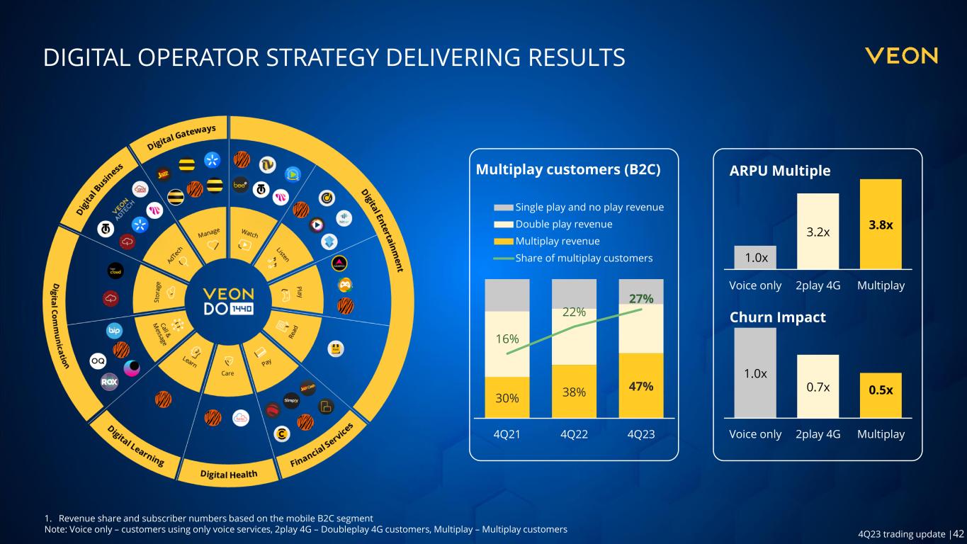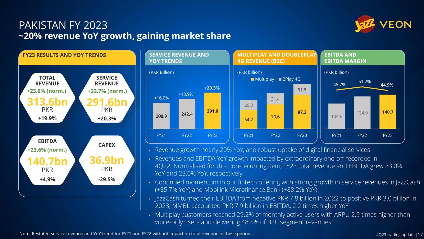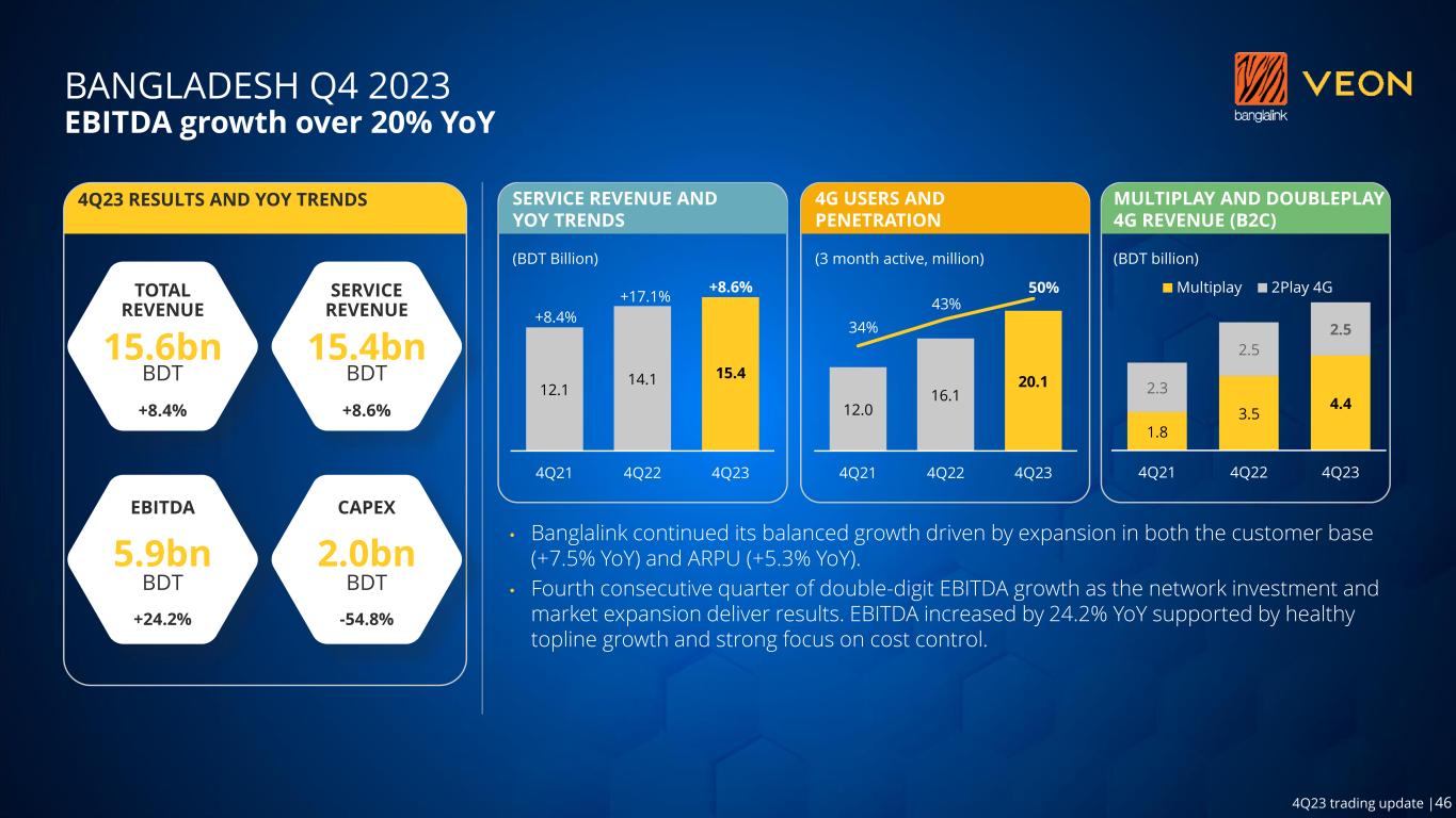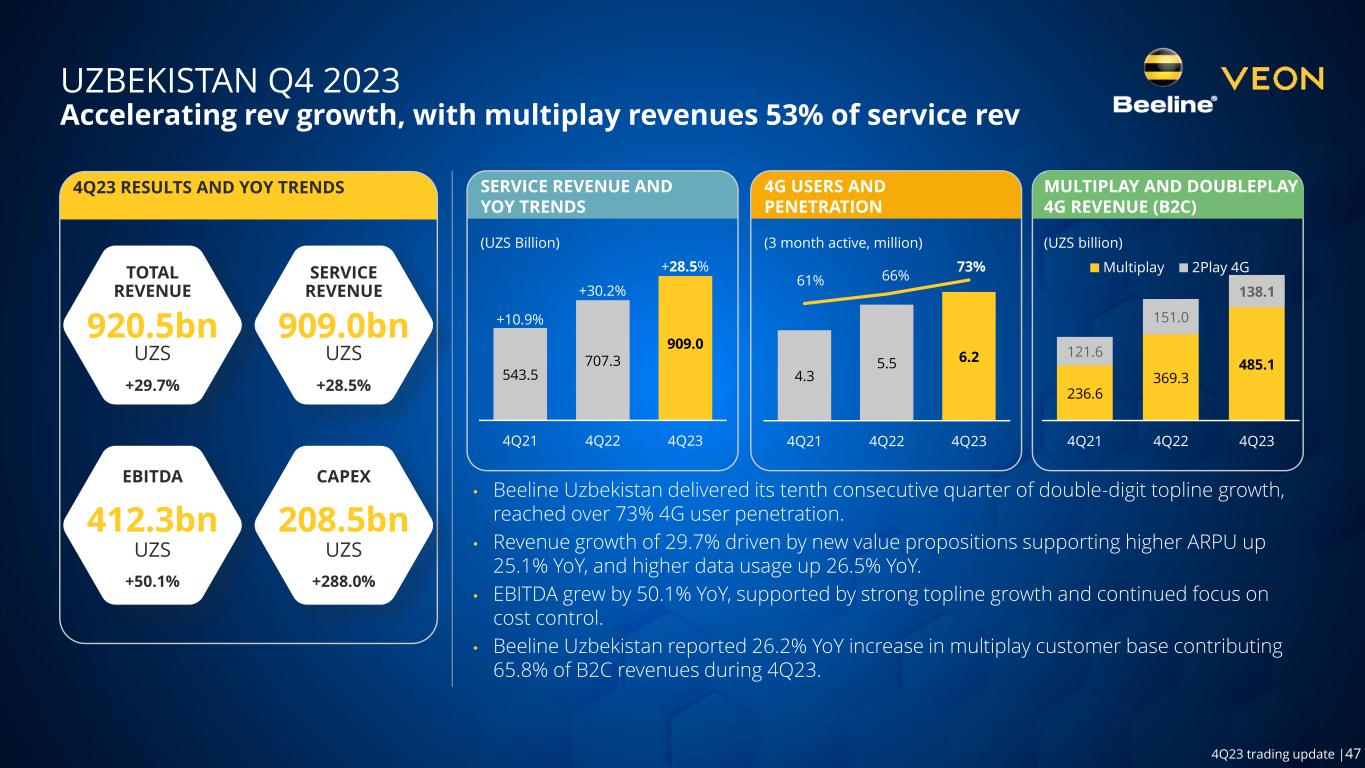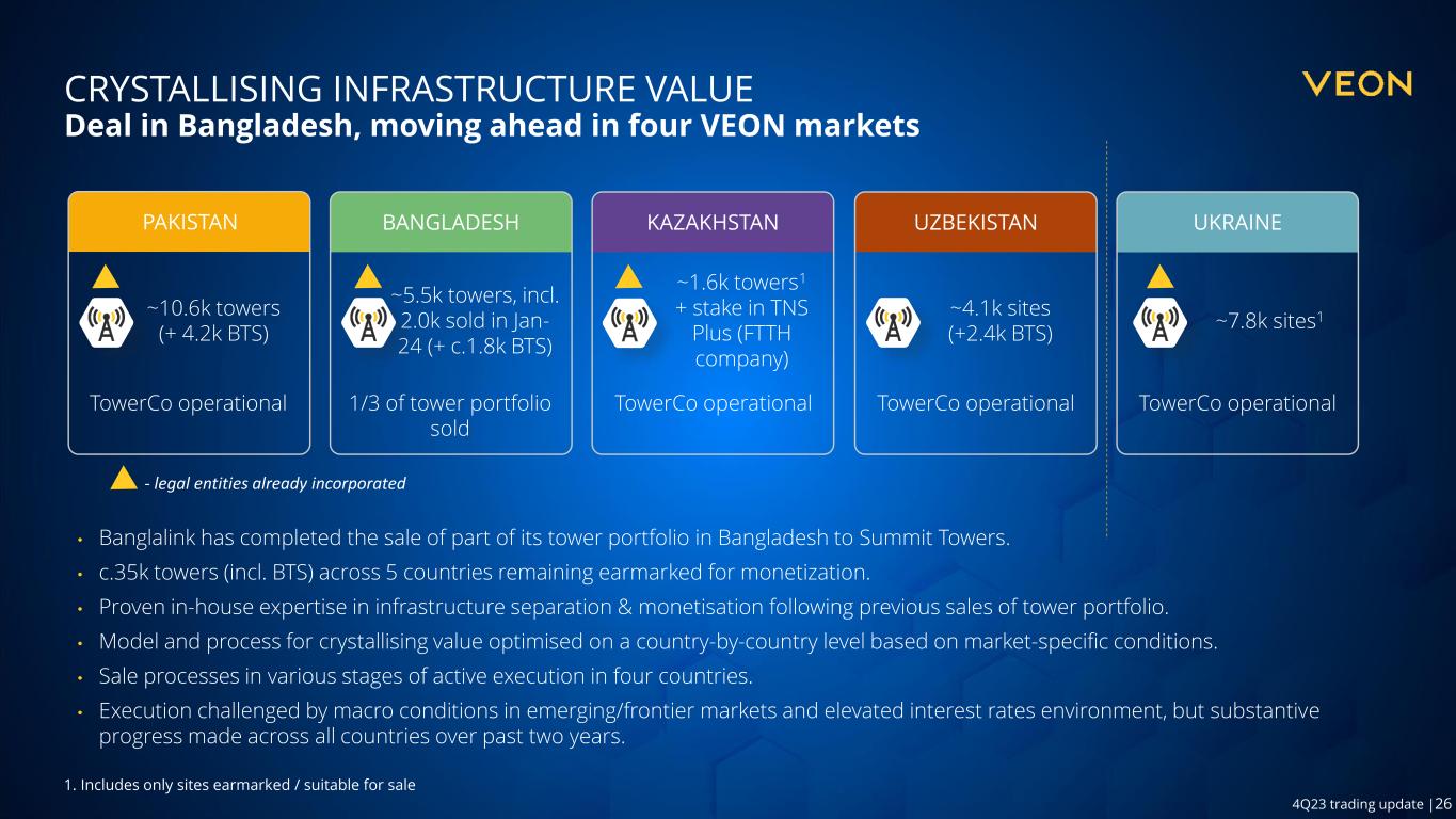 3 4Q23交易更新| 3除非另有说明,否则免责声明人VEON的业绩和本列报中列报的其他财务信息是根据国际财务报告准则(“IFRS”)编制的,未经外部审查和审计。本演示文稿中包含的财务信息是初步的,基于一些受到固有不确定性影响并可能发生变化的假设。此处提供的财务信息基于内部管理账户,由管理层负责,并受制于尚未完成且未经审计、审查或核实的财务结算程序。本列报中出现的某些数额和百分比已作四舍五入调整。因此,显示为总数的某些数字数字,包括表格中的数字,可能不是它们前面或后面的数字的精确算术汇总。尽管我们认为这些信息是合理的,但实际结果可能与上述信息有所不同,这种变化可能是重大的。因此,您不应过分依赖这些信息。这些信息可能并不代表当前期间或任何未来期间的实际结果。本演示文稿包含“前瞻性陈述”,这一短语在经修订的1933年美国证券法第27A条和经修订的1934年美国证券交易法第21E条中定义。这些前瞻性陈述可以用“可能”、“可能”、“将”、“可能”、“将”、“应该”、“预期”、“计划”、“预期”、“打算”、“寻求”、“相信”、“估计”、“预测”、“潜在”、“继续”、“考虑”、“可能”等类似词语来识别。前瞻性陈述包括与(其中包括)VEON实施其战略优先事项的计划有关的陈述,包括运营模式和发展计划;预期业绩,包括VEON产生充足现金流的能力;VEON对乌克兰战争影响的评估,包括相关的制裁和反制裁,对其当前和未来的运营和财务状况产生的影响;未来的市场发展和趋势;运营和网络发展以及网络投资,包括对5G/4G/LTE网络的推出和收益的预期,如适用;频谱收购和更新;额外频谱的收购对客户体验的影响;VEON在预期的时间范围内实现对其任何业务和资产的收购和处置以及执行其战略交易的能力,或根本没有;VEON实现财务改善的能力,包括在成功完成某些处置和收购后预期净备考杠杆率会降低;我们的股息;以及TERM0在其不同运营国家实现其目标和商业举措的能力。本演示文稿中包含的前瞻性陈述是基于管理层对VEON的战略和财务状况以及未来市场状况、趋势和其他潜在发展的最佳评估。这些讨论涉及风险和不确定性。由于以下原因,实际结果可能与这些声明存在重大差异:除其他外,围绕俄罗斯和乌克兰的冲突进一步升级,包括进一步的制裁和反制裁以及我们乌克兰业务的任何相关非自愿取消合并;对VEON产品和服务的需求和市场接受度;我们关于股息支付和政策的计划,以及我们获得股息、分配、贷款的能力,我们子公司的转账或其他付款或担保;VEON市场的经济持续波动;电信行业的政府监管;VEON市场的一般政治不确定性;政府调查或其他监管行动;与第三方或监管机构的诉讼或纠纷或有关这些方的其他负面发展;影响贸易和投资的出口管制和法律对我们和重要的第三方供应商采购货物能力的影响,我们向客户提供的服务所需的软件或技术;与我们在财务报告内部控制方面的重大弱点相关的风险;与数据保护或网络安全相关的风险、各方无法控制的其他风险或未能达到有关各种战略优先事项的预期、外汇波动的影响, VEON经营所在市场的竞争加剧以及消费税对VEON服务消费者购买活动的影响。可能导致实际结果与任何前瞻性陈述中讨论的结果存在重大差异的某些其他因素包括VEON于2023年7月24日向美国证券交易委员会(“SEC”)提交的截至2022年12月31日止年度的20-F表格年度报告中描述的风险因素以及VEON不时向SEC提交的其他公开文件中描述的风险因素。其他未知或不可预测的因素也可能损害我们未来的业绩。新的风险因素和不确定性不时出现,我们的管理层无法预测所有风险因素和不确定性,我们也无法评估所有因素对我们业务的影响或任何因素或因素组合可能导致实际结果与任何前瞻性陈述中包含的结果存在重大差异的程度。在任何情况下,本演示文稿中包含此类前瞻性陈述都不应被视为我们或任何其他人对实现此类陈述中所列结果的陈述或保证,或所使用的基本假设实际上将是这种情况。因此,请注意不要过分依赖这些前瞻性陈述。这些前瞻性陈述仅在本文发布之日发表。我们无法向你保证,任何预计的结果或事件都会实现。除法律要求的范围外,我们不承担任何义务更新或修改任何这些前瞻性陈述,无论是由于新信息、未来事件或其他原因,在做出陈述之日之后,或反映意外事件的发生。该演示文稿还包括信用评级机构的评级。评级不是买入、卖出或持有证券的建议,随时可能被修正或撤回。此外,本演示文稿的要素包含或可能包含《市场滥用监管(EU)第596/2014号》定义的“内幕信息”。