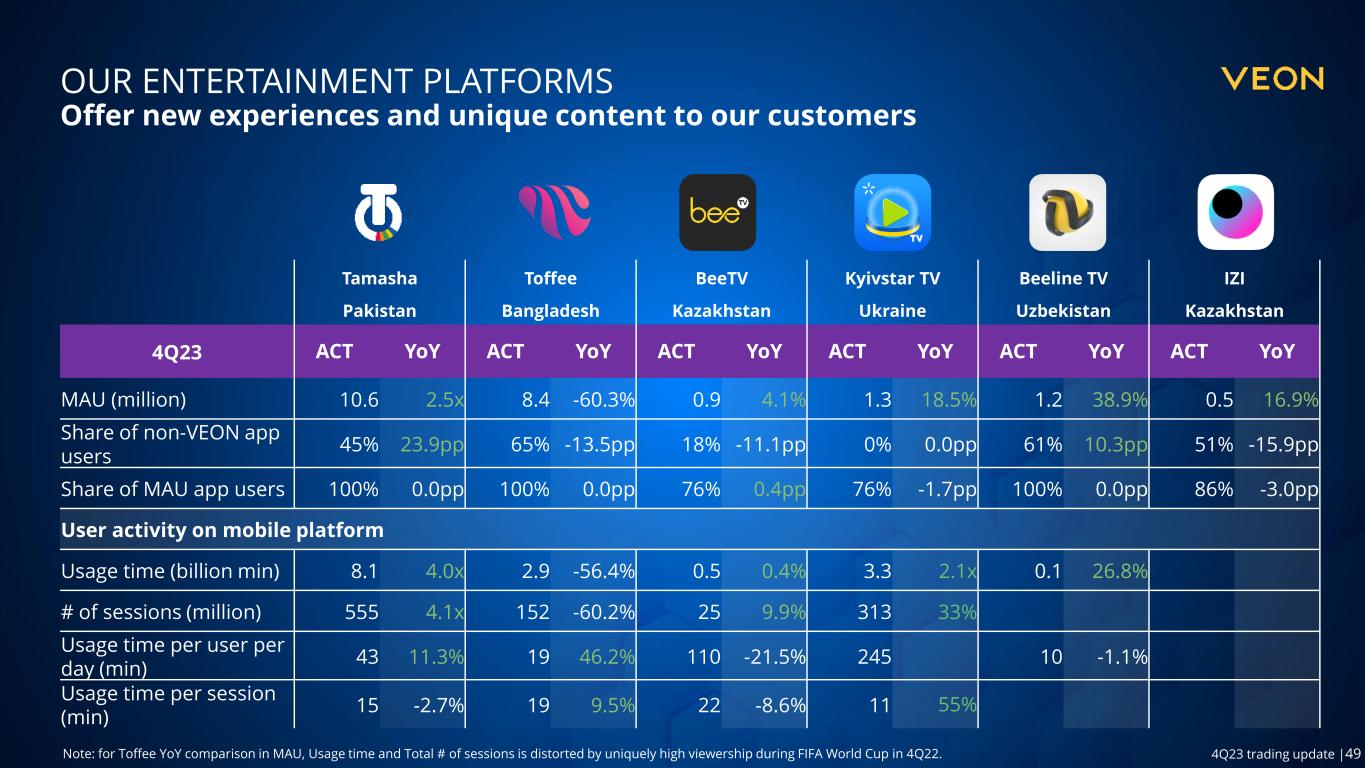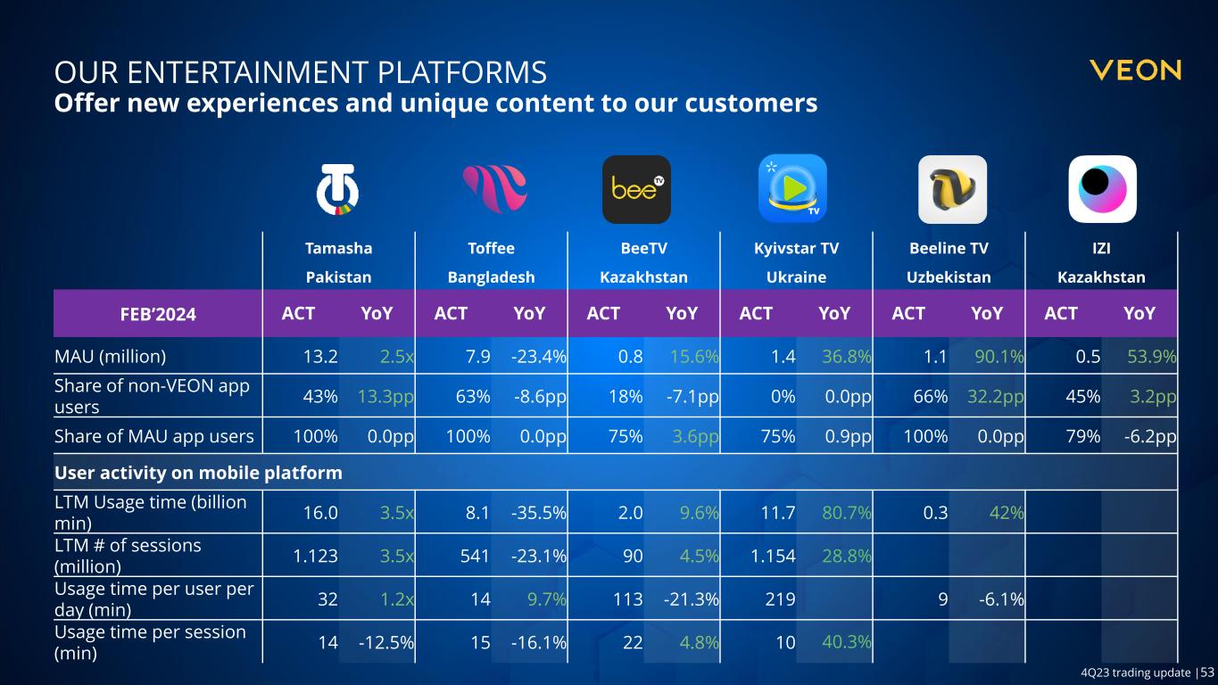 53 4Q23交易更新| 53我们的娱乐平台提供新体验和为客户提供的独特内容Tamasha Toffee BeETV Kyivstar TV Beeline TV IZI巴基斯坦孟加拉国哈萨克斯坦乌克兰乌兹别克斯坦哈萨克斯坦FEB'2024 ACT YoY ACT YoY ACT YoY ACT YoY ACT YoY ACT YoY ACT YoY ACT MAU(百万)13.2 2.5x 7.9-23.4 % 0.8 15.6% 1.4 36.8% 1.19 0.1% 0.55 3.9%非VEON应用用户份额43% 13.3pp 63%-8.6pp 18 %-7.1pp 0% 0.0pp 66% 32.2pp 45% 3.2pp MAU应用用户份额100% 0.0pp 100% 0.0pp 75% 3.6pp 75% 0.9pp 100% 0.0pp 79%-6.2pp移动平台用户活跃度LTM使用时间(十亿min)16.03.5x 8.1-35.5 % 2.09.6% 11.78 0.7% 0.3会话42% LTM #(百万)1.12 33.5x541-23.1 % 904.5% 1.15 428.8%每用户每日使用时长(min)32 1.2x149.7% 113-21.3 % 2199-6.1 %每会话使用时长(min)14-12.5 % 15-16.1 % 224.8% 1040.3%