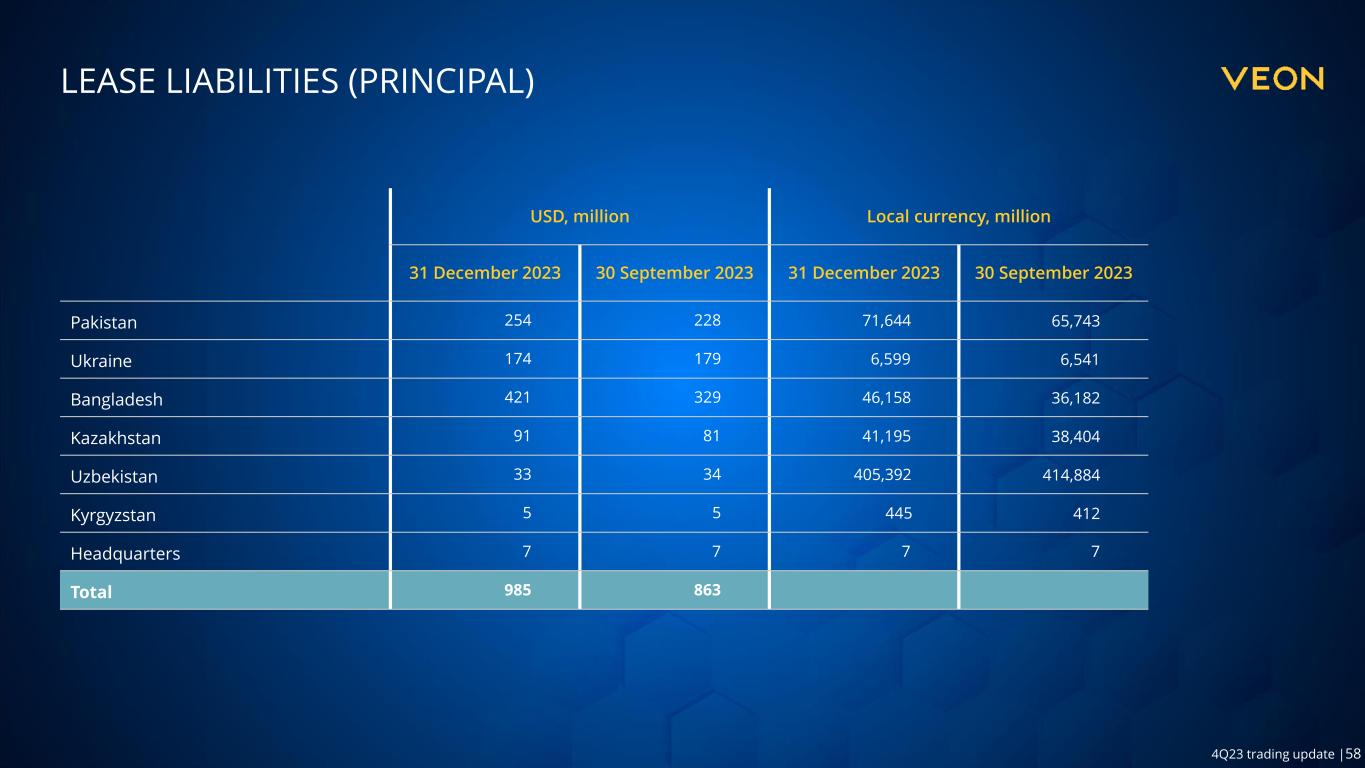 58 4Q23交易更新| 58租赁负债(本金)美元,百万当地货币,2023年12月31日2023年9月30日2023年12月31日2023年9月30日巴基斯坦25422871,64465,743乌克兰1741796,5996,541孟加拉国42132946,15836,182哈萨克斯坦918141,19538,404乌兹别克斯坦3334405,392414,884吉尔吉斯斯坦55445412总部7777合计985863