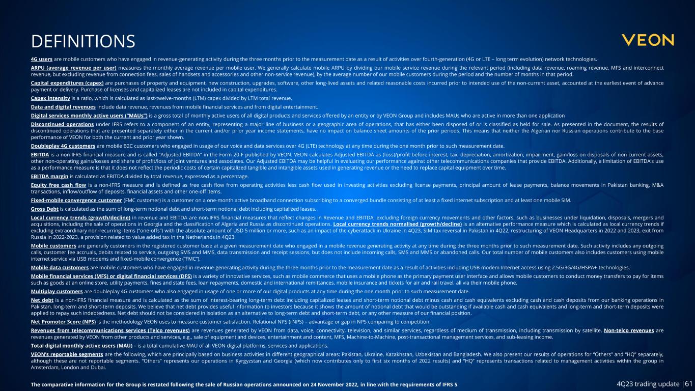 61 4Q23交易更新| 61定义4G用户是由于对第四代(4G或LTE –长期演进)网络技术的活动而在计量日期前三个月内从事创收活动的移动客户。ARPU(每用户平均收入)衡量的是每个移动用户的月平均收入。我们一般计算移动ARPU的方法是,将我们在相关期间的移动服务收入(包括数据收入、漫游收入、MFS和互连收入,但不包括连接费收入、手机和配件销售收入以及其他非服务收入)除以我们在该期间的平均移动客户数量和该期间的月数。资本支出(capex)是指购买物业和设备、新建、升级、软件、其他长期资产以及在非流动资产预定用途之前发生的相关合理成本,在预付款或交付的最早事件中核算。购买许可证和资本化租赁不包括在资本支出中。资本支出强度是一个比率,计算方法为过去十二个月(LTM)资本支出除以LTM总收入。数据和数字收入包括数据收入、移动金融服务收入和数字娱乐收入。数字服务月度活跃用户(“MAU”)是一个实体或VEON集团提供的所有数字产品和服务的月度活跃用户总数,包括活跃于多个应用程序的MAU。国际财务报告准则下的终止经营是指代表主要业务线或经营地理区域的实体的一个组成部分,该组成部分已被处置或归类为持有待售。如文件所示,在本年度和/或上一年度损益表中单独列报的已终止经营业务的结果对以往各期的资产负债表金额没有影响。这意味着,阿尔及利亚和俄罗斯的行动都没有为所显示的本年度和上年度的VEON基数业绩做出贡献。DoublePlay 4G客户是指在该计量日期前一个月的任何时间通过4G(LTE)技术参与使用我们的语音和数据服务的移动B2C客户。EBITDA是一种非国际财务报告准则的财务指标,在VEON发布的20-F表格中被称为“调整后EBITDA”。VEON将调整后EBITDA计算为(亏损)/扣除利息、税项、折旧、摊销、减值、非流动资产处置损益、其他非经营性损益以及应占合营企业和联营企业损益前的利润。我们的调整后EBITDA可能有助于评估我们与其他提供EBITDA的电信公司的业绩。此外,使用EBITDA作为业绩衡量标准的一个限制是,它没有反映用于产生收入的某些资本化有形和无形资产的定期成本或随着时间的推移更换资本设备的需要。EBITDA利润率的计算方法是EBITDA除以总收入,以百分比表示。股权自由现金流是一种非国际财务报告准则计量,定义为经营活动产生的自由现金流减投资活动使用的现金流,不包括许可付款、租赁付款本金、巴基斯坦银行业的余额变动、并购交易、存款流入/流出、金融资产和其他一次性项目。固定移动融合客户(FMC客户)是指订阅至少由一个固定互联网订阅和至少一个移动SIM卡组成的融合捆绑包的一个月活跃宽带连接的客户。总债务计算为长期名义债务和包括资本化租赁在内的短期名义债务之和。收入和EBITDA的当地货币趋势(增长/下降)是反映收入和EBITDA变化的非国际财务报告准则财务指标,不包括外币变动和其他因素,例如清算、处置、合并和收购中的业务,包括出售格鲁吉亚的业务以及将阿尔及利亚和俄罗斯归类为已终止业务。当地货币趋势正常化(增长/下降)是一种替代绩效衡量标准,如果排除绝对金额在500万美元或以上的非常非经常性项目(“一次性”),则按当地货币趋势计算,例如4Q23在乌克兰的网络攻击的影响,4Q22在巴基斯坦的SIM税收逆转,2022和2023年重组VEON总部,2022-2023年退出俄罗斯,4Q23在荷兰的增值税相关拨备。移动客户一般是在给定计量日期的注册客户群中,在该计量日期前三个月的任何时间从事移动创收活动的客户。这类活动包括任何外呼电话, 客户费用应计、与服务、外发短信和彩信、数据传输和接收会话相关的借记,但不包括来电、短信和彩信或放弃的电话。我们的移动客户总数还包括通过USB调制解调器和固定移动融合(“FMC”)使用移动互联网服务的客户。移动数据客户是指在计量日期前三个月内因使用2.5G/3g/4G/HSPA +技术进行包括USB调制解调器互联网接入在内的活动而从事创收活动的移动客户。移动金融服务(MFS)或数字金融服务(DFS)是一种多种多样的创新服务,例如以手机为主要支付用户界面的移动商务,允许移动客户通过手机进行汇款,以支付在线商店的商品、公用事业费用、罚款和国家费用、偿还贷款、国内和国际汇款、移动保险以及航空和铁路旅行的机票等项目,所有这些都可以通过手机进行。Multiplay客户是doubleplay 4G客户,他们在该计量日期前一个月的任何时间也参与使用我们的一种或多种数字产品。净债务是一种非国际财务报告准则的财务计量,计算方法为包括资本化租赁和短期名义债务在内的有息长期债务减去现金和现金等价物的总和,不包括我们在巴基斯坦的银行业务的现金和现金存款、长期和短期存款。我们认为,净债务为投资者提供了有用的信息,因为它显示了如果使用可用现金和现金等价物以及长期和短期存款来偿还此类债务,将未偿还的名义债务的数量。不应孤立地将净债务视为长期债务和短期债务的替代方案,或任何其他衡量我们财务状况的指标。净推荐值(NPS)是VEON用来衡量客户满意度的方法。关系NPS(rNPS)– NPS中与竞争对手相比的优势或差距。电信服务收入(Telco收入)是VEON从数据、语音、连接、电视和类似服务中产生的收入,不分传输媒介,包括卫星传输。非电信业务收入是VEON从其他产品和服务产生的收入,例如,销售设备和设备、娱乐和内容、MFS