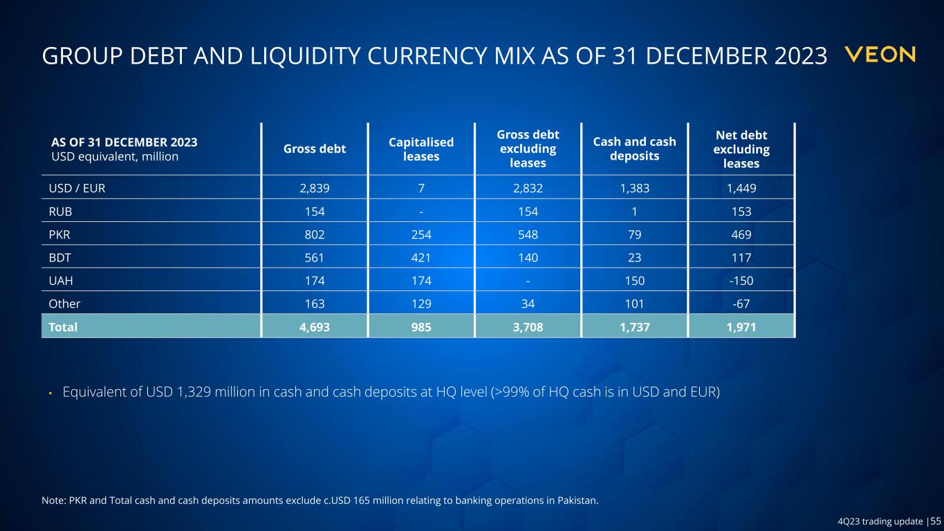 55 4Q23交易更新| 55 •相当于13.29亿美元的现金和总部一级的现金存款(> 99%的总部现金是美元和欧元)截至2023年12月31日的集团债务和流动性货币组合注:PK和现金和现金存款总额不包括与巴基斯坦银行业务有关的约1.65亿美元。截至2023年12月31日,百万总债务资本化租赁不包括租赁的总债务现金和现金存款不包括租赁的净债务美元/欧元2,83972,8321,3831,449卢布154-1541153 PKR 802225454879469 BDT 56142114023117 UAH 174174-150-150其他16312934101-67合计4,6939853,7081,7371,971