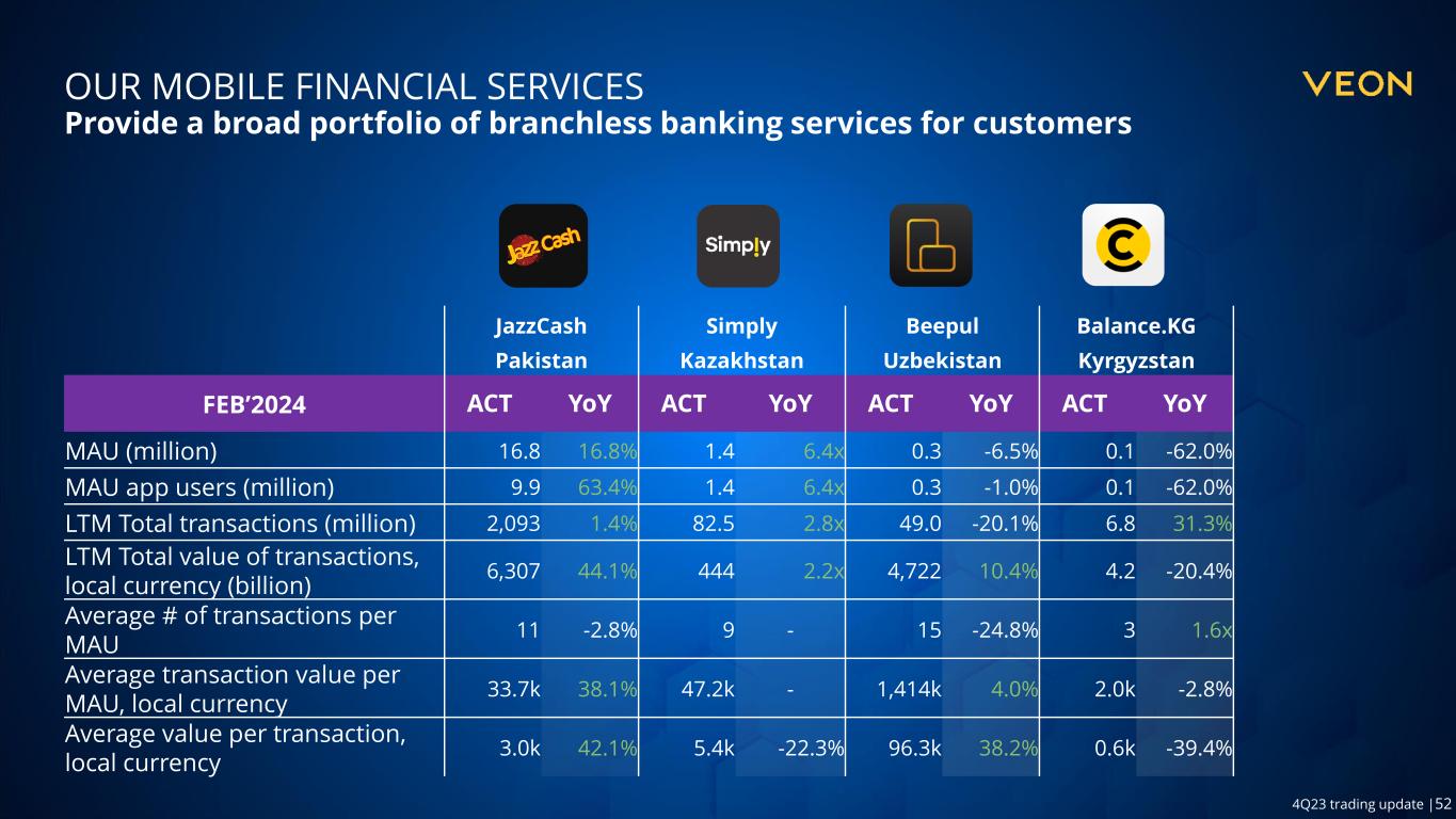 52 4Q23交易更新| 52我们的移动金融服务为客户JazzCash Simply Beepul Balance.KG巴基斯坦哈萨克斯坦乌兹别克斯坦吉尔吉斯斯坦FEB'2024法案YoY法案YoY法案YoY法案YoY MAU(百万)16.8 16.8% 1.46.4x 0.3-6.5 % 0.1-62.0 % MAU app用户(百万)9.96 3.4% 1.46.4x 0.3-1.0 % 0.1-62.0 % LTM总交易(百万)2,0931.4% 82.5 2.8x49.0-20.1 % 6.83 1.3% LTM交易总价值,当地货币(十亿)6,30744.1% 4442.2x 4,72210.4% 4.2-20.4 %平均每MAU交易# 11-2.8 % 9-15-24.8 % 3 1.6x平均每MAU交易价值,当地货币33.7k 38.1% 47.2k-1,414k 4.0% 2.0k-2.8 %平均每笔交易价值,当地货币3.0k 42.1% 5.4k-22.3 % 96.3k 38.2% 0.6k-39.4 %