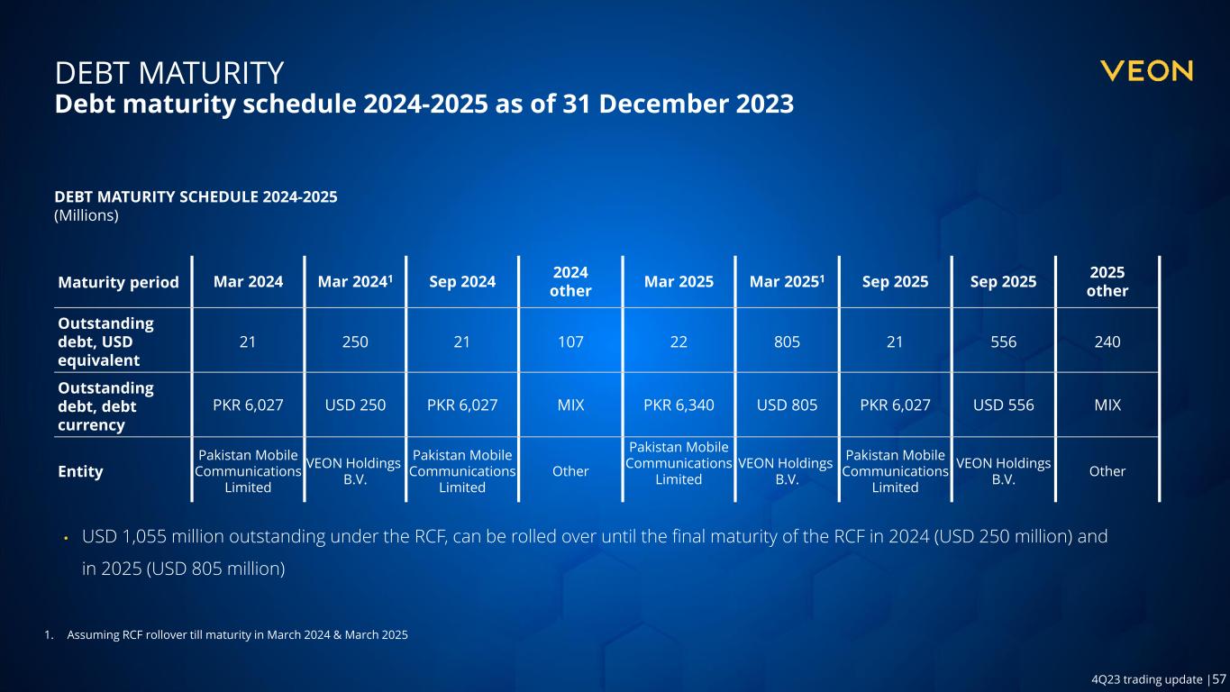 57 Q4 23交易更新| 57到期日2024年3月20241年3月20241年9月2024年其他2025年3月20251年3月20251年9月2025年9月2025年其他未偿债务,等值美元21250211072280521556240未偿债务,债务货币PKR 6,027 USD 250 PKR 6,027 MIX PKR 6,340 USD 805 PKR 6,027 USD 556 MIX Entity Pakistan Mobile Communications Limited VEON Holdings B.V. Pakistan Mobile Communications Limited Other Pakistan Mobile Communications Limited丨VEon 丨VEON Holdings B.V。其他债务到期债务到期时间表2024-2025截至2023年12月31日1。假设RCF展期至2024年3月到期& 2025年3月债务到期时间表2024-2025(百万)• RCF下未偿还的10.55亿美元,可展期至2024年(2.5亿美元)和2025年(8.05亿美元)的RCF最终到期