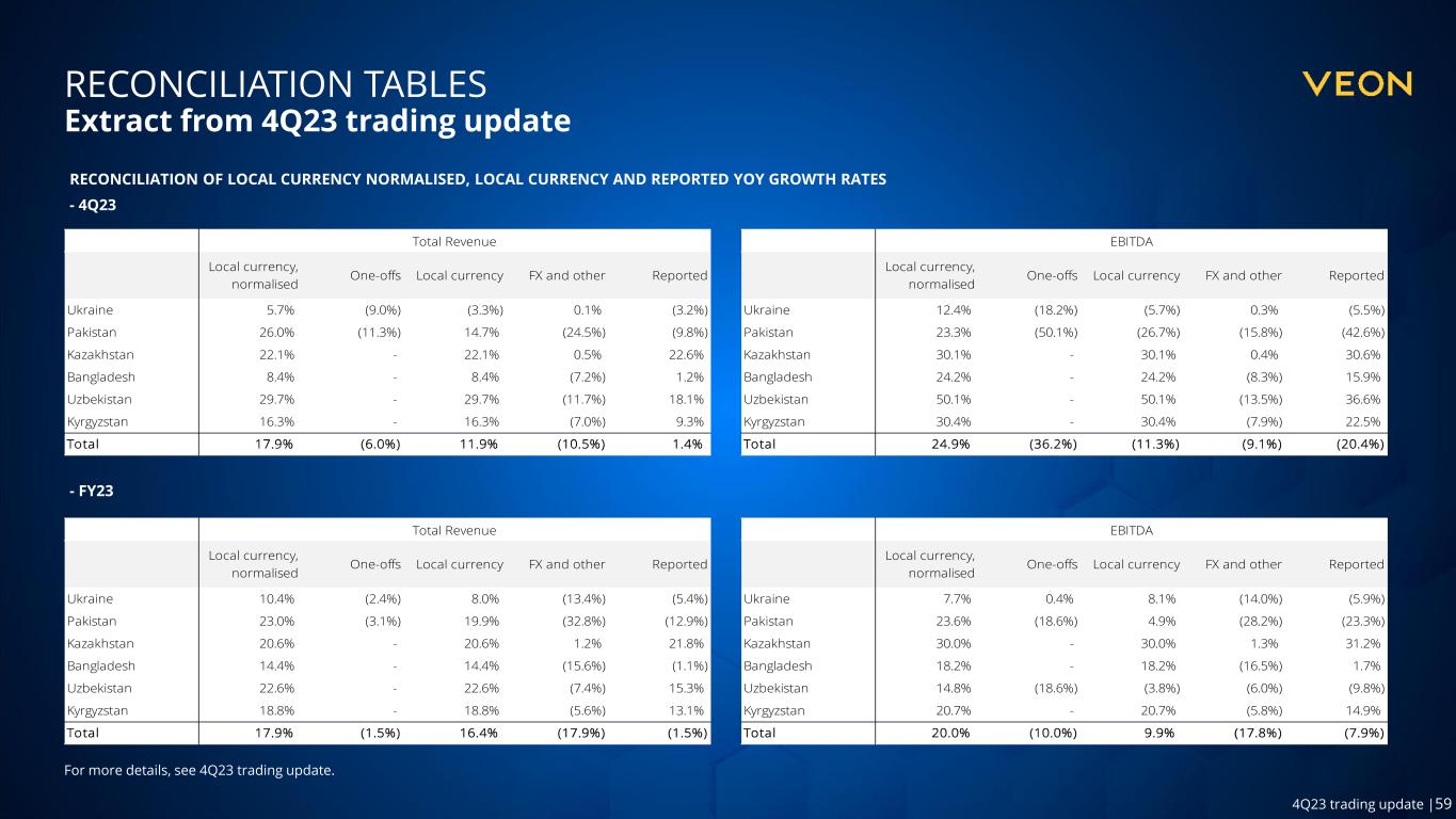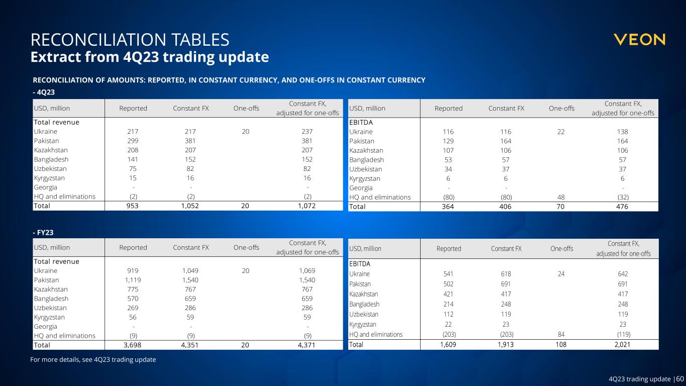 60 4Q23交易更新| 60更多详情,见4Q23交易更新调节金额:已报告,以恒定货币计算,ONE-OFF以恒定货币计算-4Q23-FY23调节表摘自4Q23交易更新美元,百万报告的固定外汇一次性固定外汇,经一次性调整总收入乌克兰21721720237巴基斯坦299381381哈萨克斯坦208207207孟加拉国141152152乌兹别克斯坦758282吉尔吉斯斯坦151616格鲁吉亚---总部和冲销(2)(2)总额9531,052201,072美元,百万报告的固定外汇一次性固定外汇,经一次性EBITDA调整后的乌克兰11611622138巴基斯坦129164164哈萨克斯坦107106106孟加拉国535757乌兹别克斯坦343737吉尔吉斯斯坦666格鲁吉亚----总部和抵销(80)(80)48(32)合计36440670476美元,百万报告不变外汇一次性不变外汇,经一次性调整总收入乌克兰9191,049201,069巴基斯坦1,1191,5401,540哈萨克斯坦775767767孟加拉国570659659乌兹别克斯坦269286286吉尔吉斯斯坦565959格鲁吉亚----总部和抵销(9)(9)合计3,6984,351204,371美元,百万报告不变外汇一次性不变外汇,经一次性EBITDA调整乌克兰54161824642巴基斯坦502691691哈萨克斯坦421417417孟加拉国214248248乌兹别克斯坦112119119吉尔吉斯斯坦222323总部和抵销(203)(203)84(119)合计1,6091,9131082,021