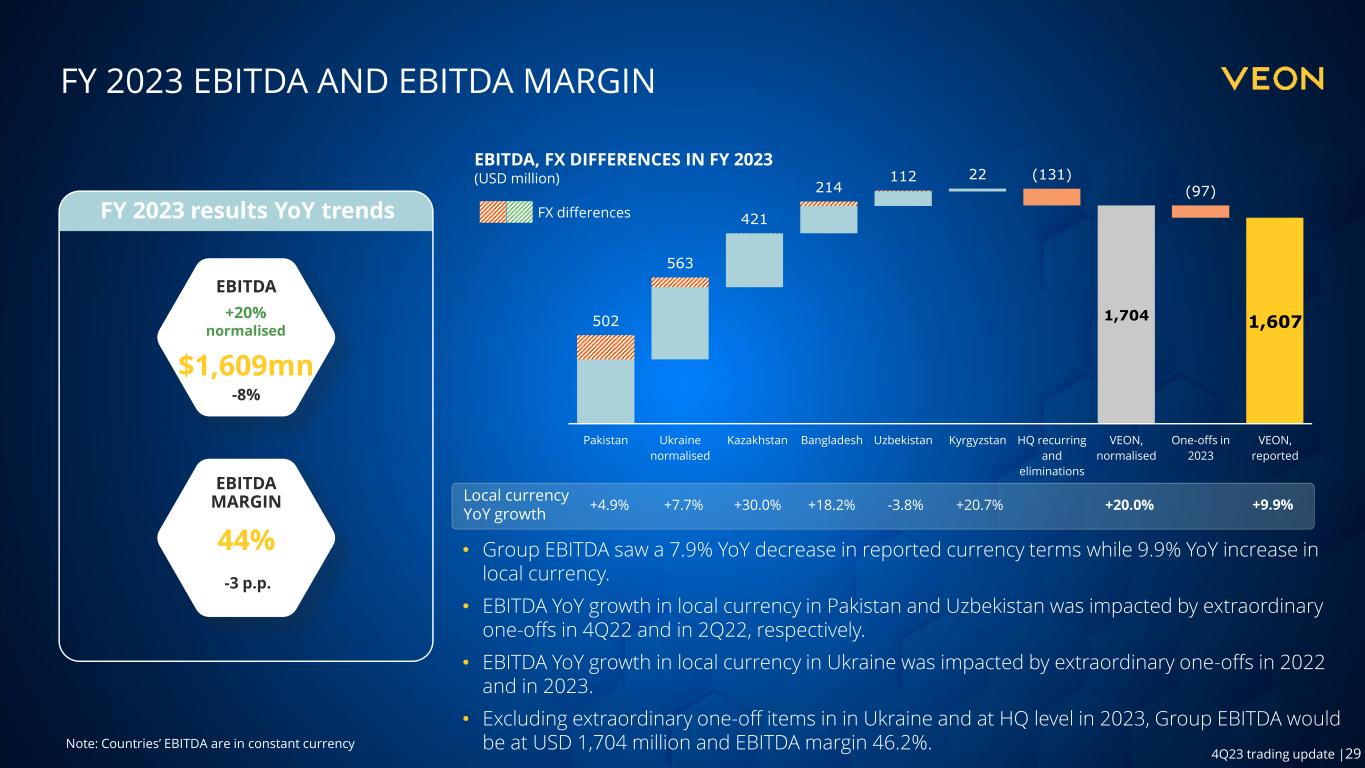 28 4Q23交易更新| 28 FY 2023REVENUES •更高的4G渗透率和所有业务的多点播放采用率支持集团两位数的当地货币收入增长•报告的集团收入增长受到巴基斯坦和孟加拉国当地货币同比大幅贬值的影响2023财年总收入同比趋势总收入36.98亿美元+ 18%正常化-2 %服务收入35.76亿美元服务收入当地货币同比增长+ 10.4% + 19.9% + 14.4% + 22.6% + 20.6% + 16.4% + 16.5% + 10.2% + 20.3% + 14.6% + 22.3% + 21.1% + 18.8% + 18.9% + 18%正常化-1 %注:各国收入以固定货币计3,6983,7181,11993977557026956(9)(正常化哈萨克斯坦孟加拉国乌兹别克斯坦吉尔吉斯斯坦总部和消除VEON,2023年正常化一次性使用VEON,报告收入+ 17.9% + 18.1%,2023财年外汇差异(百万美元)外汇差异
