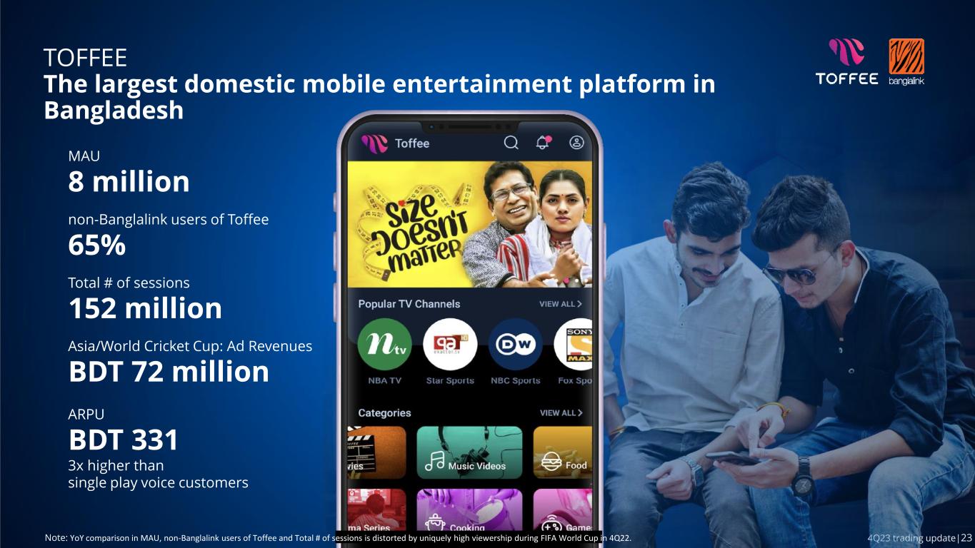 23 4Q23交易更新| 23 TOFFEE孟加拉国最大的国内移动娱乐平台MAU 800万非Banglalink用户太妃糖65%场次总数# 1.52亿亚洲/世界板球杯:广告收入BDT 7200万ARPU BDT 331比单场语音客户高3倍注:MAU、太妃糖的非Banglalink用户和场次总数#的同比比较因2022年第四季度FIFA世界杯期间独特的高收视率而失真。