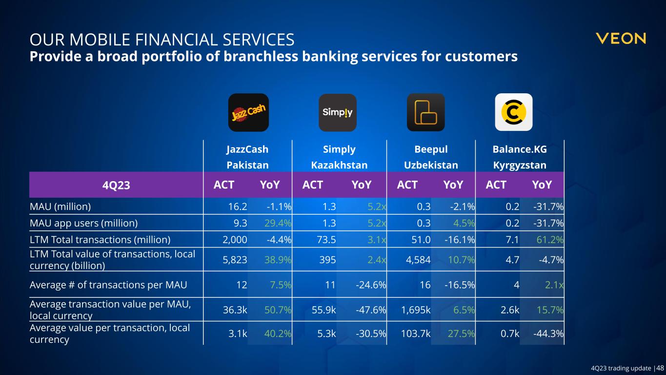 48 4Q23交易更新|我们的48个移动金融服务为客户JazzCash Simply Beepul Balance.KG巴基斯坦哈萨克斯坦乌兹别克斯坦吉尔吉斯斯坦4Q23 ACT YoY ACT YoY ACT YoY ACT YoY ACT MAU(百万)16.2-1.1 % 1.35.2x 0.3-2.1 % 0.2-31.7 % MAU app users(百万)9.32 0.4% 1.35.2x 0.3 4.5% 0.2-31.7 % LTM总交易(百万)2,000-4.4 % 73.5 3.1x 51.0-16.1 % 7.16 1.2% LTM交易总价值,当地货币(十亿)5,82338.9% 395 2.4x 4,58410.7% 4.7-4.7 %平均每MAU交易# 127.5% 11-24.6 % 16-16.5 % 42.1x平均每MAU交易价值,当地货币36.3k 50.7% 55.9k-47.6 % 1,695k 6.5% 2.6k 15.7%平均每笔交易价值,当地货币3.1k 40.2% 5.3k-30.5 % 103.7k 27.5% 0.7k-44.3 %