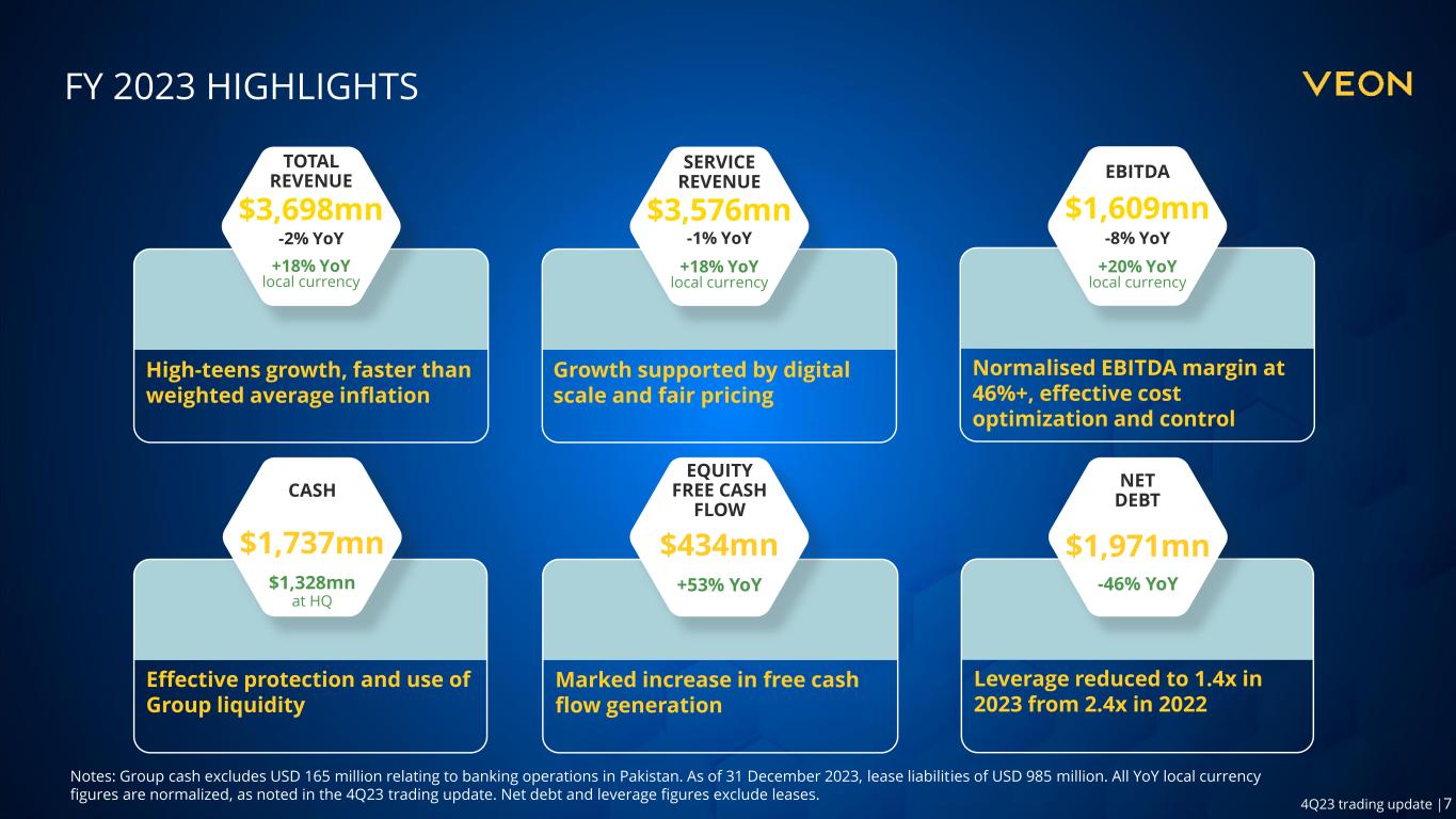 7 Q4 23交易更新| 7 FY 2023 HIGHLIGHTS正常化EBITDA利润率为46% +,有效的成本优化和控制EBITDA为16.09亿美元,同比+ 20%当地货币有效的保护和使用集团流动资金17.37亿美元现金13.28亿美元,总部高速增长,高于加权平均通胀+ 18%同比当地货币总收入-36.98亿美元-8 %同比增长由数字规模和公平定价支持+ 18%同比当地货币服务收入-35.76亿美元杠杆从2022年的2.4倍降至2023年的1.4倍19.71亿美元净债务-46 %同比标志着自由现金流产生增加4.34亿美元无股权现金流同比+ 53%注:集团现金不包括与巴基斯坦银行业务相关的1.65亿美元。截至2023年12月31日,租赁负债9.85亿美元。正如4Q23交易更新中所指出的,所有同比当地货币数据均已正常化。净债务和杠杆率数据不包括租赁。