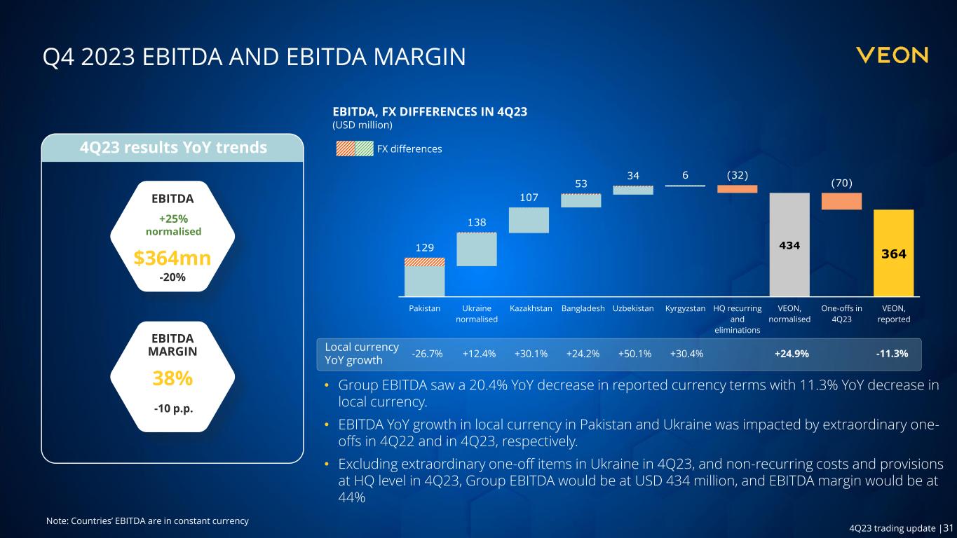30 Q4 23交易更新| 30 Q4 2023收入•所有业务的更高4G渗透率和多点播放采用率支持集团两位数的当地货币收入增长,如果正常化为非常一次性•集团报告的收入增长受到巴基斯坦当地货币同比大幅贬值的影响总收入Q4 23业绩同比趋势总收入9.53亿美元+ 18%正常化+ 1%服务收入9.15亿美元服务收入当地货币同比增长+ 5.7% + 14.7% + 8.4% + 29.7% + 22.1% + 11.9% + 11.3% + 5.5% + 13.5% + 8.6% + 28.5% + 21.9% + 16.3% + 15.9% + 17%正常化+ 1%注:各国的收入以固定货币收入计,2023年第四季度外汇差价(百万美元)外汇差价9539732992372081417515(2)(20)巴基斯坦乌克兰、正常化哈萨克斯坦孟加拉国乌兹别克斯坦吉尔吉斯斯坦总部和消除VEON、正常化2023年第四季度一次性使用VEON,报告+ 17.9% + 17.5%