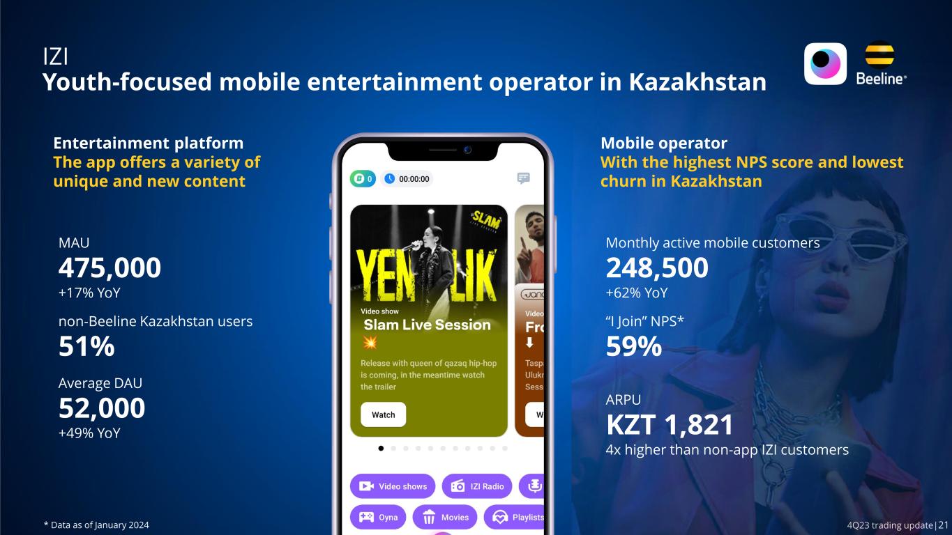 21 4Q23交易更新|哈萨克斯坦21家IZI以青年为中心的移动娱乐运营商MAU47.5万+ 17% YoY非Beeline哈萨克斯坦用户51%平均日活用户 52,000 + 49% YoY月活跃移动客户248,500 + 62% YoY“I Join”NPS * 59% ARPU KZT 1,821比非应用IZI客户高4倍娱乐平台该应用程序为哈萨克斯坦提供各种独特的新内容,拥有最高的NPS评分和最低的最低流失率的移动运营商*截至2024年1月的数据
