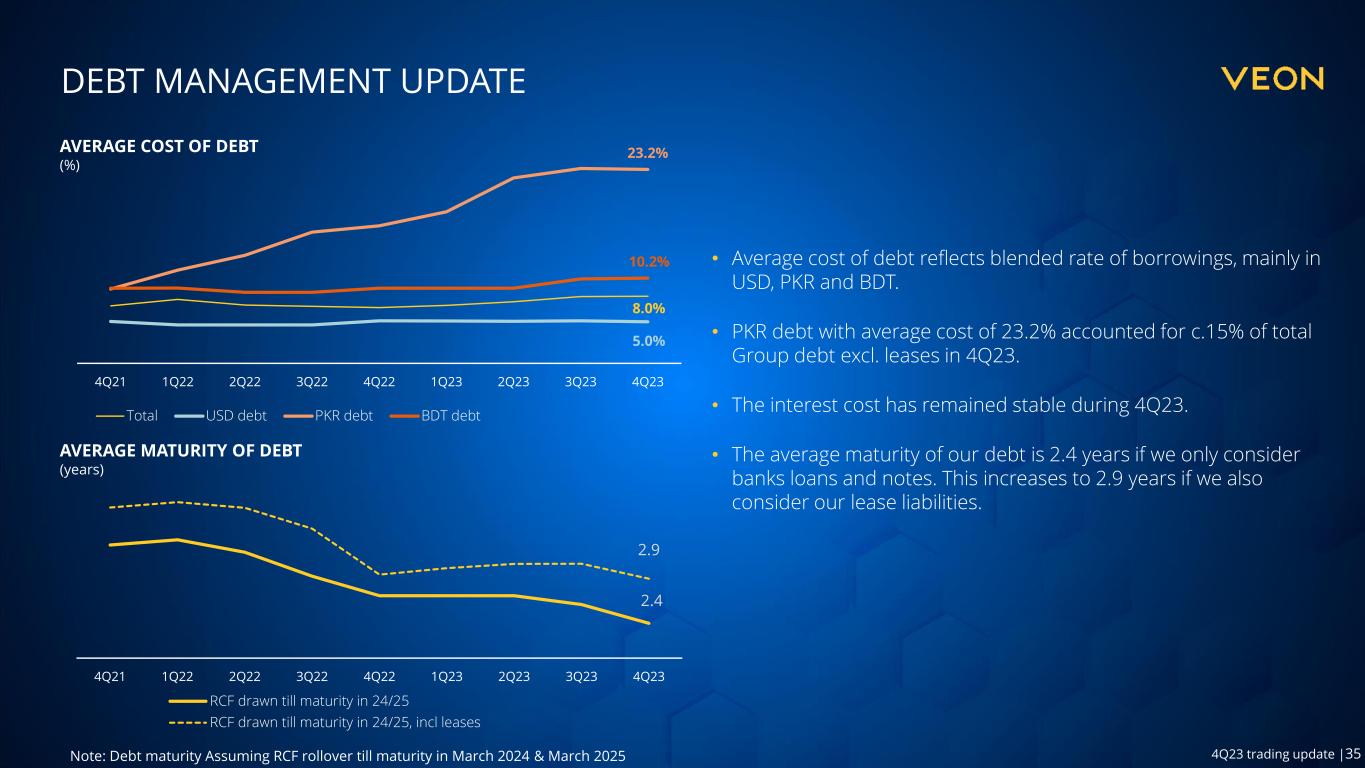 34 4Q23交易更新| 34截至2023年12月31日的债务到期情况1。截至2023年12月31日。注:现金金额不包括与巴基斯坦银行业务相关的1.65亿美元。截至2023年12月31日的债务到期时间表(十亿美元)•除现金和现金等价物总额17亿美元外,截至2023年12月31日,我们还持有1.5亿美元的长期主权债券。• 2023年10月9日,VEON完成了对俄罗斯子公司的出售。• 2023年10月13日,VEON控股到期偿还5.95%的2023年10月票据。• 6.92亿美元RCF部分于2023年10月到期,展期3个月至2024年1月。3.63亿美元RCF部分于2023年11月到期,展期3个月至2024年2月。•对于11亿美元的RCF,2.5亿美元可展期至2024年3月最终到期,8.05亿美元可展期至2025年3月最终到期。0.27 1.06 0.41现金及现金等价物(十亿美元)主权债券运营公司总部(RCF)总部(其他)美元卢布PKR BDT其他RCF 0.25 0.8 10.40 1.64 0.16 1.190.24 20242024202520262027 > 202811.74 0.15