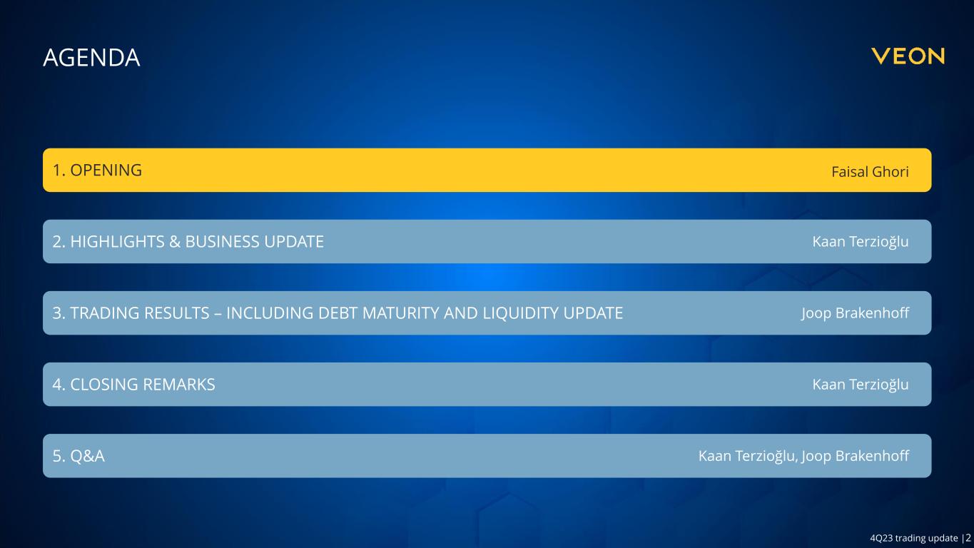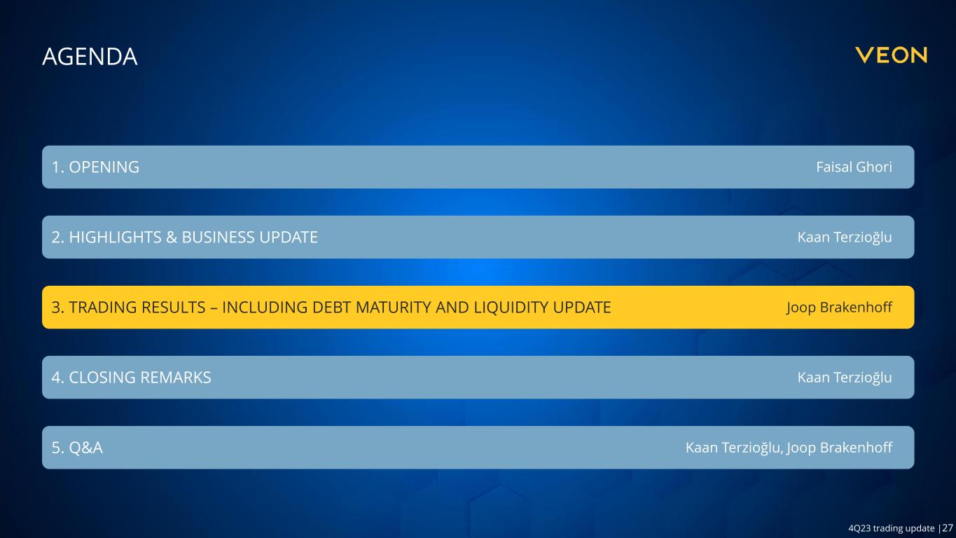 2 4Q23交易更新| 2议程1。开幕2。亮点&业务更新Faisal Ghori Kaan Terzio ğ lu 4。收盘评论Kaan Terzio ğ lu 3。交易结果–包括债务到期和流动性更新Joop Brakenhoff 5。问答Kaan Terzio ğ lu,Joop Brakenhoff