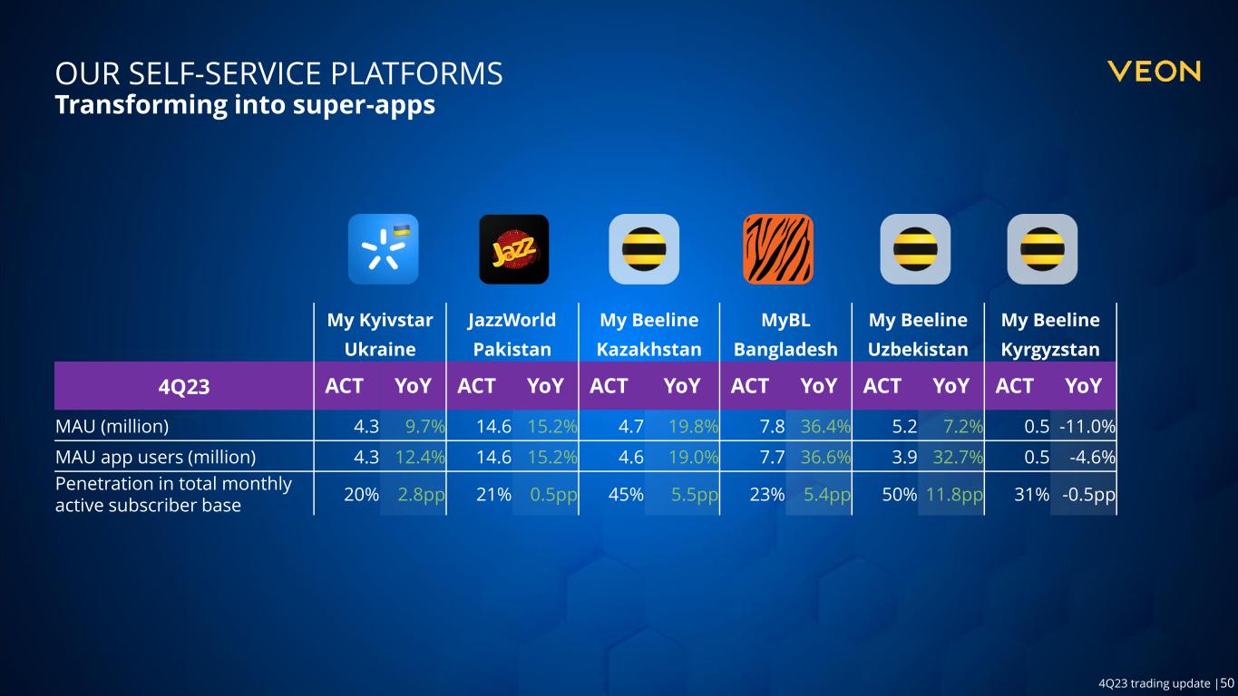 50 4Q23交易更新|我们的50个自助服务平台转型为超级应用程序我的Kyivstar JazzWorld我的Beeline MyBL我的Beeline我的Beeline乌克兰巴基斯坦哈萨克斯坦孟加拉国乌兹别克斯坦吉尔吉斯斯坦4Q23 ACT YoY ACT YoY ACT YoY ACT YoY ACT YoY ACT YoY MAU(百万)4.39.7% 14.6 15.2% 4.7 19.8% 7.8 36.4% 5.27.2% 0.5-11.0 % MAU app用户(百万)4.31 2.4% 14.6 15.2% 4.6 19.0% 7.7 36.6% 3.93 2.7% 0.5-4.6 %渗透率在总月活跃用户群20% 2.8pp 21% 0.5pp 45% 5.5pp 23% 5.4pp 50% 11.8pp 31%-0.5pp
