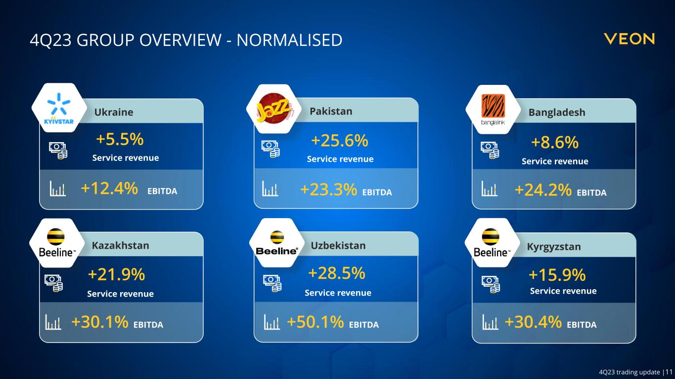 10 4Q23交易更新| 10 FY23集团概览-正常化注:收入和EBITDA正常化因素见幻灯片8 FY23和幻灯片10 for 4Q23。+ 23.7% + 23.6% EBITDA + 21.1% + 30.0% EBITDA + 14.6% + 18.2% EBITDA + 22.3% + 14.8% EBITDA + 18.9% + 20.7% EBITDA巴基斯坦哈萨克斯坦孟加拉国乌兹别克斯坦吉尔吉斯斯坦+ 7.7% EBITDA乌克兰+ 10.2%服务收入服务收入服务收入服务收入服务收入服务收入服务收入