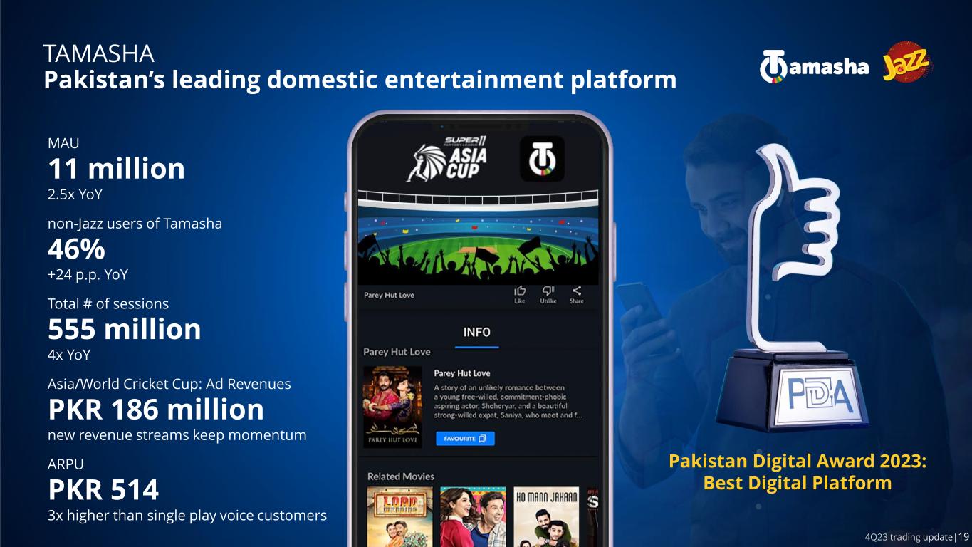 19 4Q23交易更新| 19TAMASHA巴基斯坦国内领先娱乐平台MAU 1100万2.5x YoY非爵士用户Tamasha 46% + 24 p.p. YoY总#场次5.55亿4x YoY亚洲/世界板球杯:广告收入1.86亿巴基斯坦卢比新收入流保持势头ARPU PKR 514比单场语音客户高3倍巴基斯坦数字奖2023:最佳数字平台