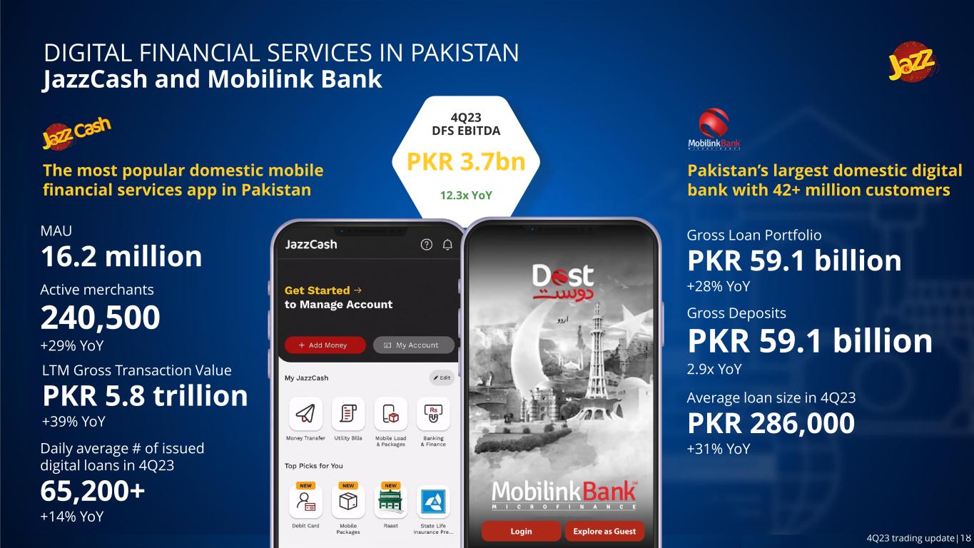 18 Q4 23交易更新| 18巴基斯坦37亿巴基斯坦卢比Q4 23 DFS EBITDA 12.3倍同比数字金融服务JazzCash和Mobilink银行巴基斯坦国内最受欢迎的移动金融服务APP巴基斯坦国内最大的数字银行,拥有42 +百万客户总贷款组合591亿巴基斯坦卢比+ 28% YoY Q3平均贷款规模286,000巴基斯坦卢比+ 31%总存款591亿巴基斯坦卢比2.9倍YoY MAU1620万活跃商户240,500 + 29% YoY Q4已发放数字贷款日均# 65,200 + + 14% YoY LTM总交易额5.8万亿巴基斯坦卢比+ 39% YoY